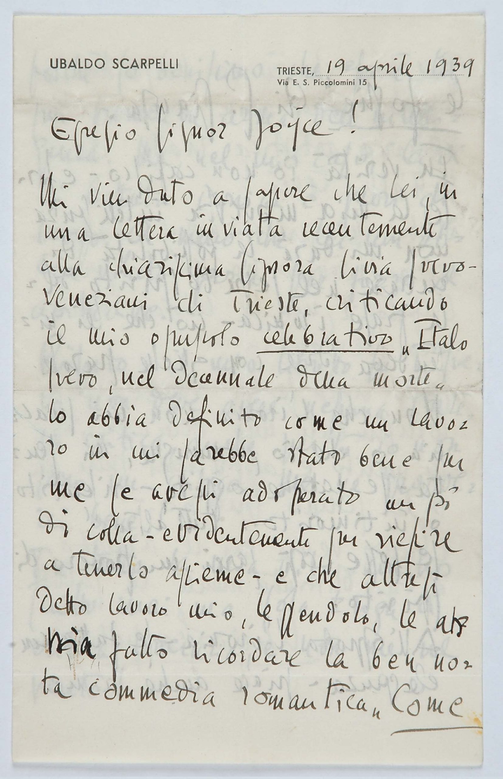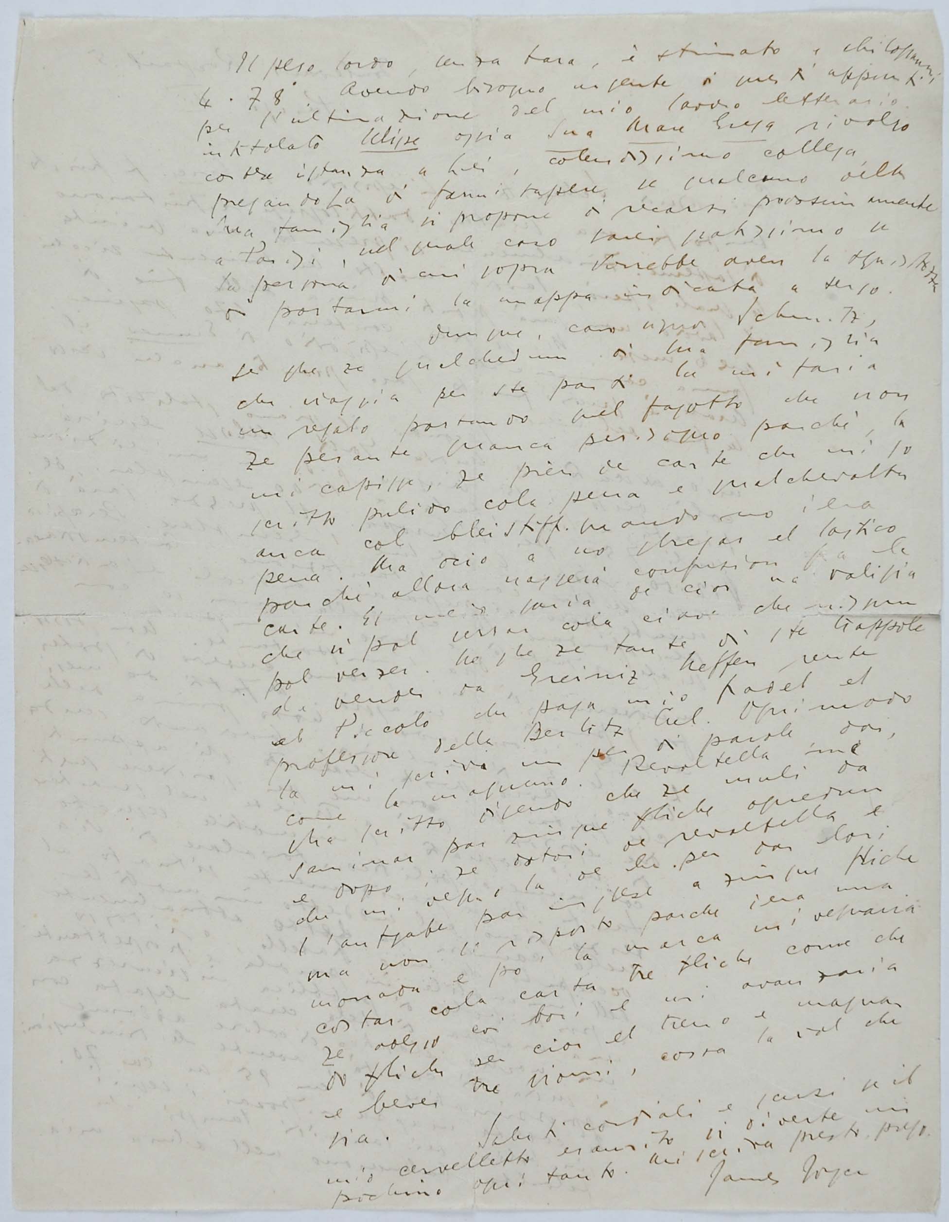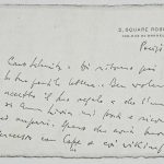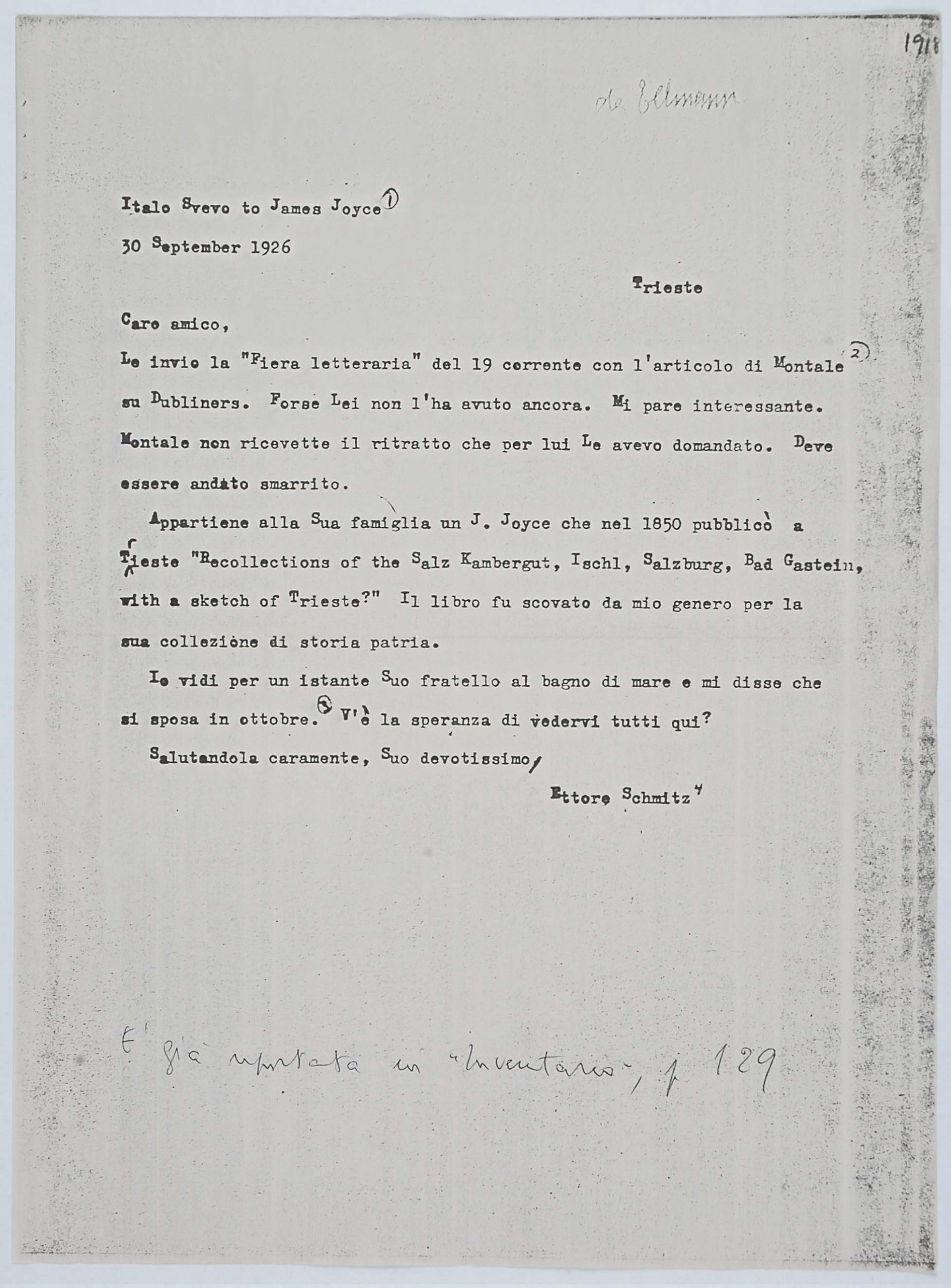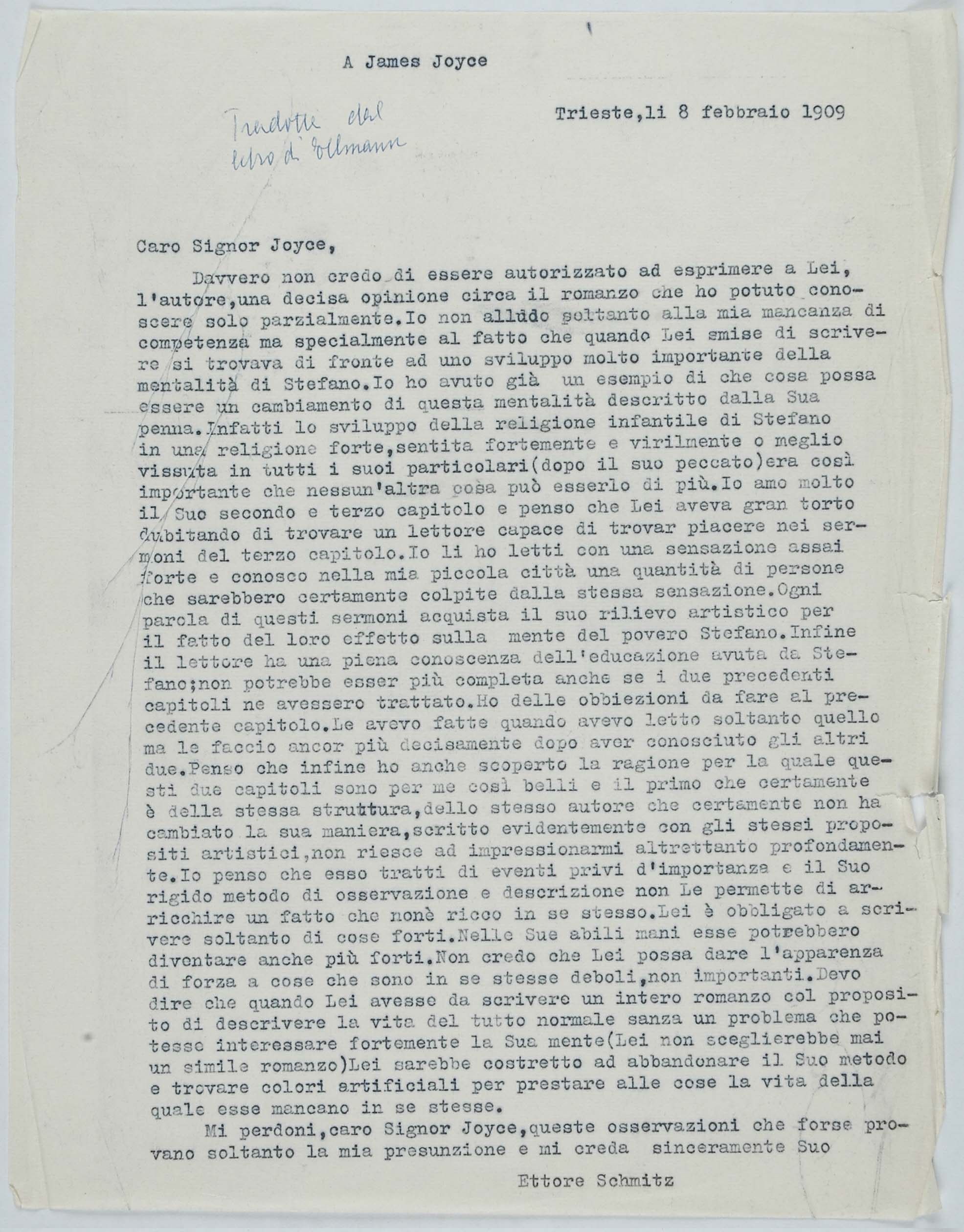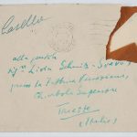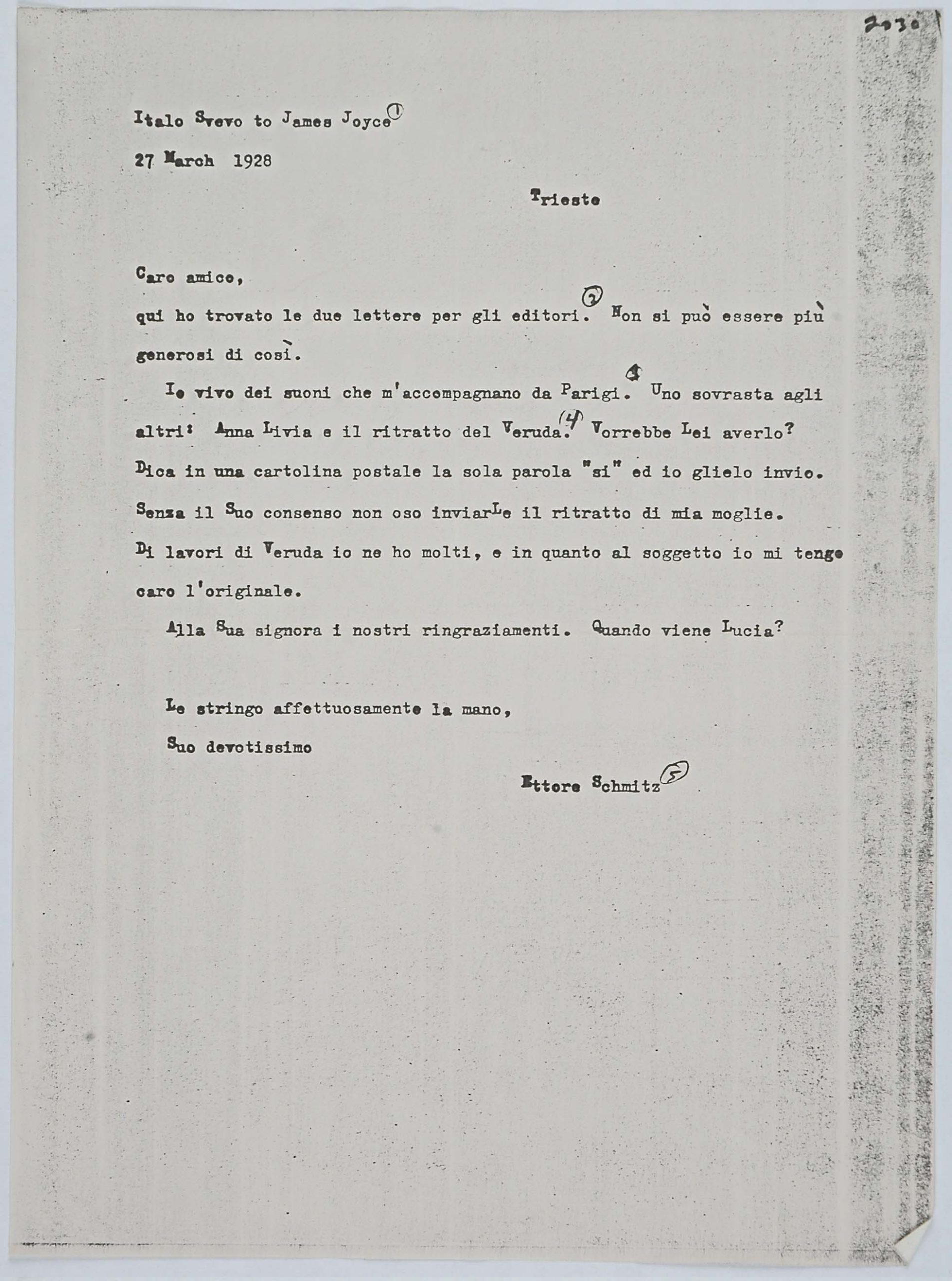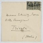 Il faldone con la segnatura archivistica Museo Sveviano FS Corr. A 57 contiene il carteggio tra Italo Svevo e James Joyce, o meglio il professor Zois. I due scrittori si conoscono infatti a Trieste nel 1907, quando Svevo si rivolge all’allora docente di lingua inglese presso la Berlitz School per apprendere la lingua. Inizia così una lunga amicizia, produttiva da un punto di vista intellettuale, come racconta in un’intervista a Sergio Falcone la figlia di Svevo, Letizia: