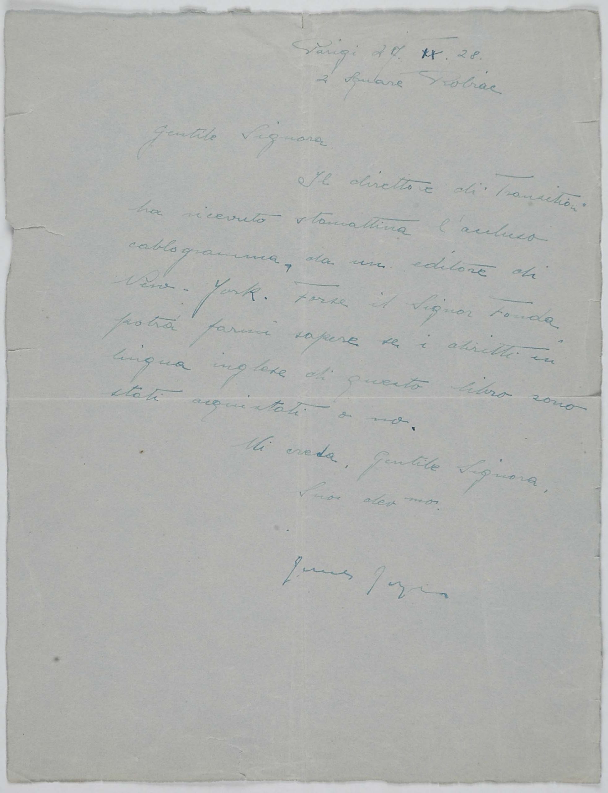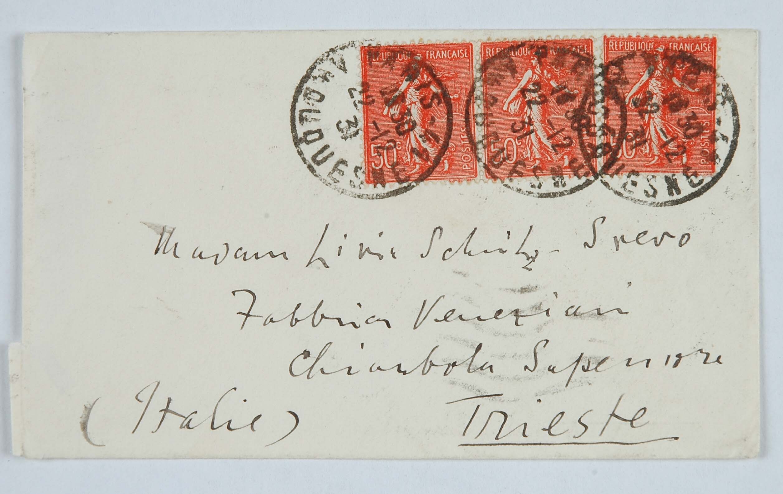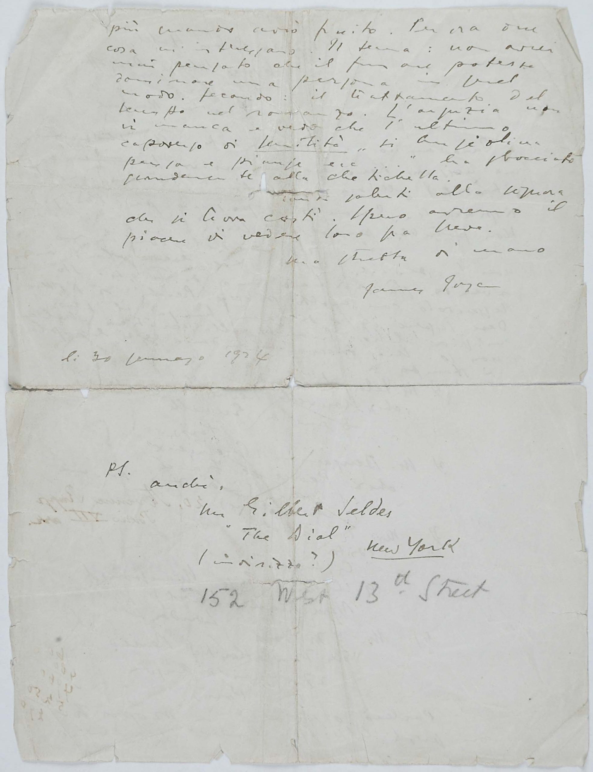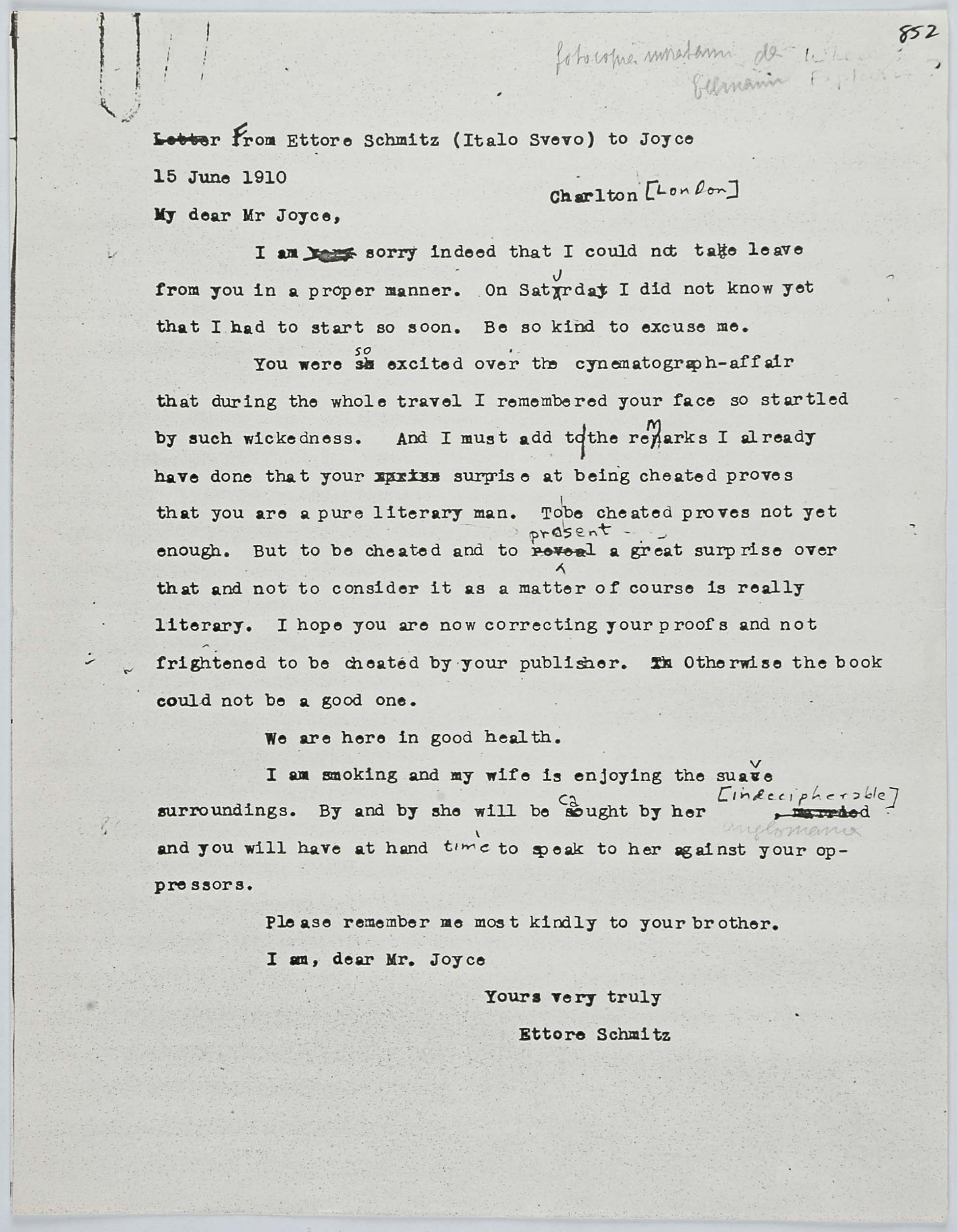 Il faldone con la segnatura archivistica Museo Sveviano FS Corr. A 57 contiene il carteggio tra Italo Svevo e James Joyce, o meglio il professor Zois. I due scrittori si conoscono infatti a Trieste nel 1907, quando Svevo si rivolge all’allora docente di lingua inglese presso la Berlitz School per apprendere la lingua. Inizia così una lunga amicizia, produttiva da un punto di vista intellettuale, come racconta in un’intervista a Sergio Falcone la figlia di Svevo, Letizia: