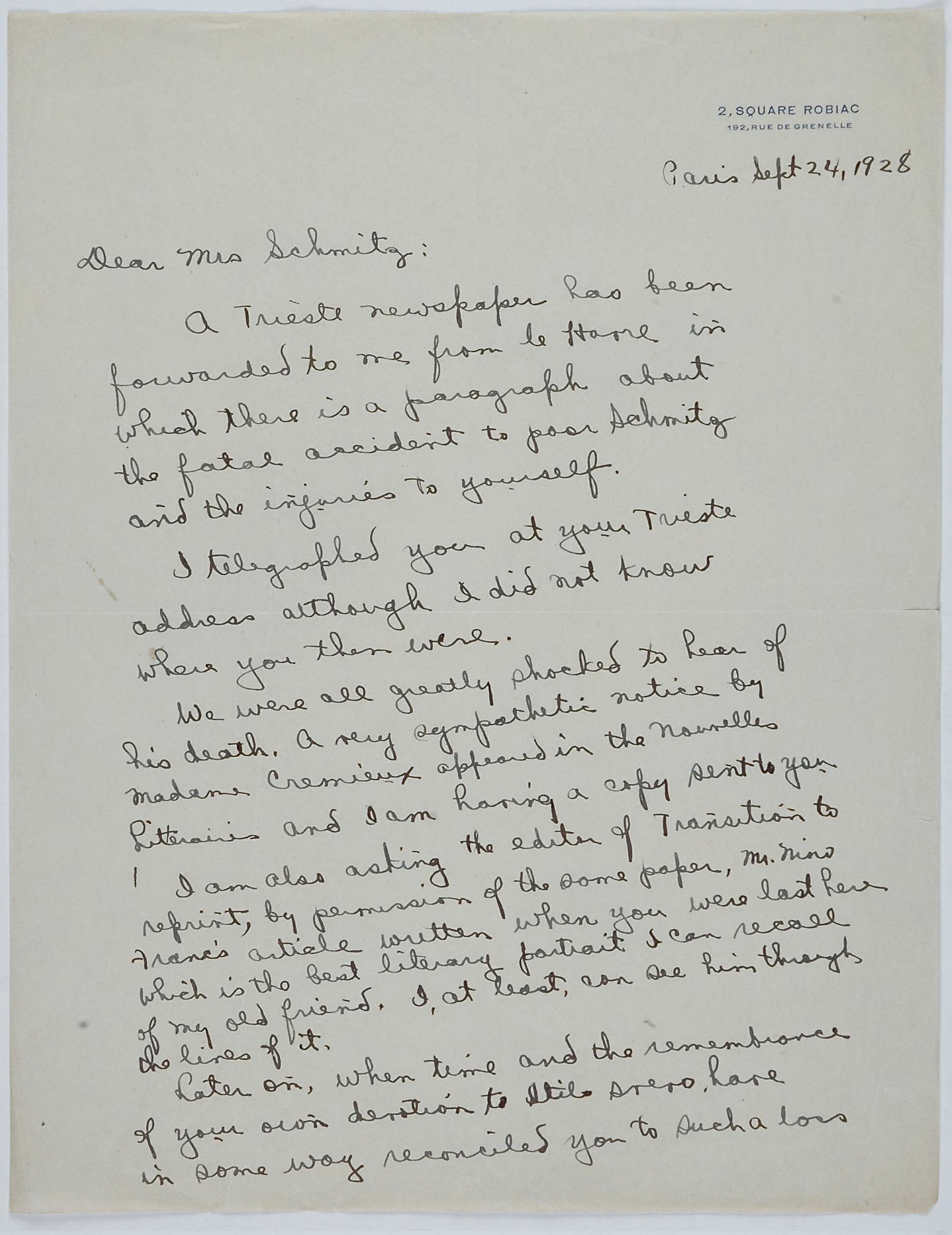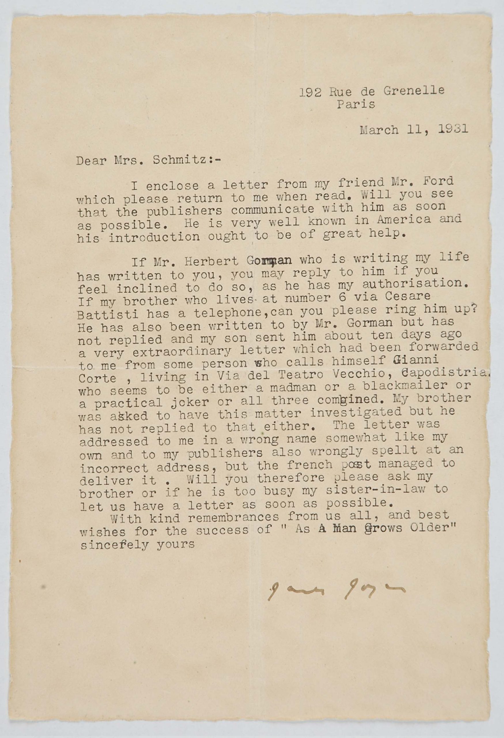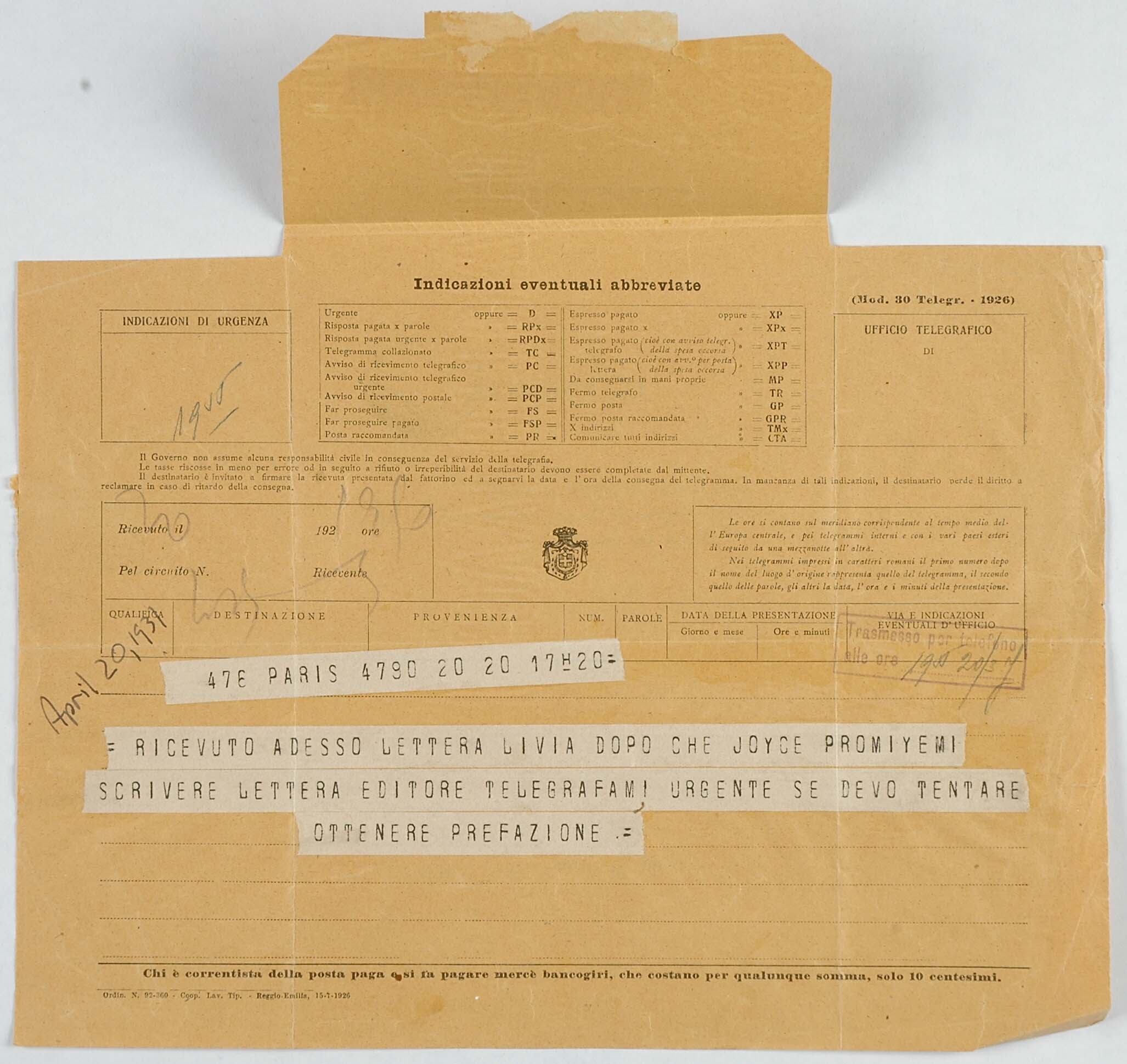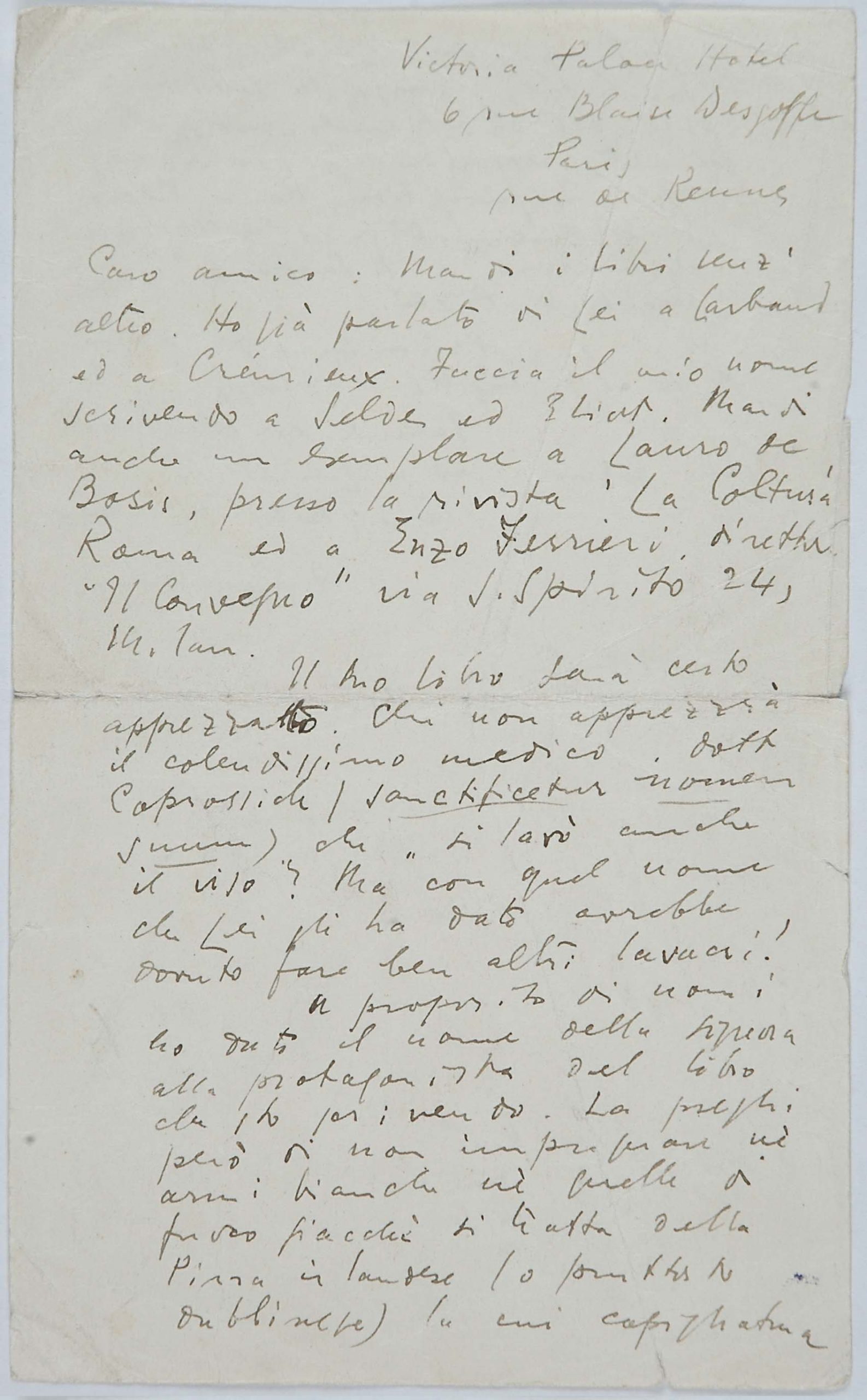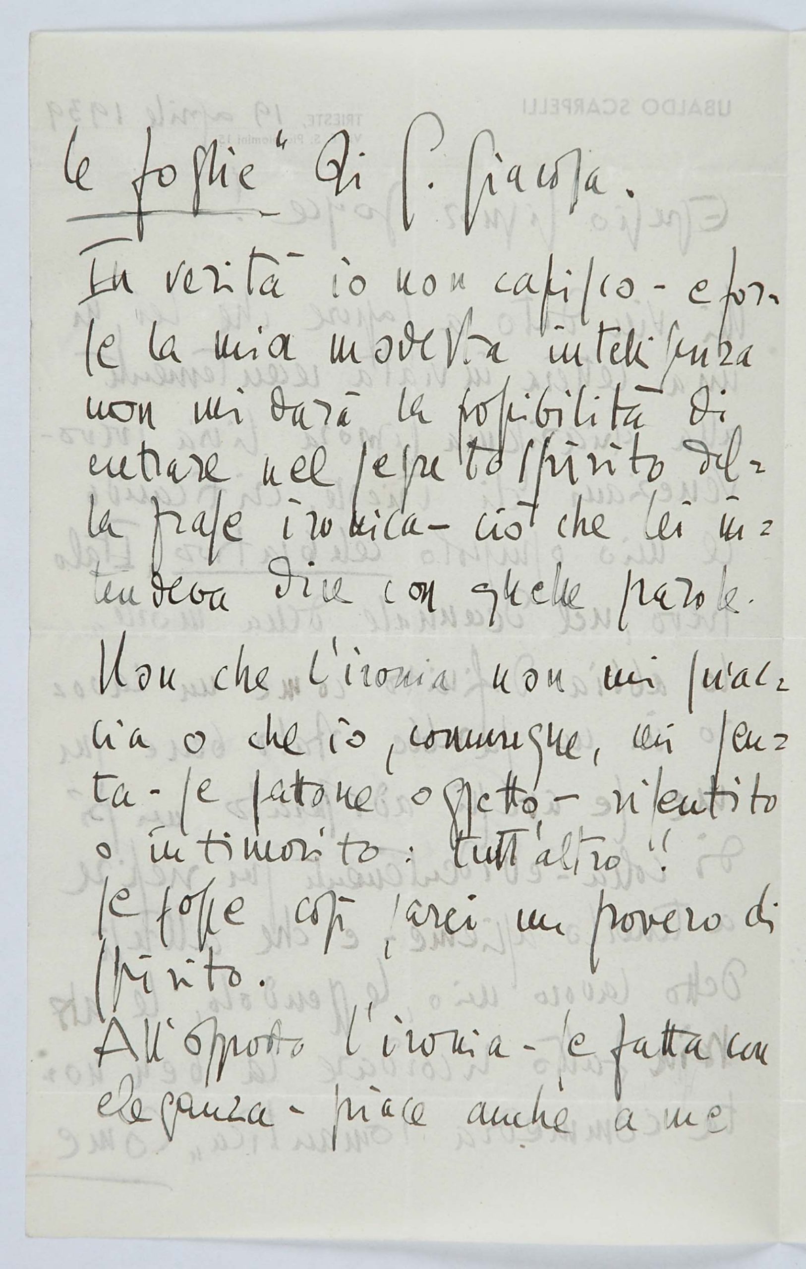 Il faldone con la segnatura archivistica Museo Sveviano FS Corr. A 57 contiene il carteggio tra Italo Svevo e James Joyce, o meglio il professor Zois. I due scrittori si conoscono infatti a Trieste nel 1907, quando Svevo si rivolge all’allora docente di lingua inglese presso la Berlitz School per apprendere la lingua. Inizia così una lunga amicizia, produttiva da un punto di vista intellettuale, come racconta in un’intervista a Sergio Falcone la figlia di Svevo, Letizia: