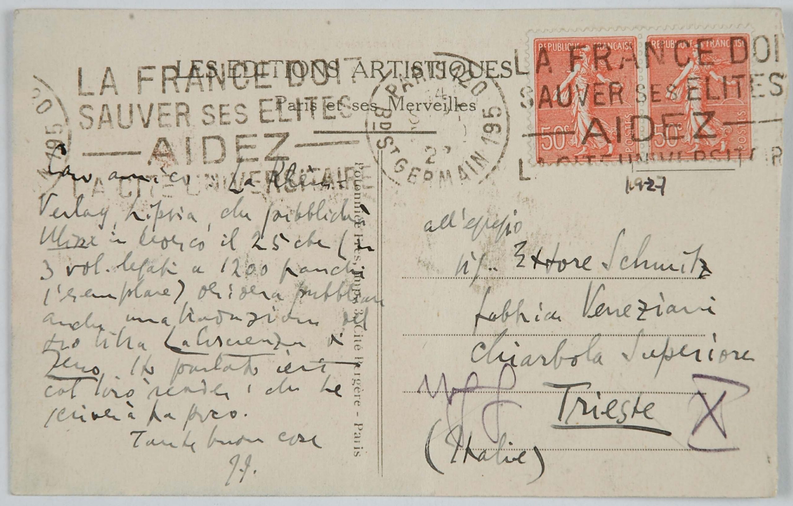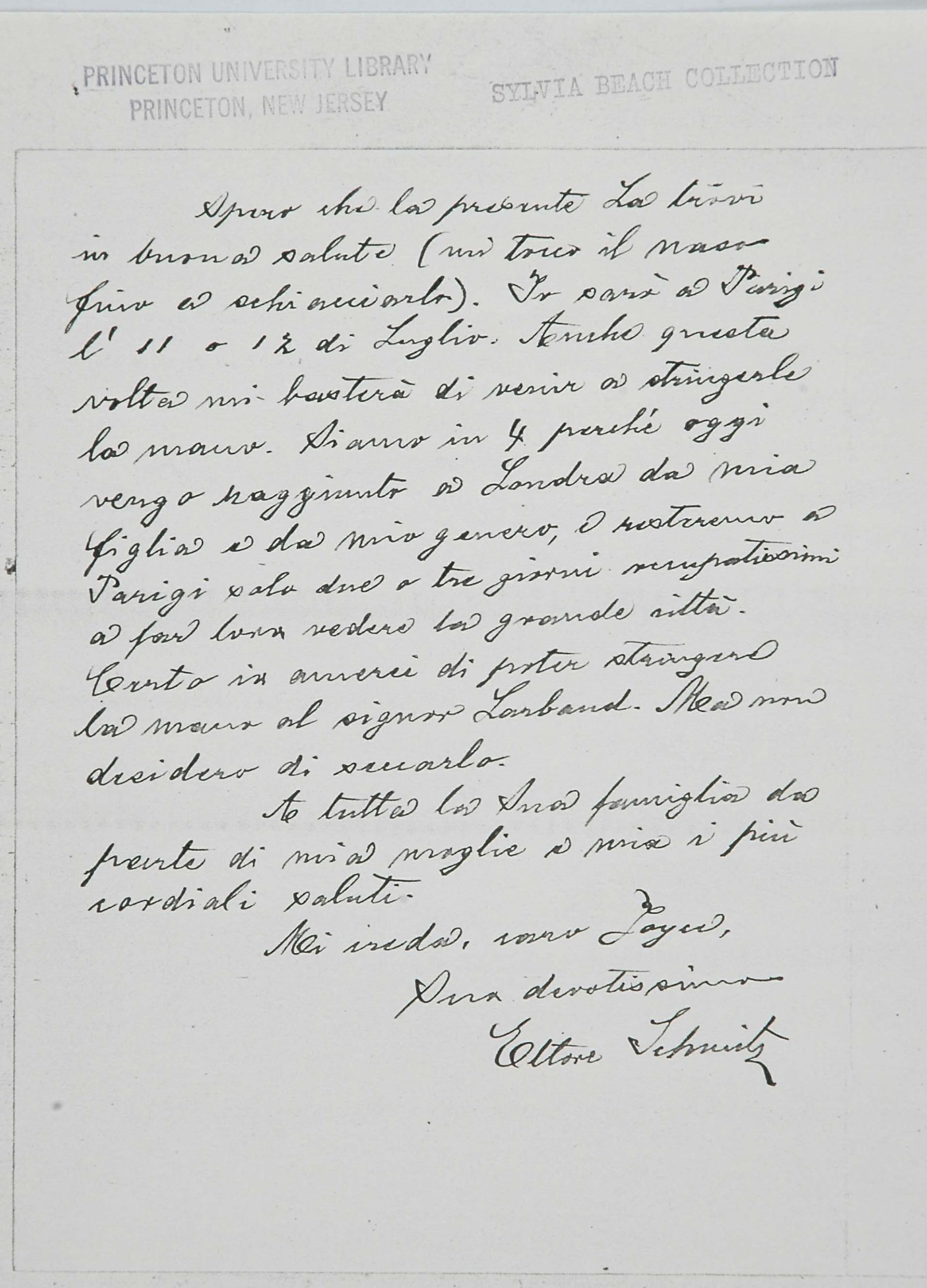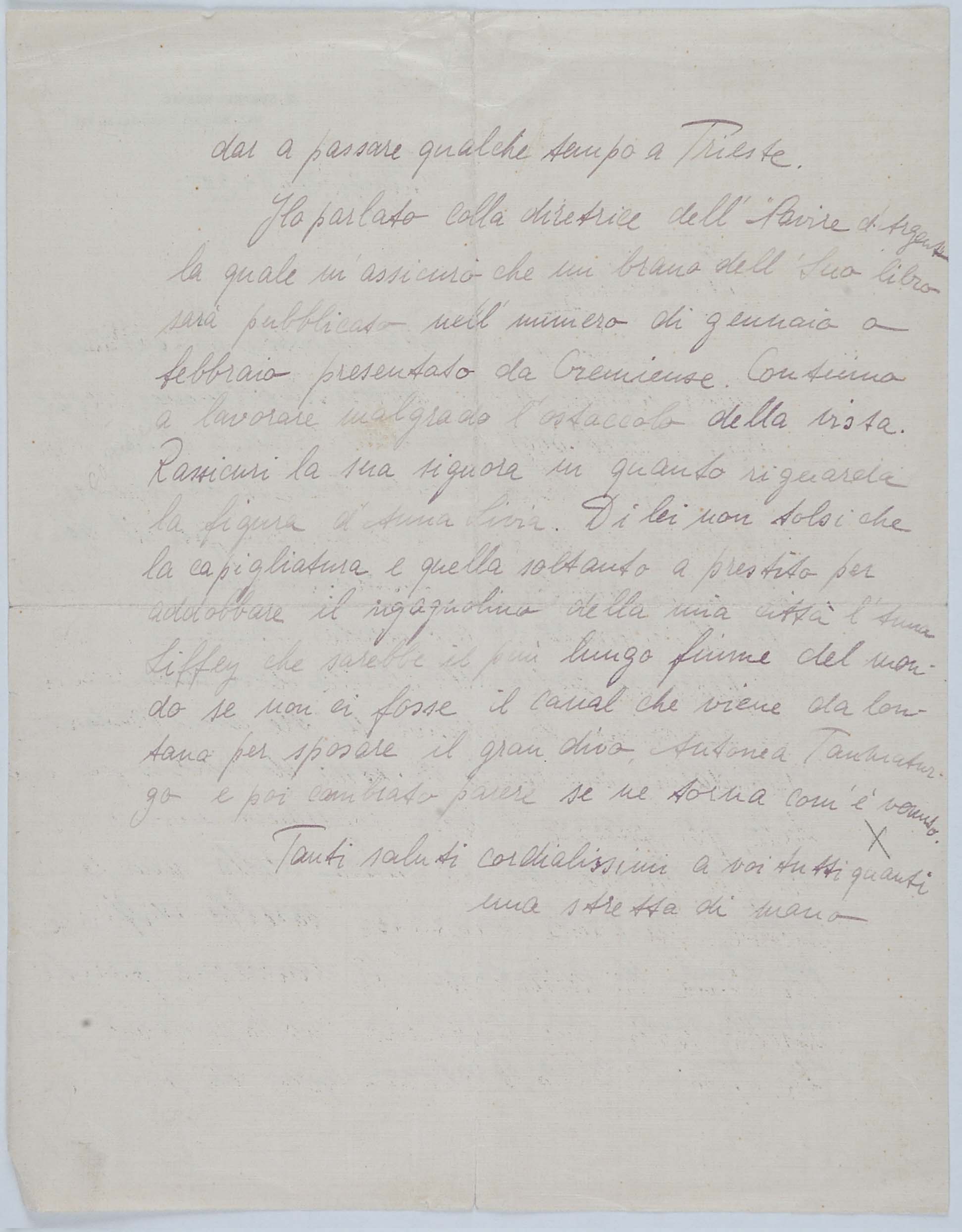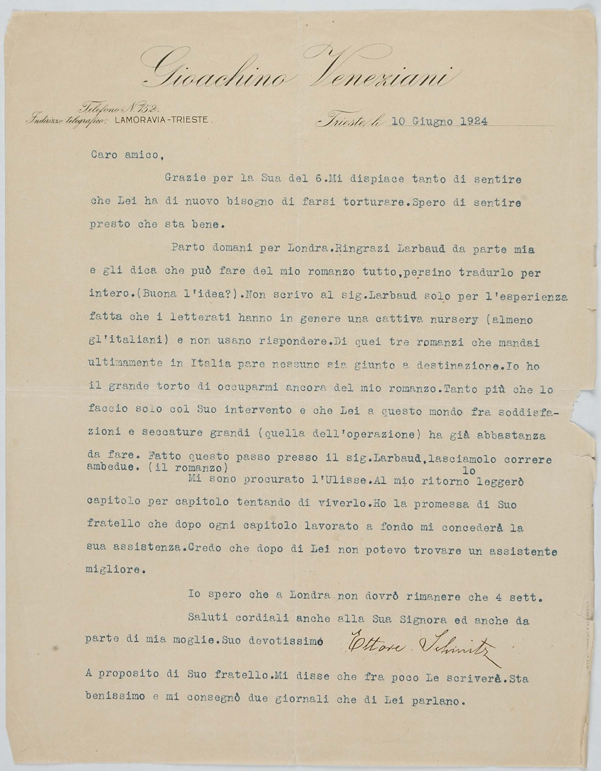 Un grande amico di papà fu James Joyce. Mio padre, che si recava spesso a Londra per curare da vicino gli interessi della filiale inglese della ditta Veneziani, decise di studiare bene l’inglese e di prendere una serie di lezioni da Joyce, allora giovanissimo professore alla Berlitz School di Trieste (eravamo, credo, nel 1907). Joyce cominciò a venire in villa Veneziani e a dar lezioni a mio padre e a mia madre. Durante una delle prime lezioni disse loro che era uno scrittore, che aveva pubblicato una raccolta di poesie, Chamber Music (1907) e che aveva composto un romanzo, A Portrait of the Artist as a Young Man (o Dedalus) e i racconti Dubliners. I miei genitori ne furono subito entusiasti: mamma si recò in giardino e portò a Joyce un mazzo di rose. Allora papà timidamente gli disse: ‘Sa, anch’io ho scritto; ma ho scritto due libri che non sono stati riconosciuti da nessuno’. Così ebbe inizio l’amicizia tra Joyce e mio padre, che durò, attraverso frequenti contatti personali, sino al 1915, allorché Joyce, come cittadino inglese, dovette lasciare Trieste, dato lo stato di guerra fra l’Austria e l’Inghilterra. Egli si recò dapprima in Svizzera, a Zurigo, con la moglie Dora Barnacle e i due figli, e quindi, nel ’20, a Parigi. Ma tale amicizia durò, per così dire, a distanza, anche negli anni successivi alla prima guerra mondiale.