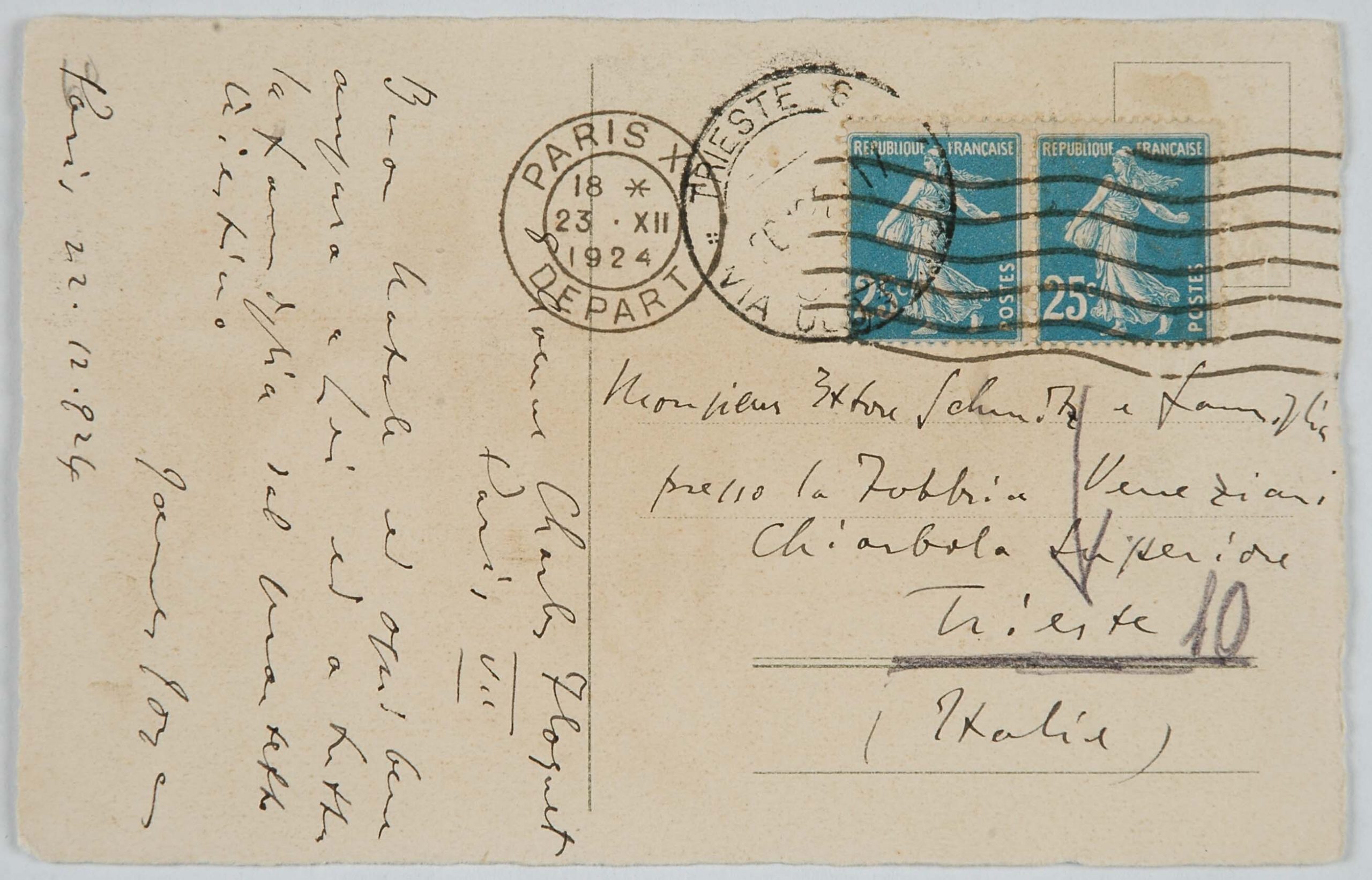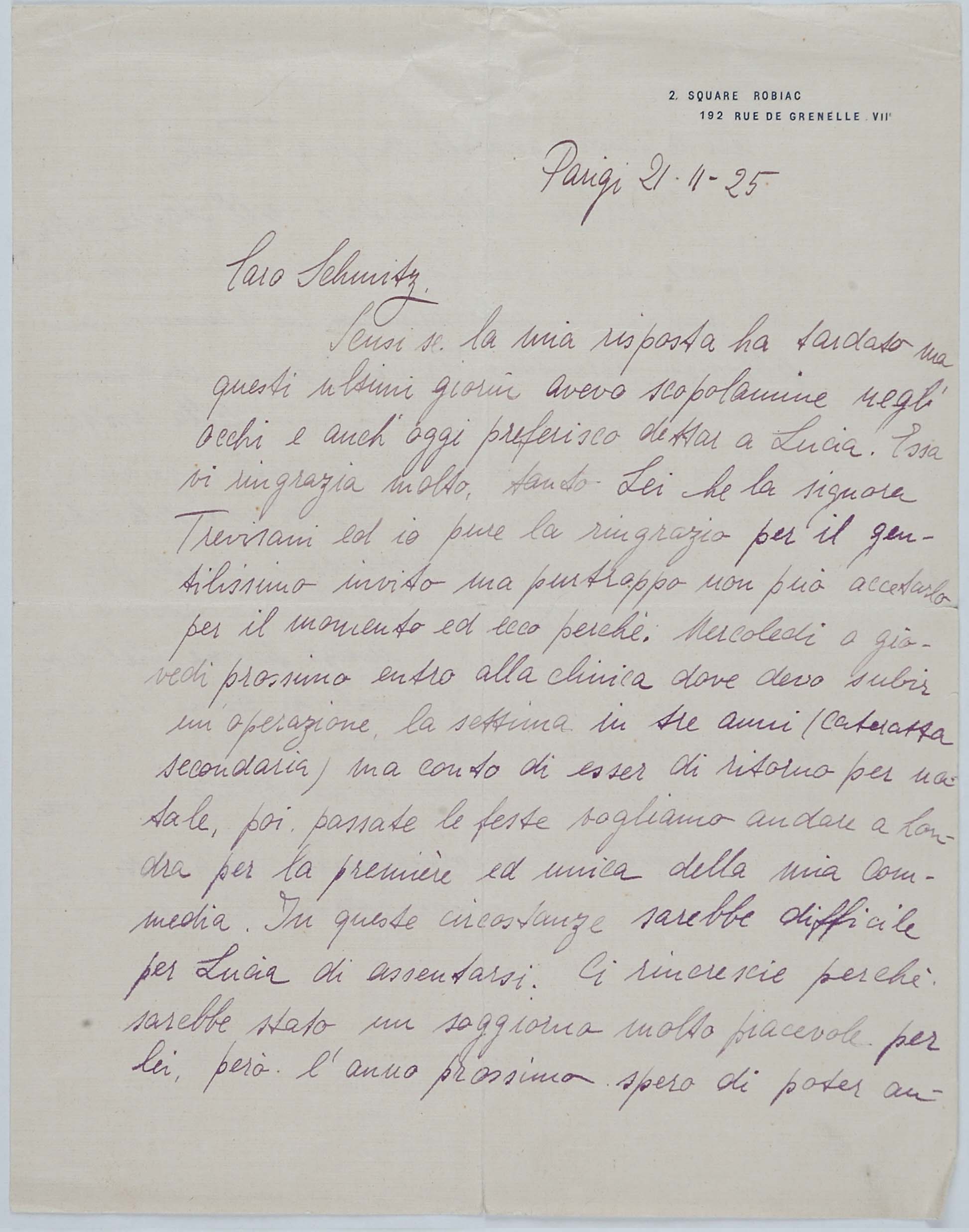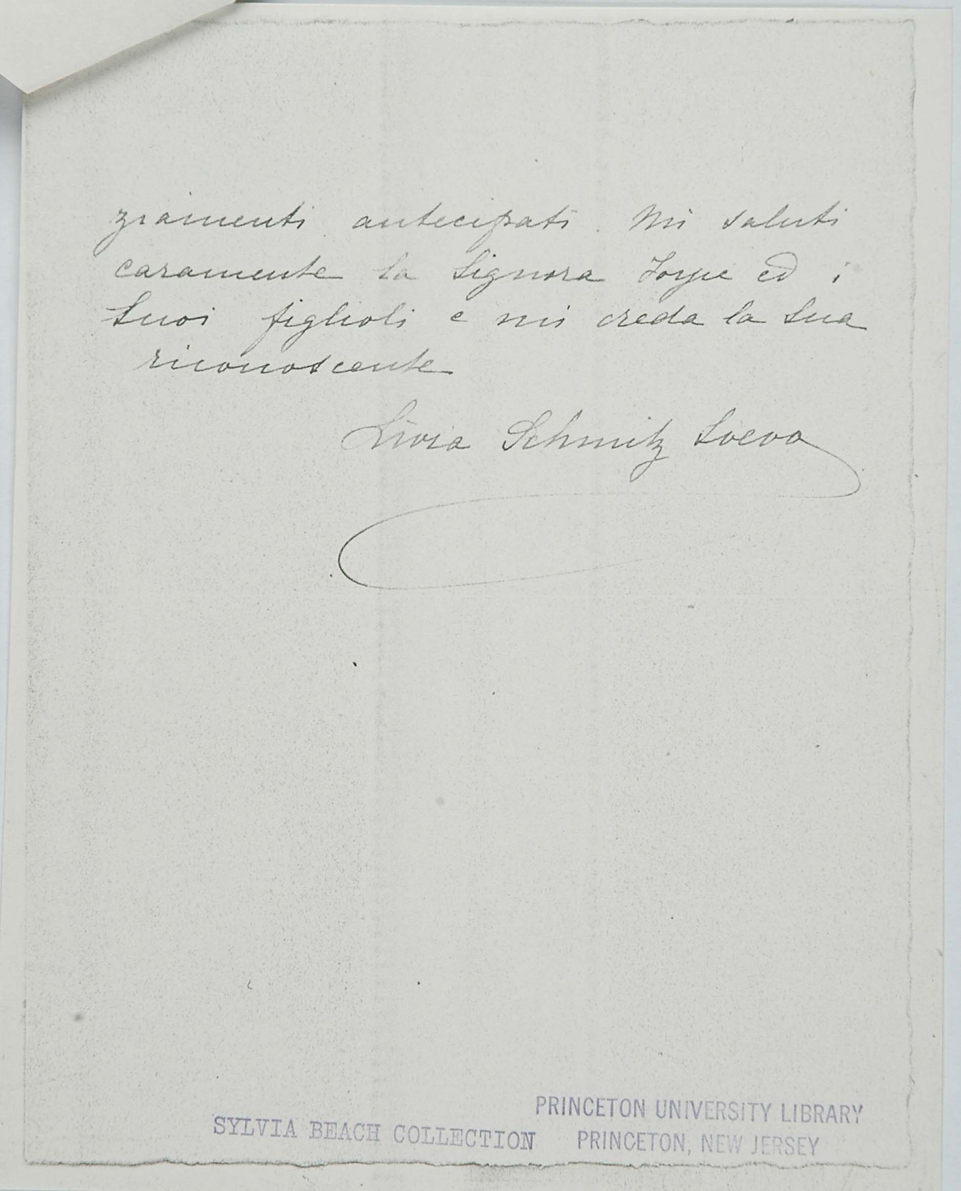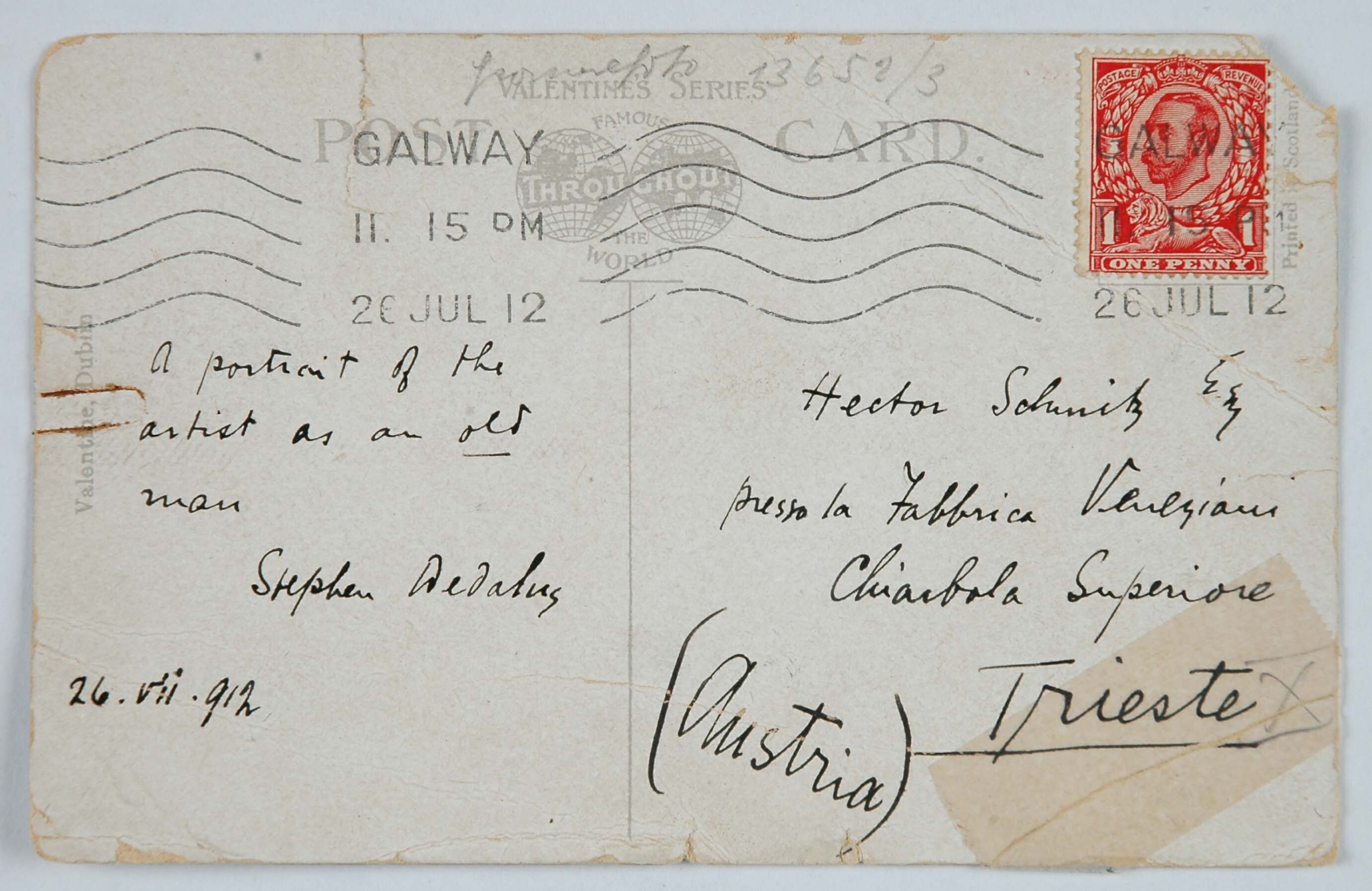 Un grande amico di papà fu James Joyce. Mio padre, che si recava spesso a Londra per curare da vicino gli interessi della filiale inglese della ditta Veneziani, decise di studiare bene l’inglese e di prendere una serie di lezioni da Joyce, allora giovanissimo professore alla Berlitz School di Trieste (eravamo, credo, nel 1907). Joyce cominciò a venire in villa Veneziani e a dar lezioni a mio padre e a mia madre. Durante una delle prime lezioni disse loro che era uno scrittore, che aveva pubblicato una raccolta di poesie, Chamber Music (1907) e che aveva composto un romanzo, A Portrait of the Artist as a Young Man (o Dedalus) e i racconti Dubliners. I miei genitori ne furono subito entusiasti: mamma si recò in giardino e portò a Joyce un mazzo di rose. Allora papà timidamente gli disse: ‘Sa, anch’io ho scritto; ma ho scritto due libri che non sono stati riconosciuti da nessuno’. Così ebbe inizio l’amicizia tra Joyce e mio padre, che durò, attraverso frequenti contatti personali, sino al 1915, allorché Joyce, come cittadino inglese, dovette lasciare Trieste, dato lo stato di guerra fra l’Austria e l’Inghilterra. Egli si recò dapprima in Svizzera, a Zurigo, con la moglie Dora Barnacle e i due figli, e quindi, nel ’20, a Parigi. Ma tale amicizia durò, per così dire, a distanza, anche negli anni successivi alla prima guerra mondiale.