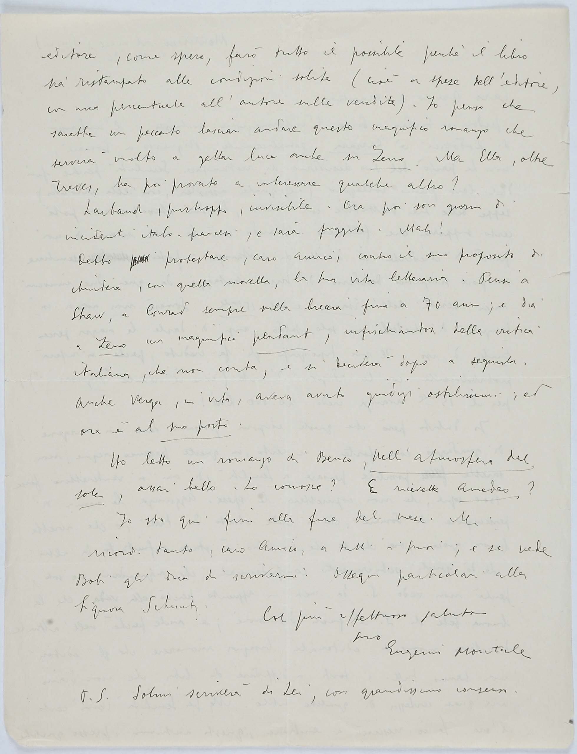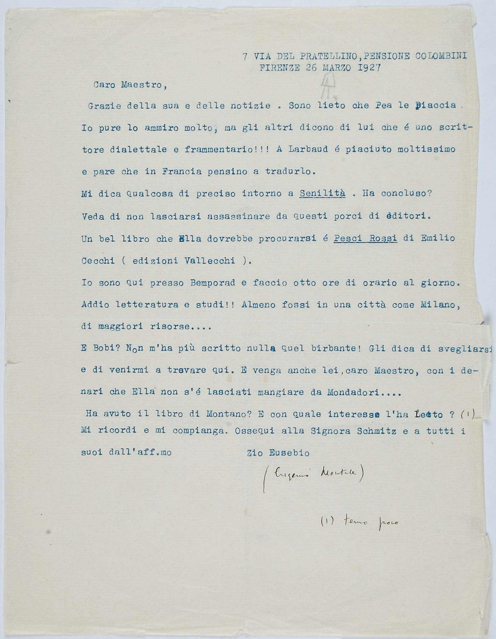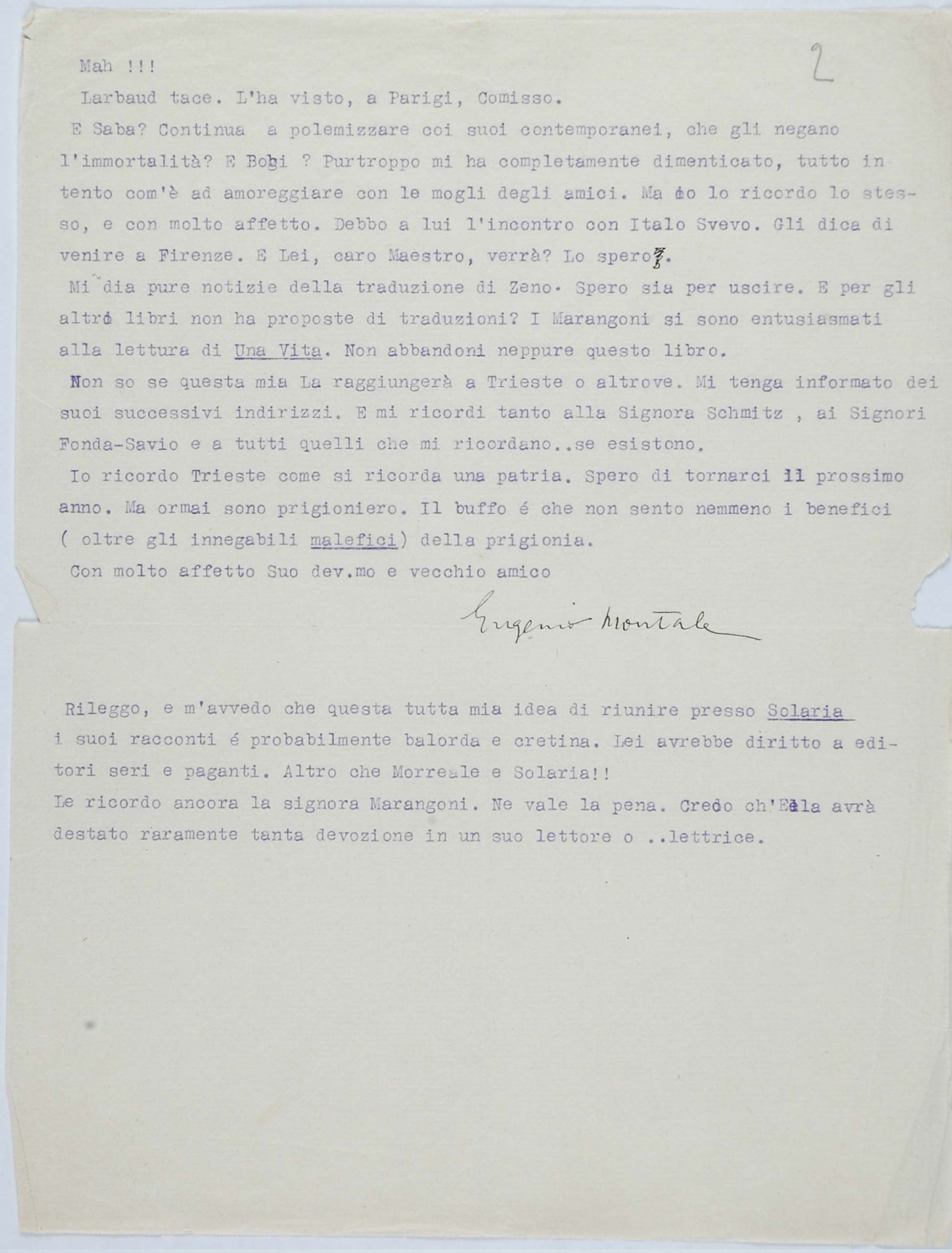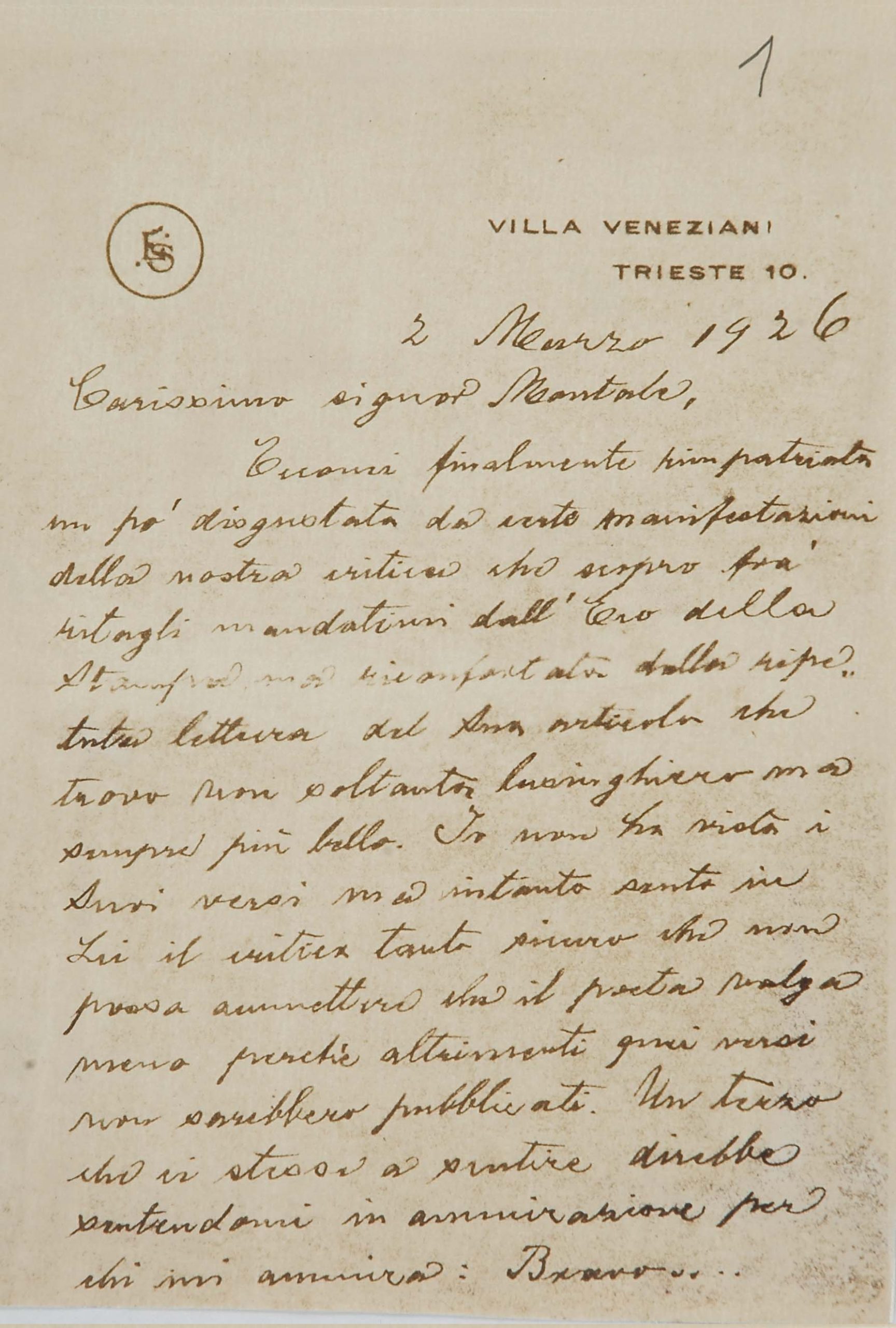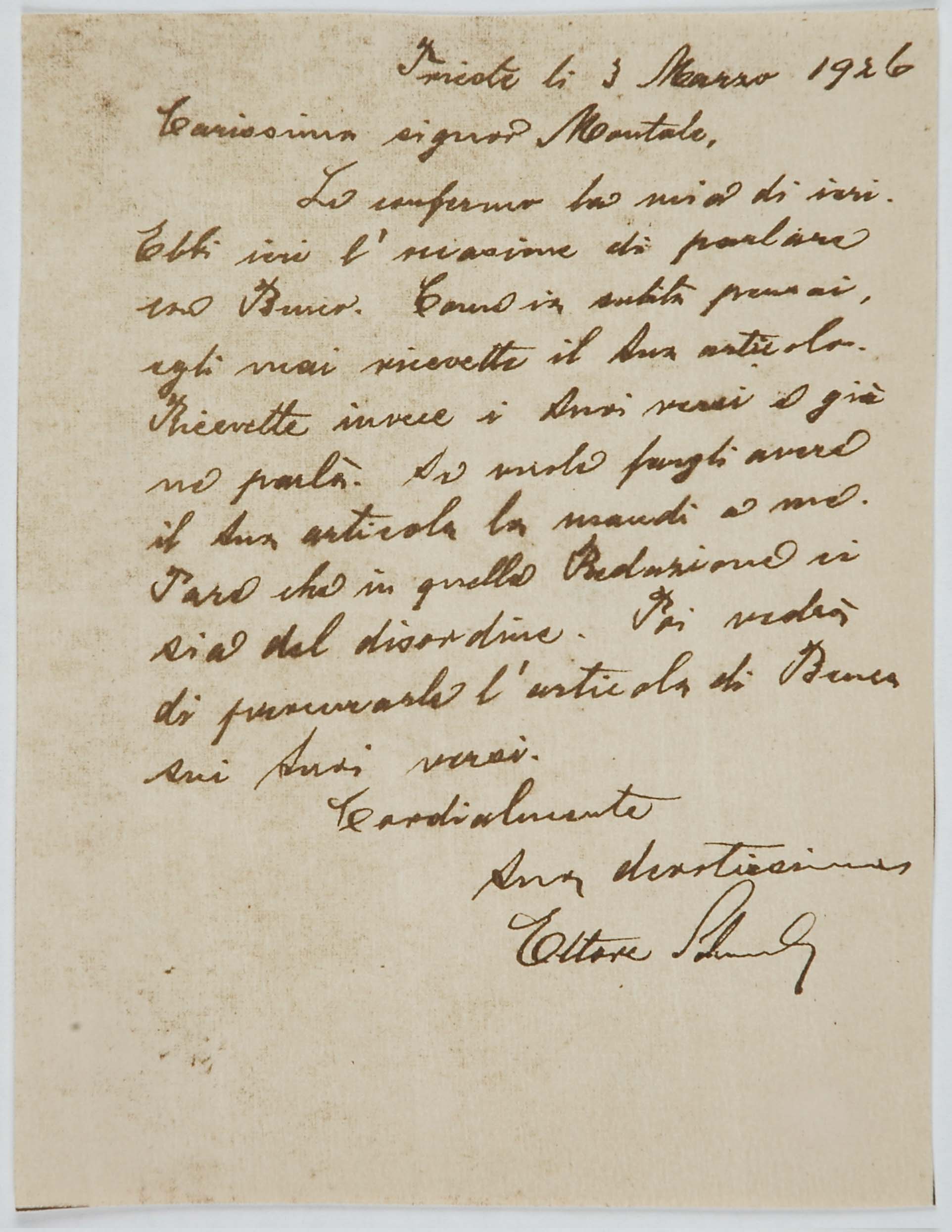 Il faldone con la segnatura archivistica Museo Sveviano FS Corr. A 76 contiene il carteggio tra Italo Svevo e Eugenio Montale, l’artefice nel novembre-dicembre del 1925 dell’Omaggio a Italo Svevo pubblicato nella rivista L’esame, la scintilla che, con due mesi di anticipo sulla critica francese, innesca il “caso Svevo” in Italia e in Europa.