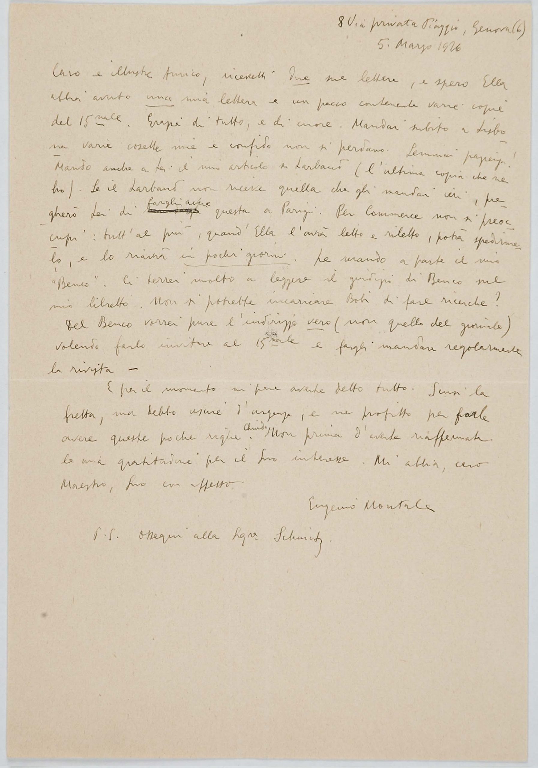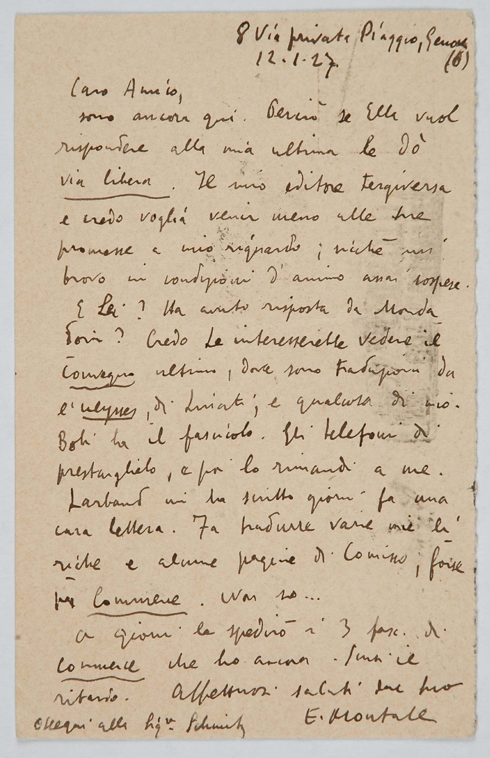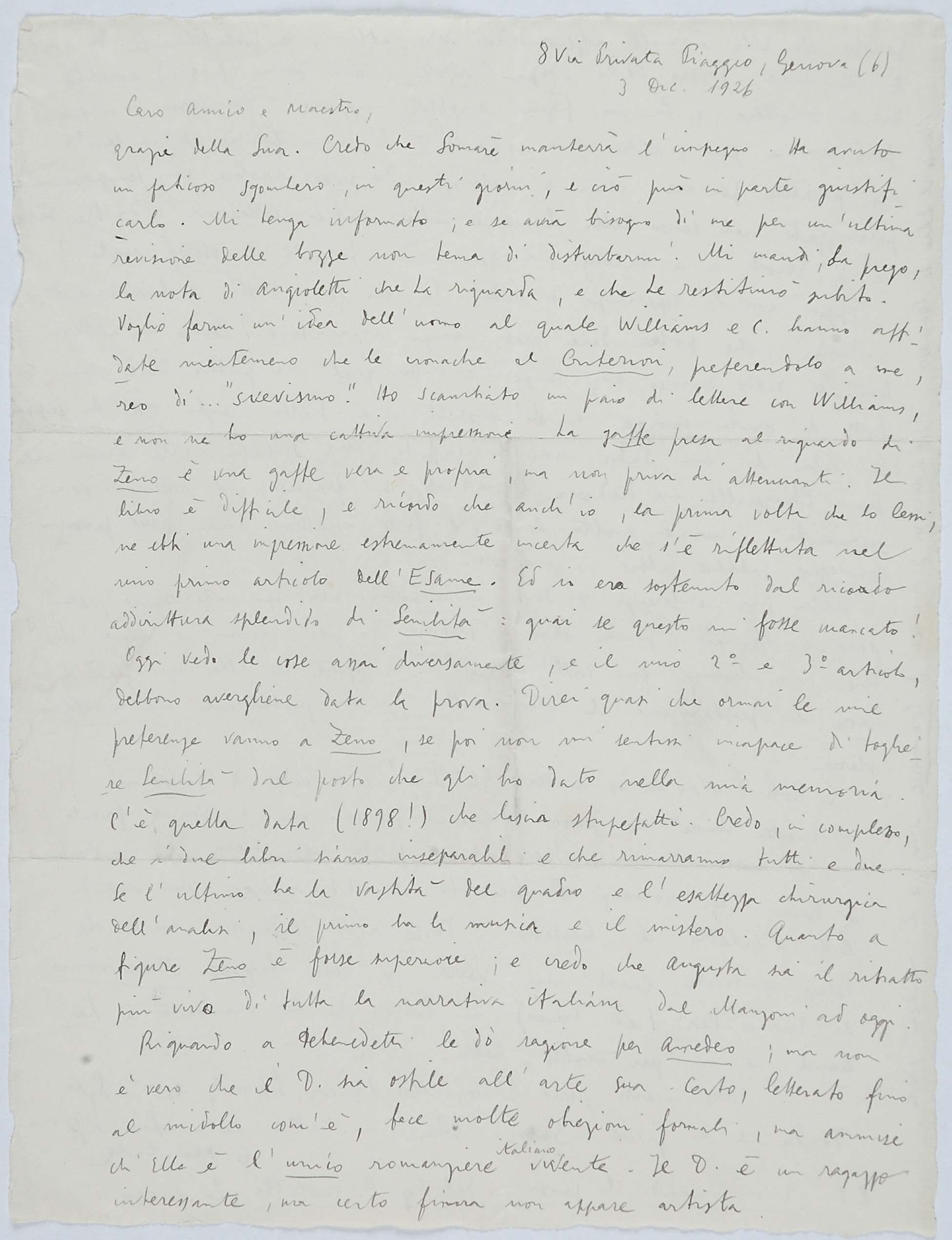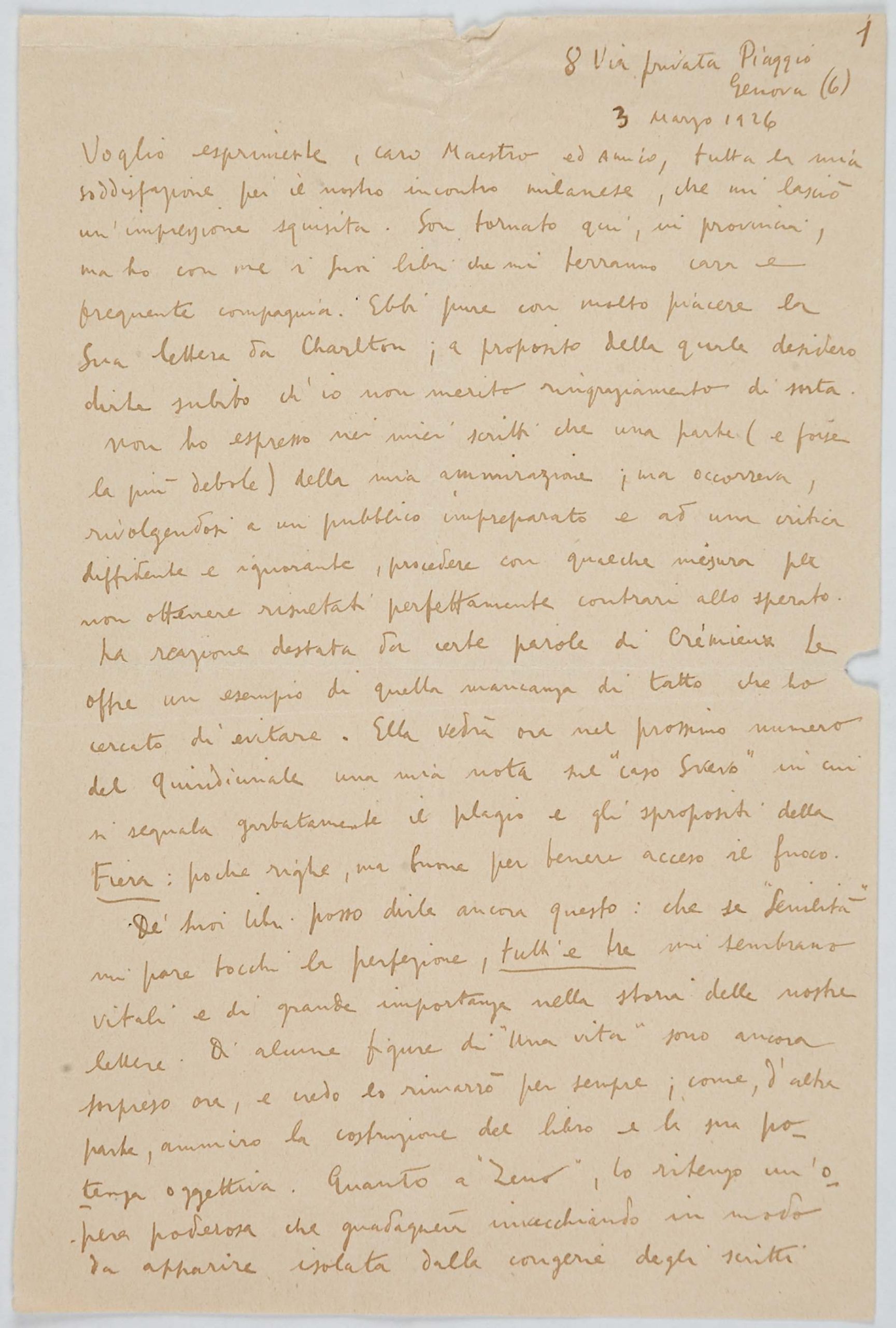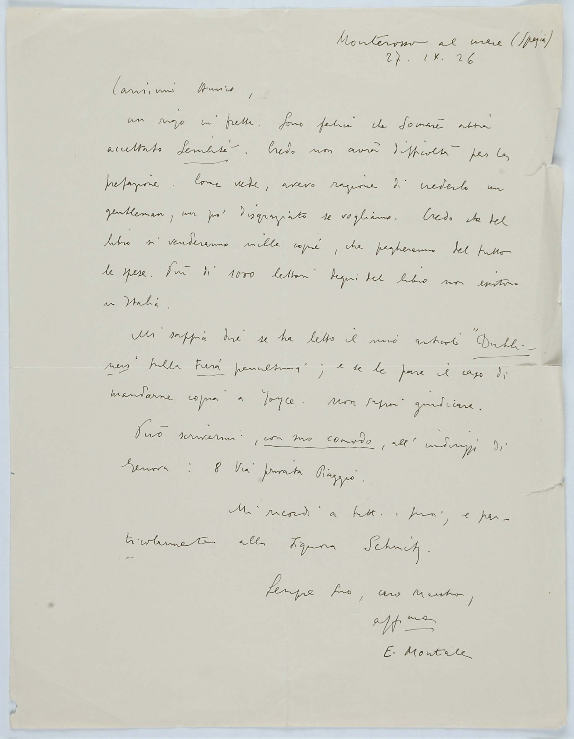 Il faldone con la segnatura archivistica Museo Sveviano FS Corr. A 76 contiene il carteggio tra Italo Svevo e Eugenio Montale, l’artefice nel novembre-dicembre del 1925 dell’Omaggio a Italo Svevo pubblicato nella rivista L’esame, la scintilla che, con due mesi di anticipo sulla critica francese, innesca il “caso Svevo” in Italia e in Europa.