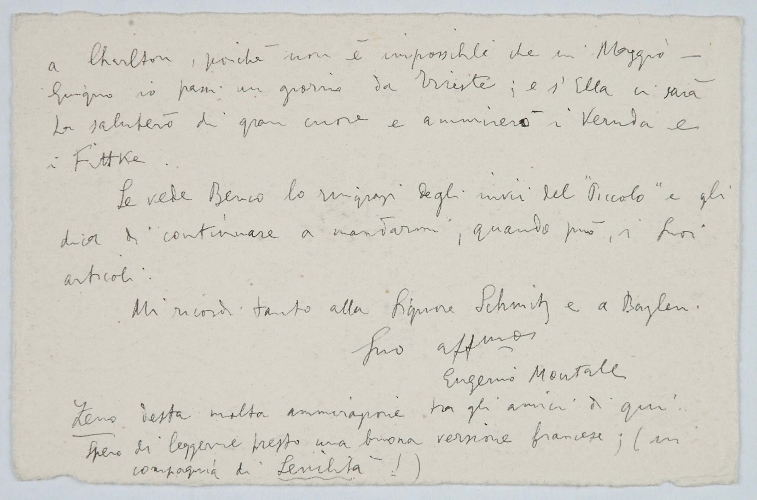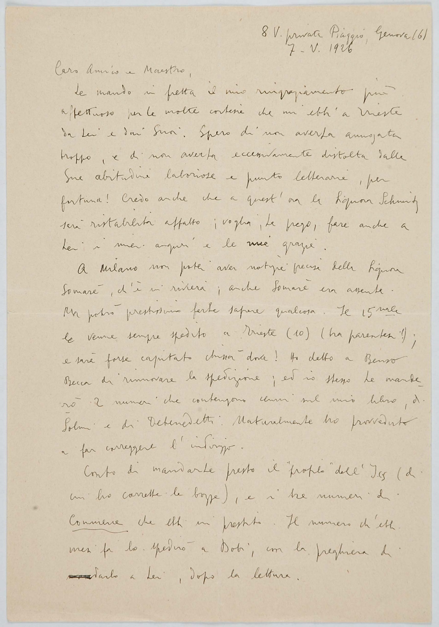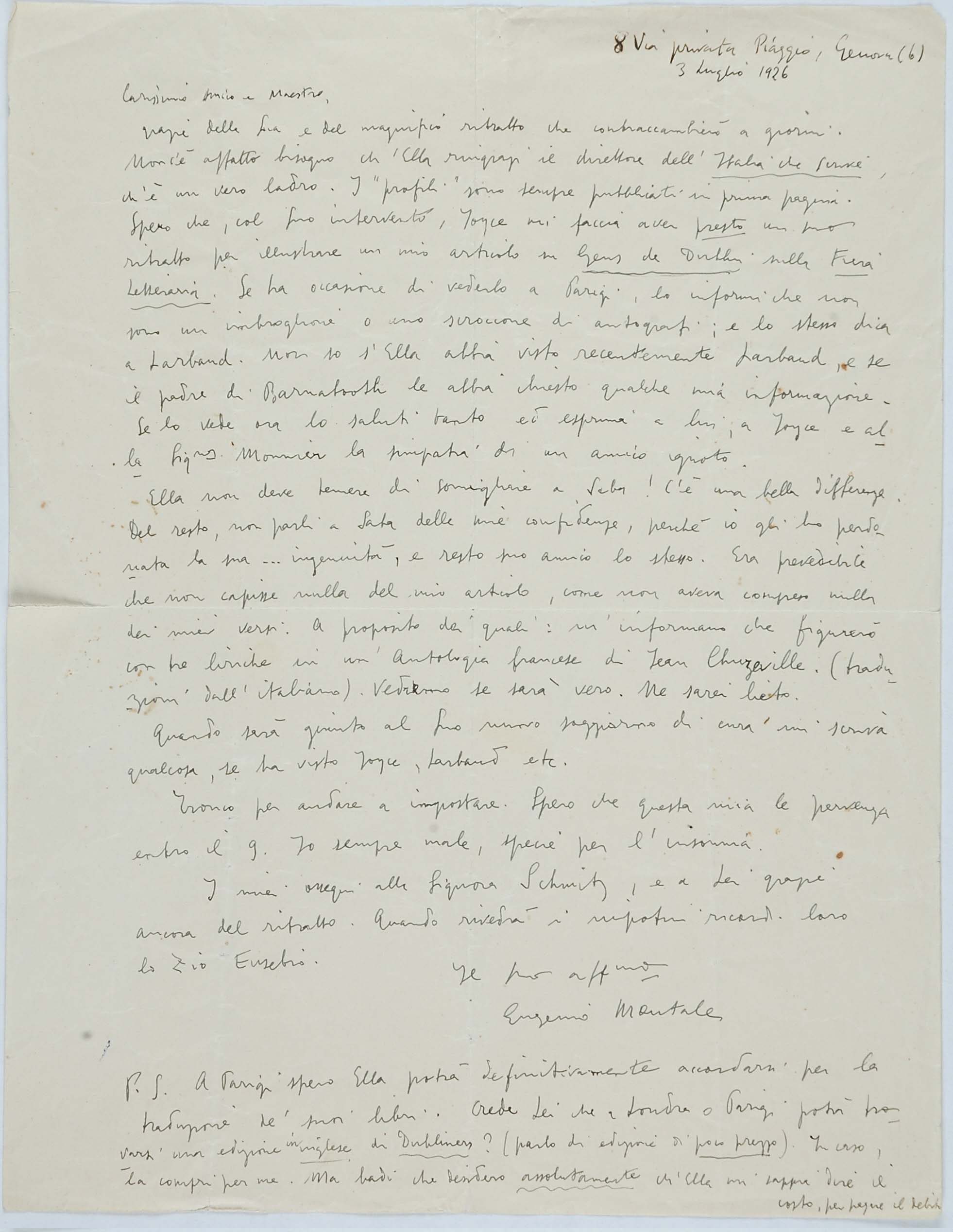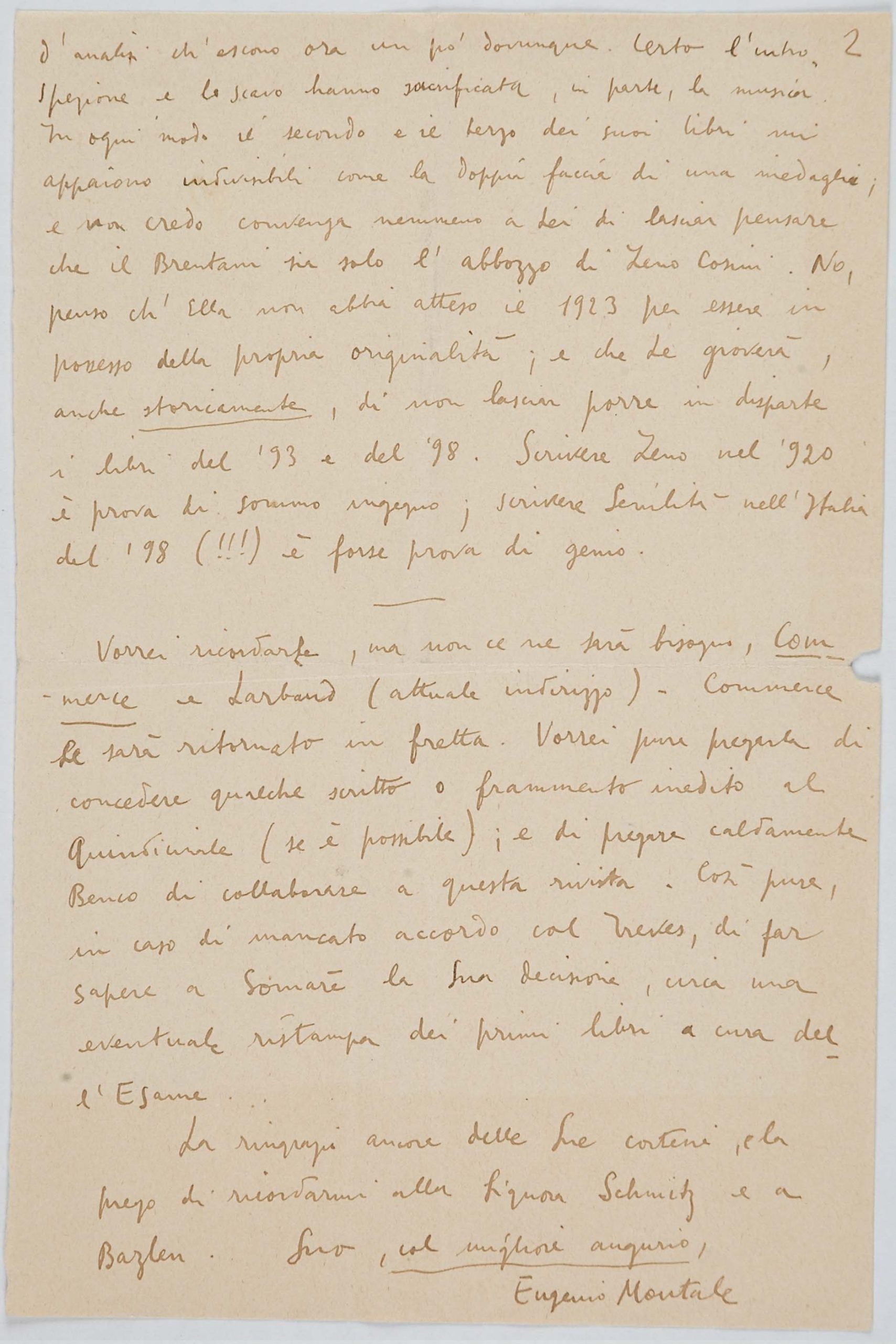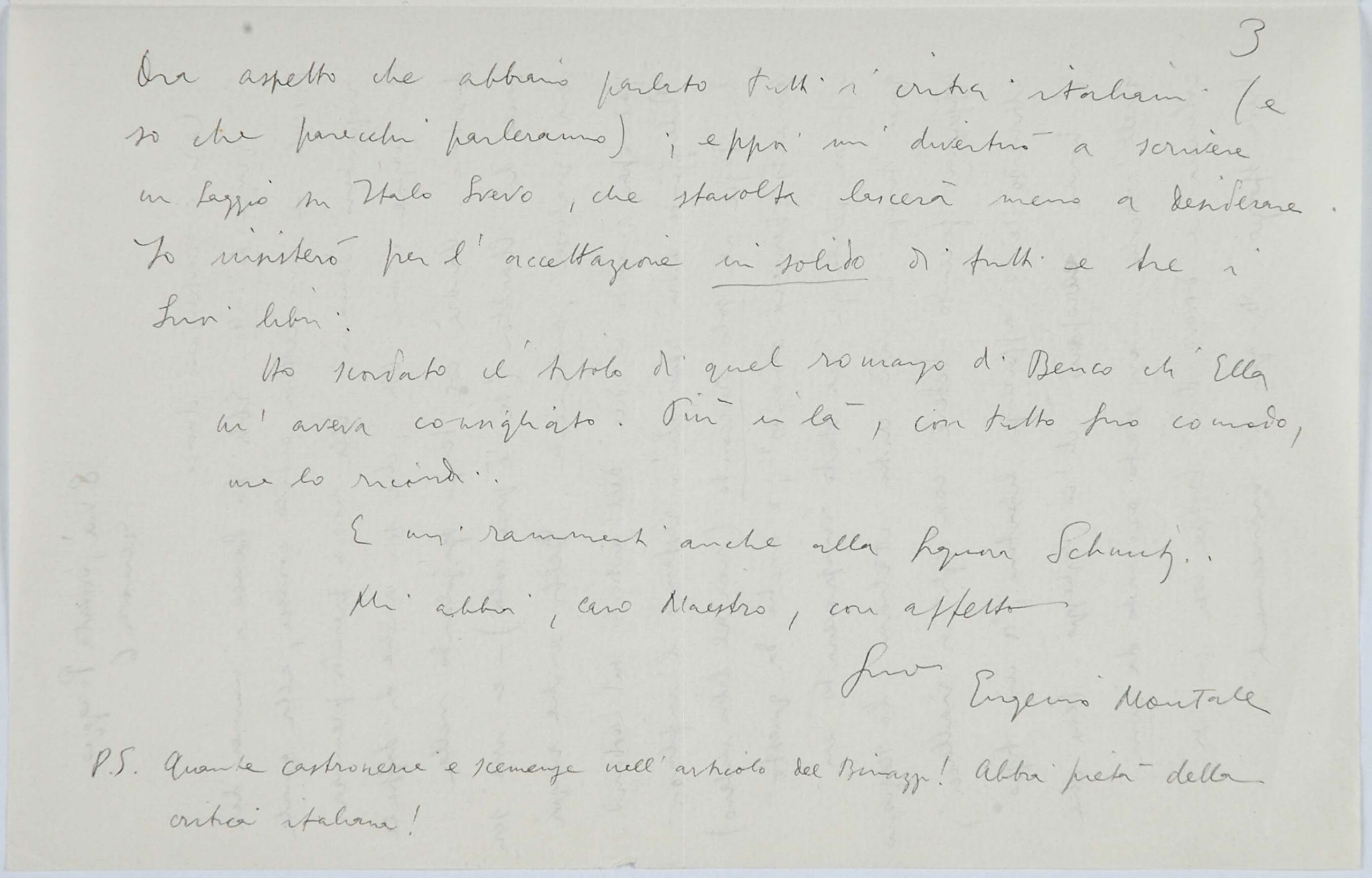 Il faldone con la segnatura archivistica Museo Sveviano FS Corr. A 76 contiene il carteggio tra Italo Svevo e Eugenio Montale, l’artefice nel novembre-dicembre del 1925 dell’Omaggio a Italo Svevo pubblicato nella rivista L’esame, la scintilla che, con due mesi di anticipo sulla critica francese, innesca il “caso Svevo” in Italia e in Europa.