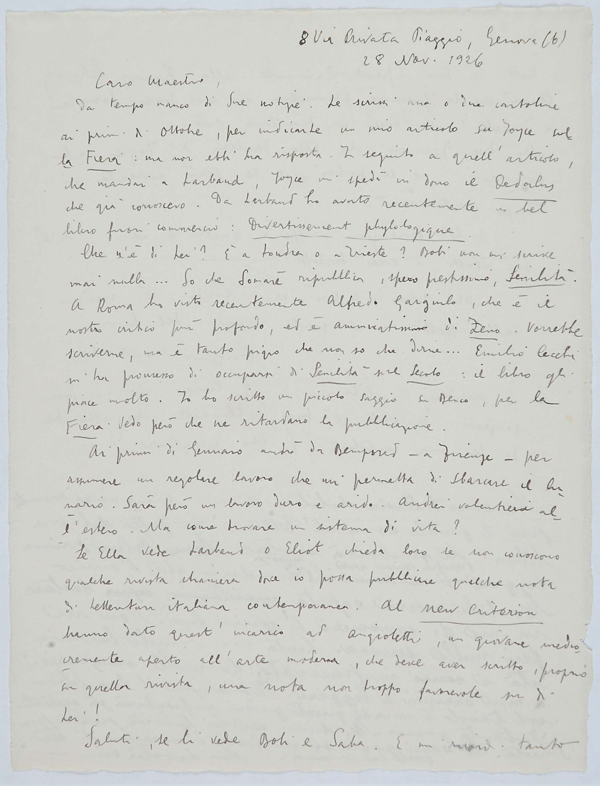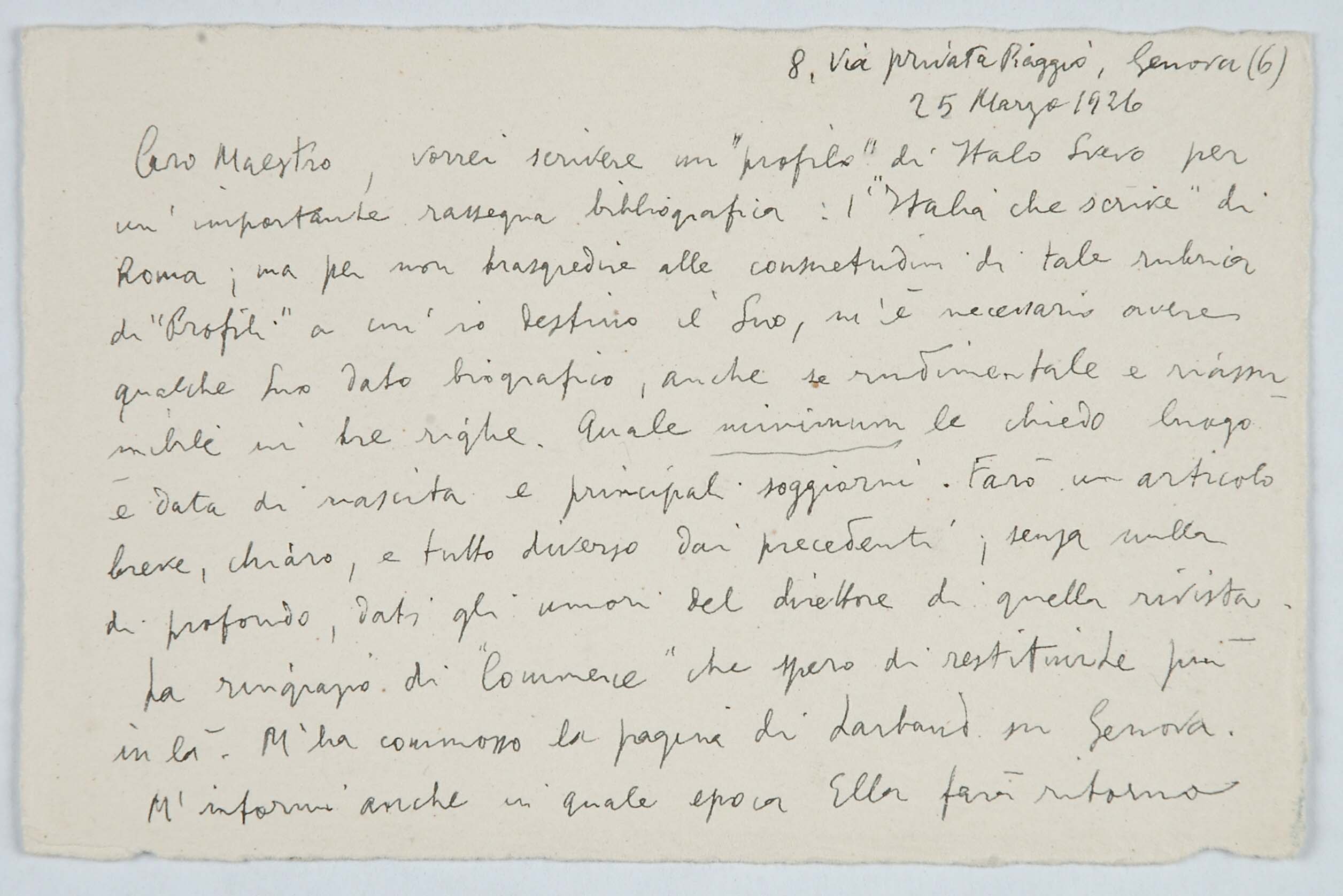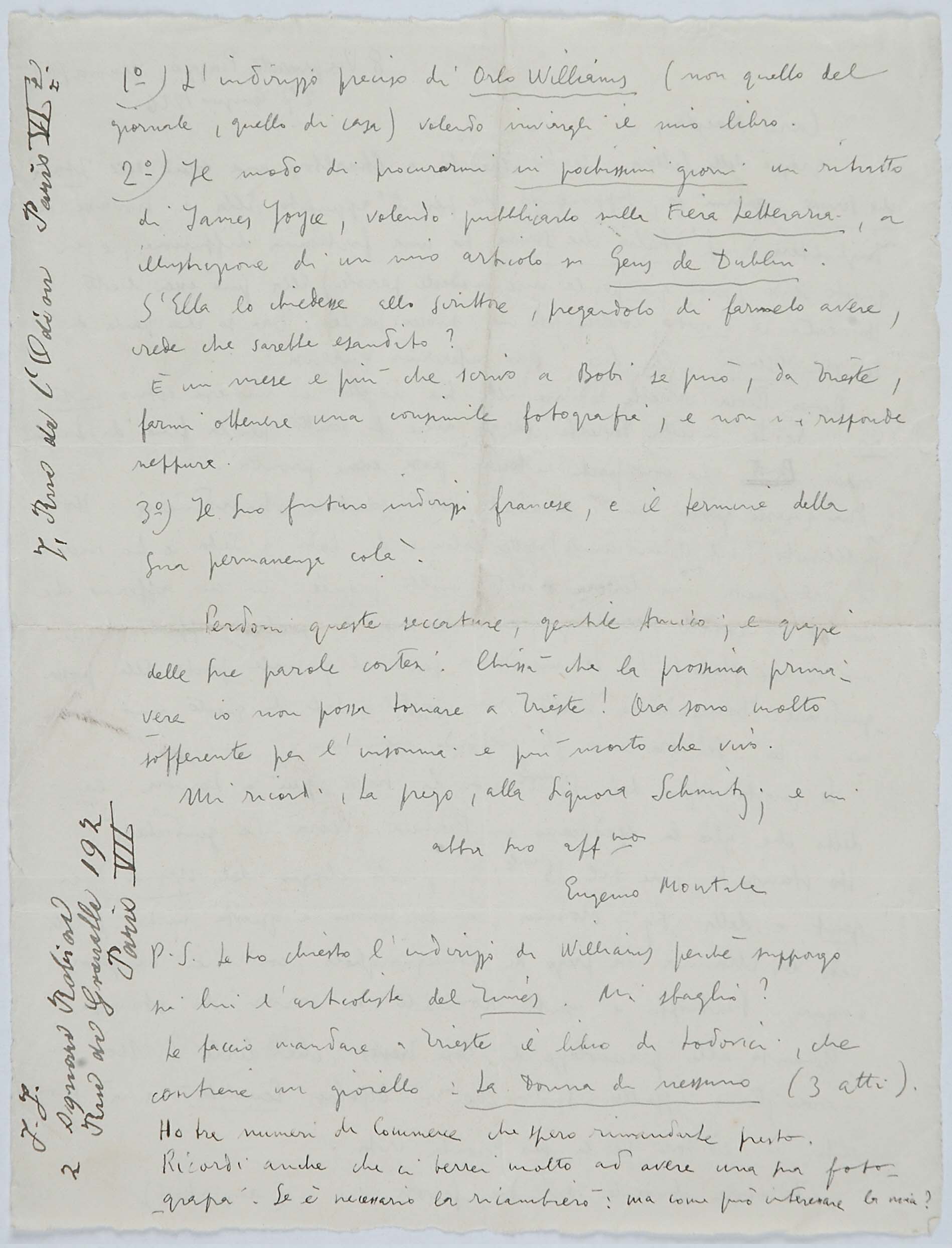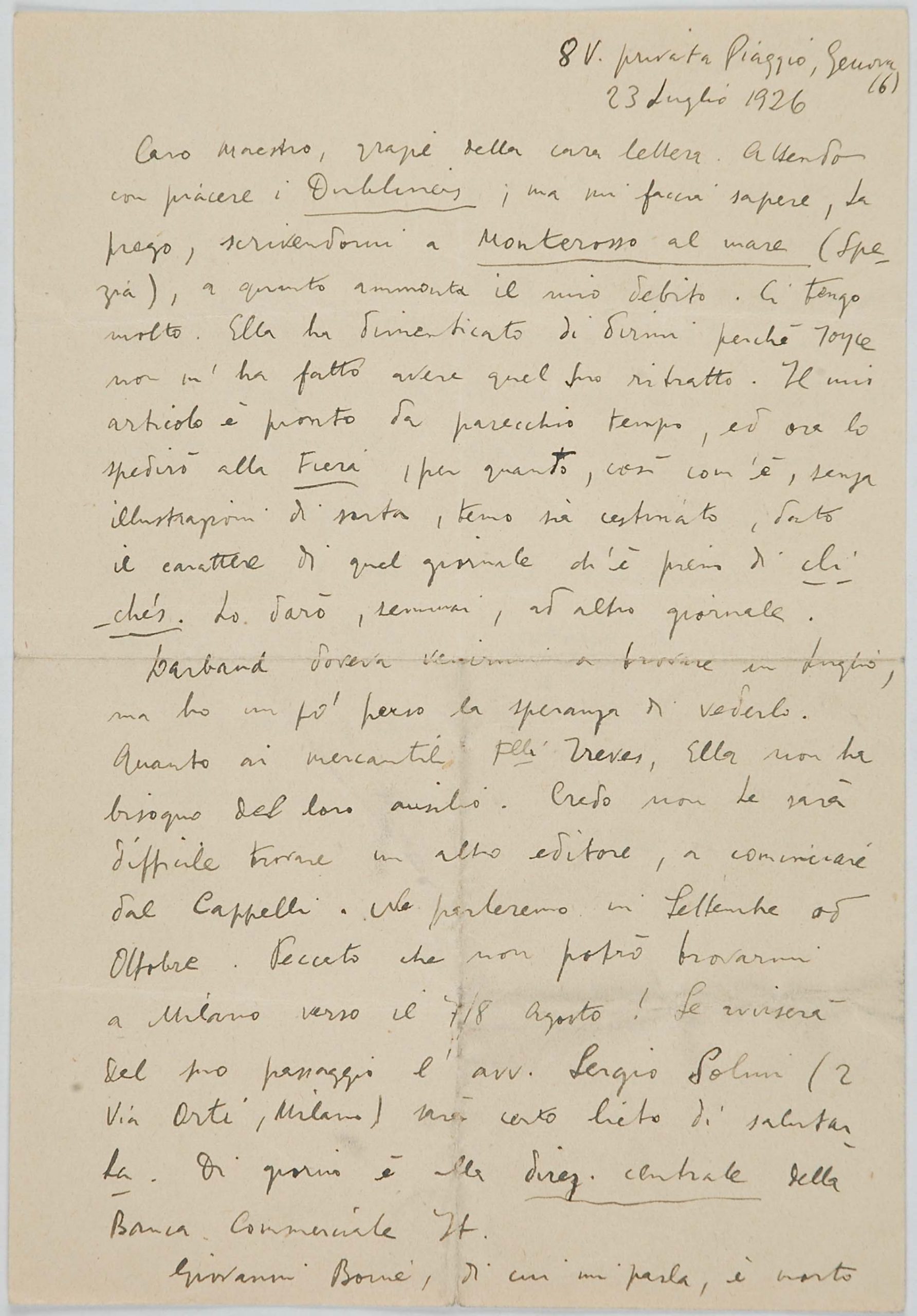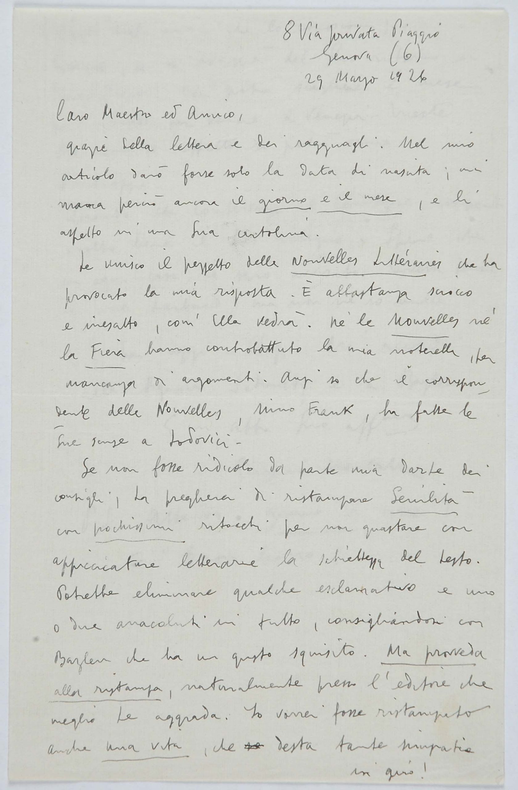 Il faldone con la segnatura archivistica Museo Sveviano FS Corr. A 76 contiene il carteggio tra Italo Svevo e Eugenio Montale, l’artefice nel novembre-dicembre del 1925 dell’Omaggio a Italo Svevo pubblicato nella rivista L’esame, la scintilla che, con due mesi di anticipo sulla critica francese, innesca il “caso Svevo” in Italia e in Europa.