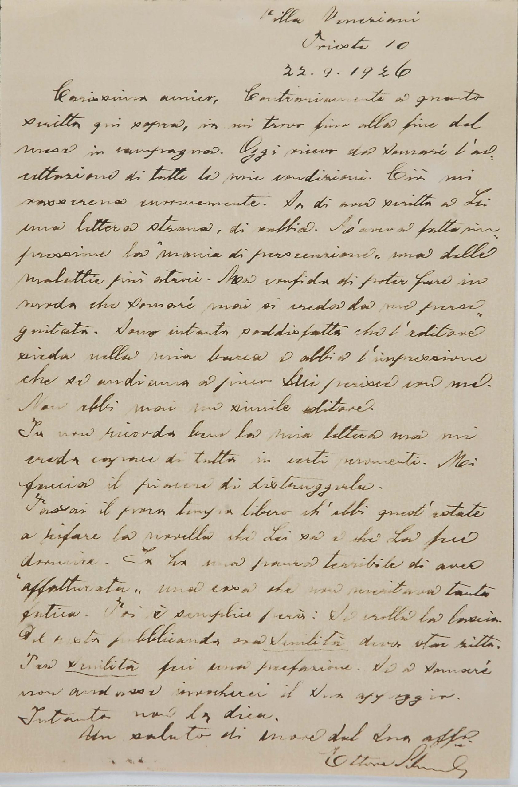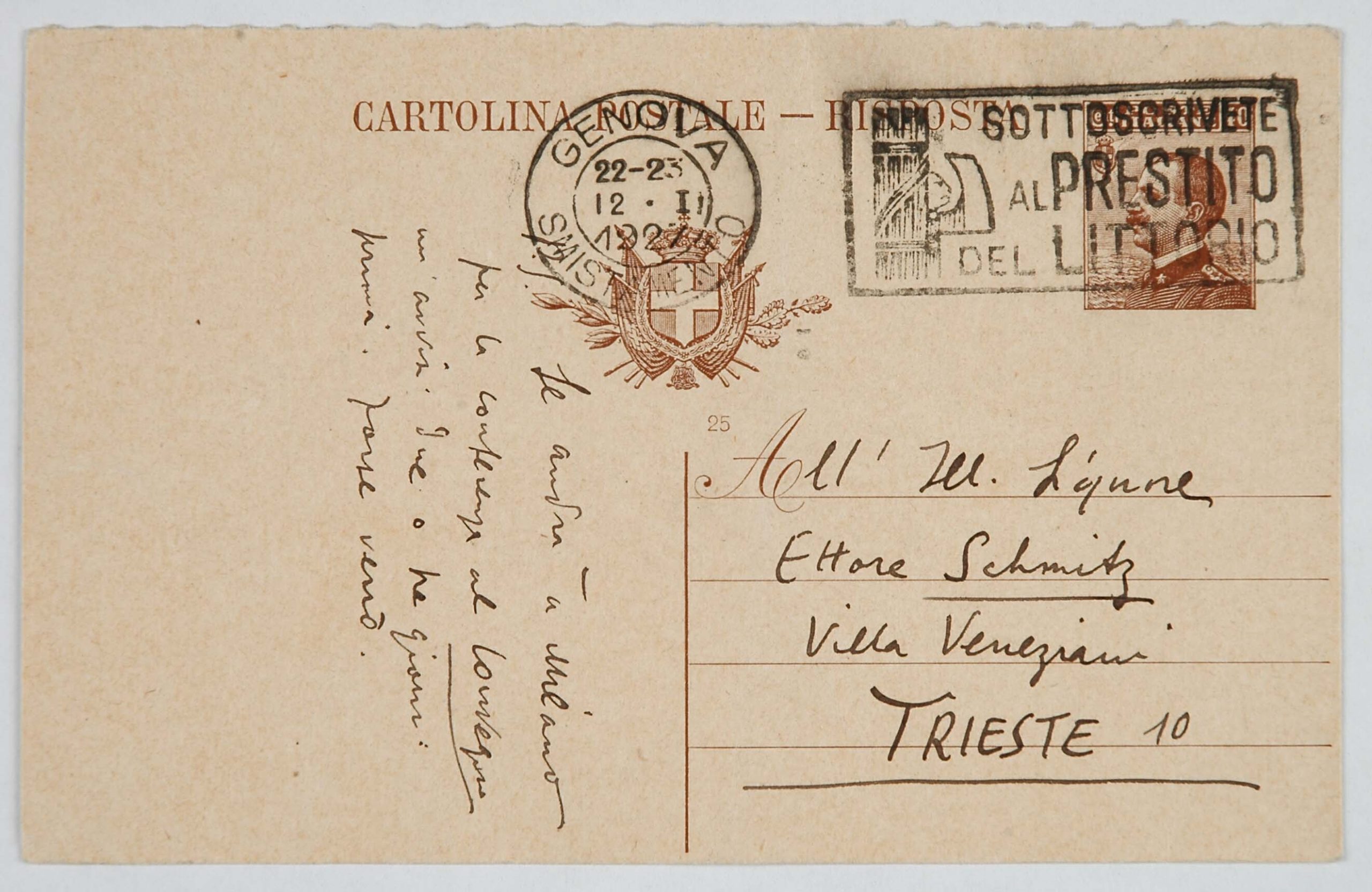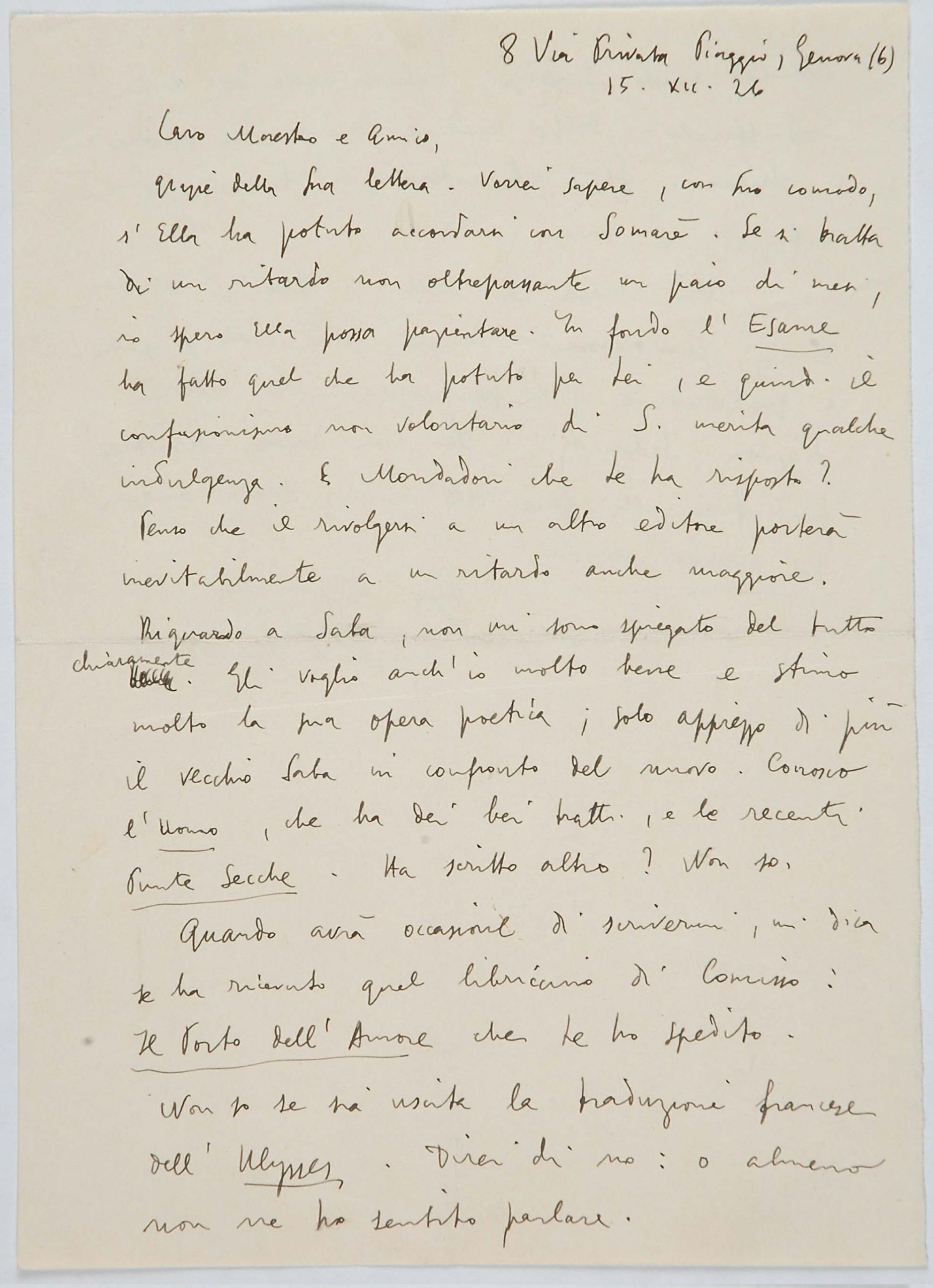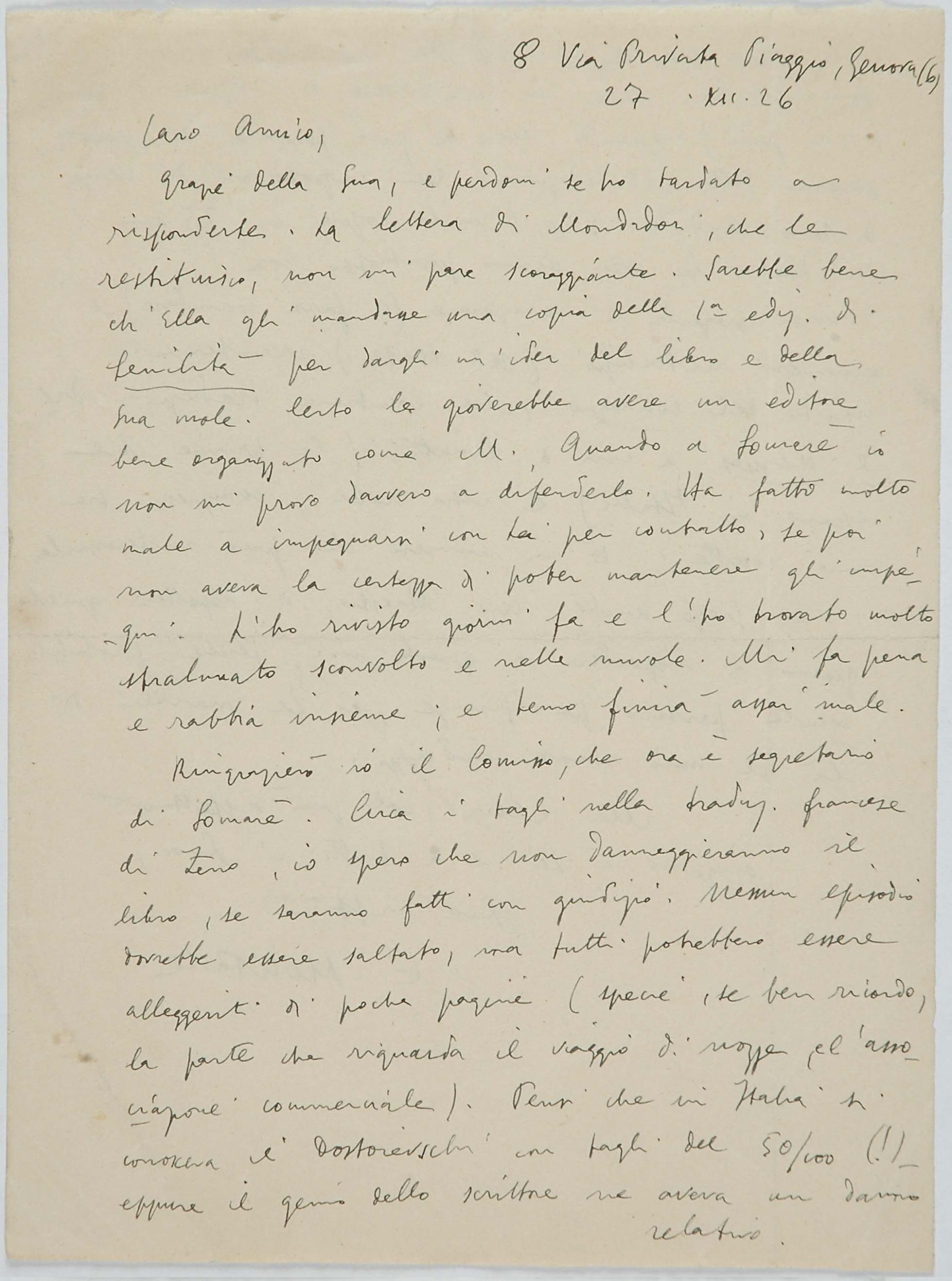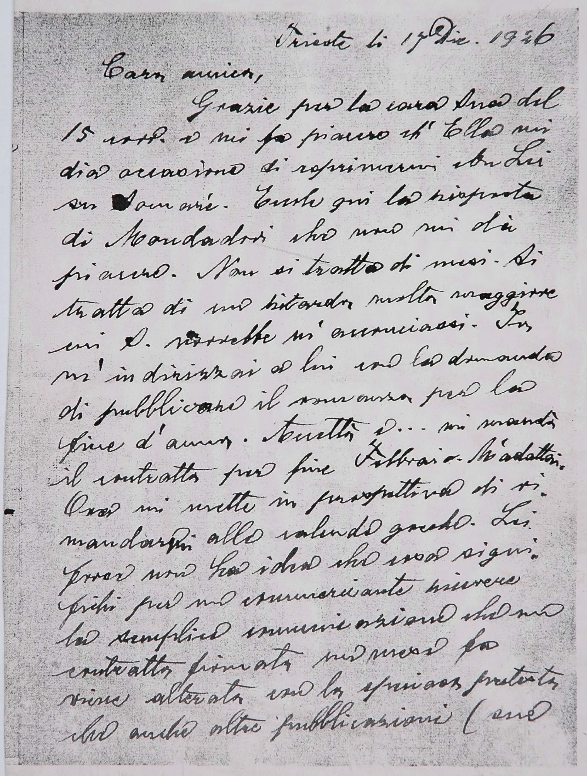 Il faldone con la segnatura archivistica Museo Sveviano FS Corr. A 76 contiene il carteggio tra Italo Svevo e Eugenio Montale, l’artefice nel novembre-dicembre del 1925 dell’Omaggio a Italo Svevo pubblicato nella rivista L’esame, la scintilla che, con due mesi di anticipo sulla critica francese, innesca il “caso Svevo” in Italia e in Europa.