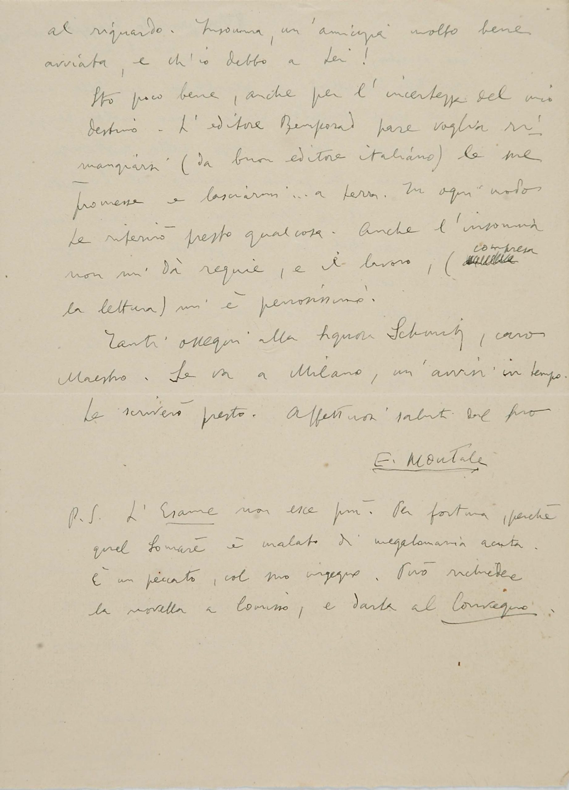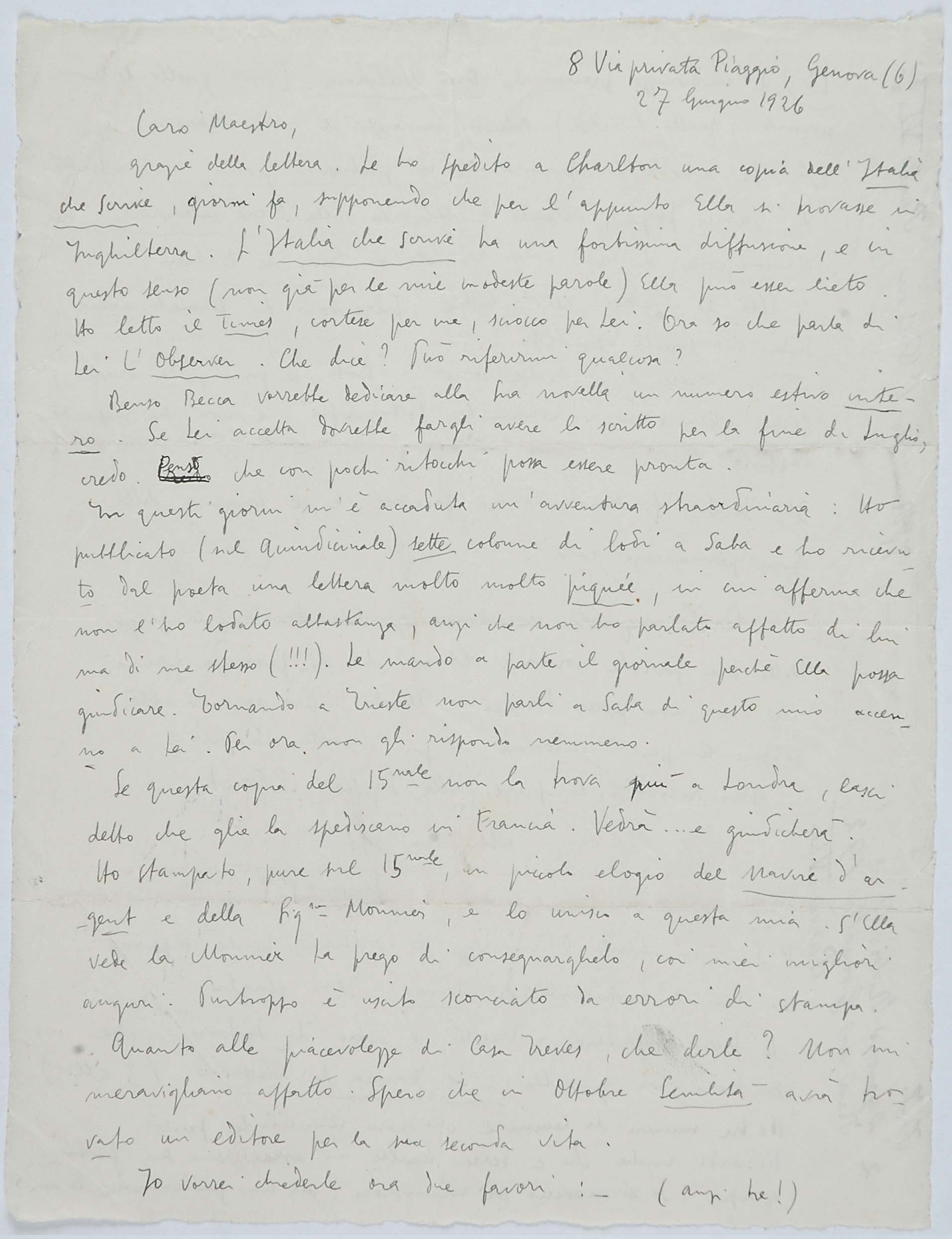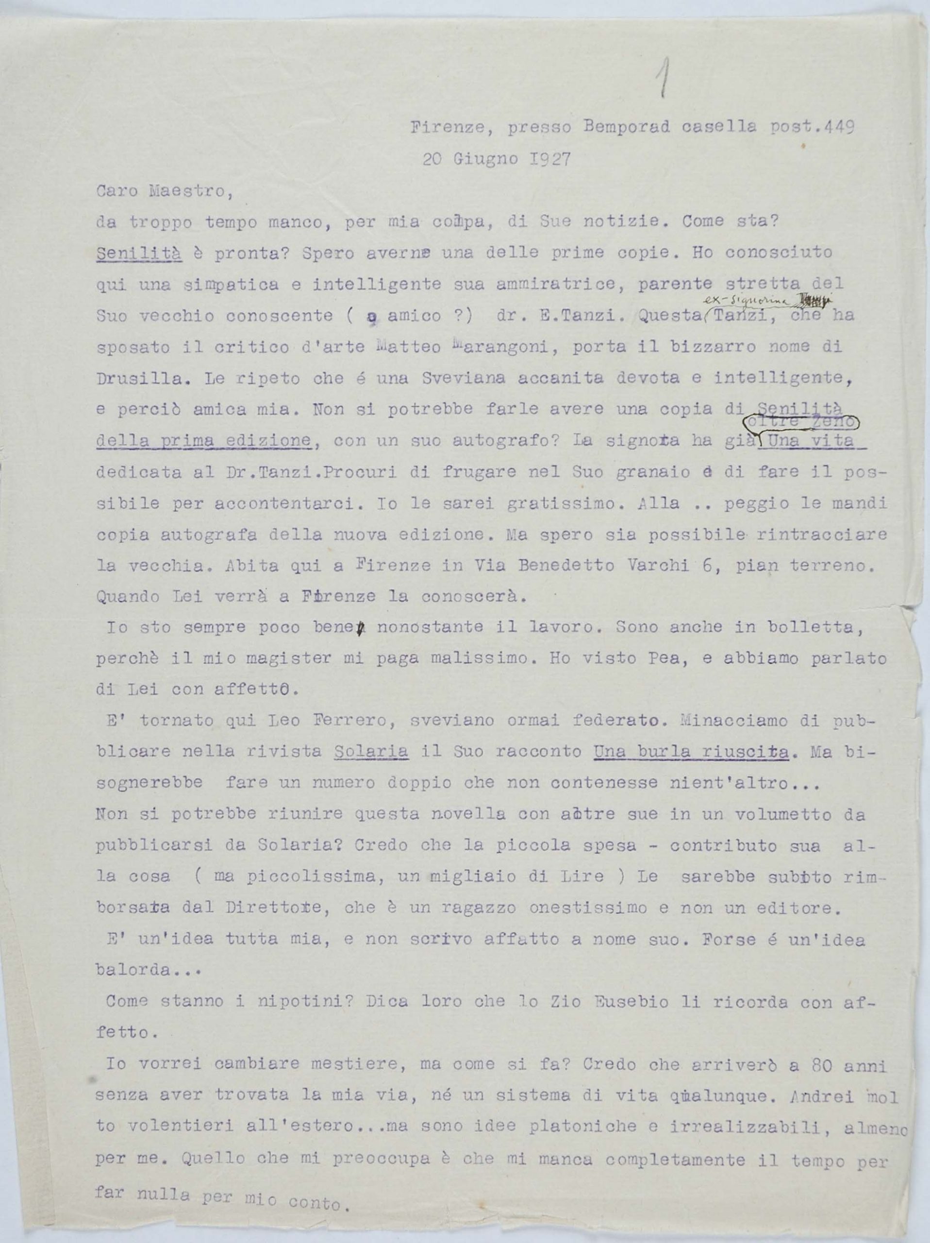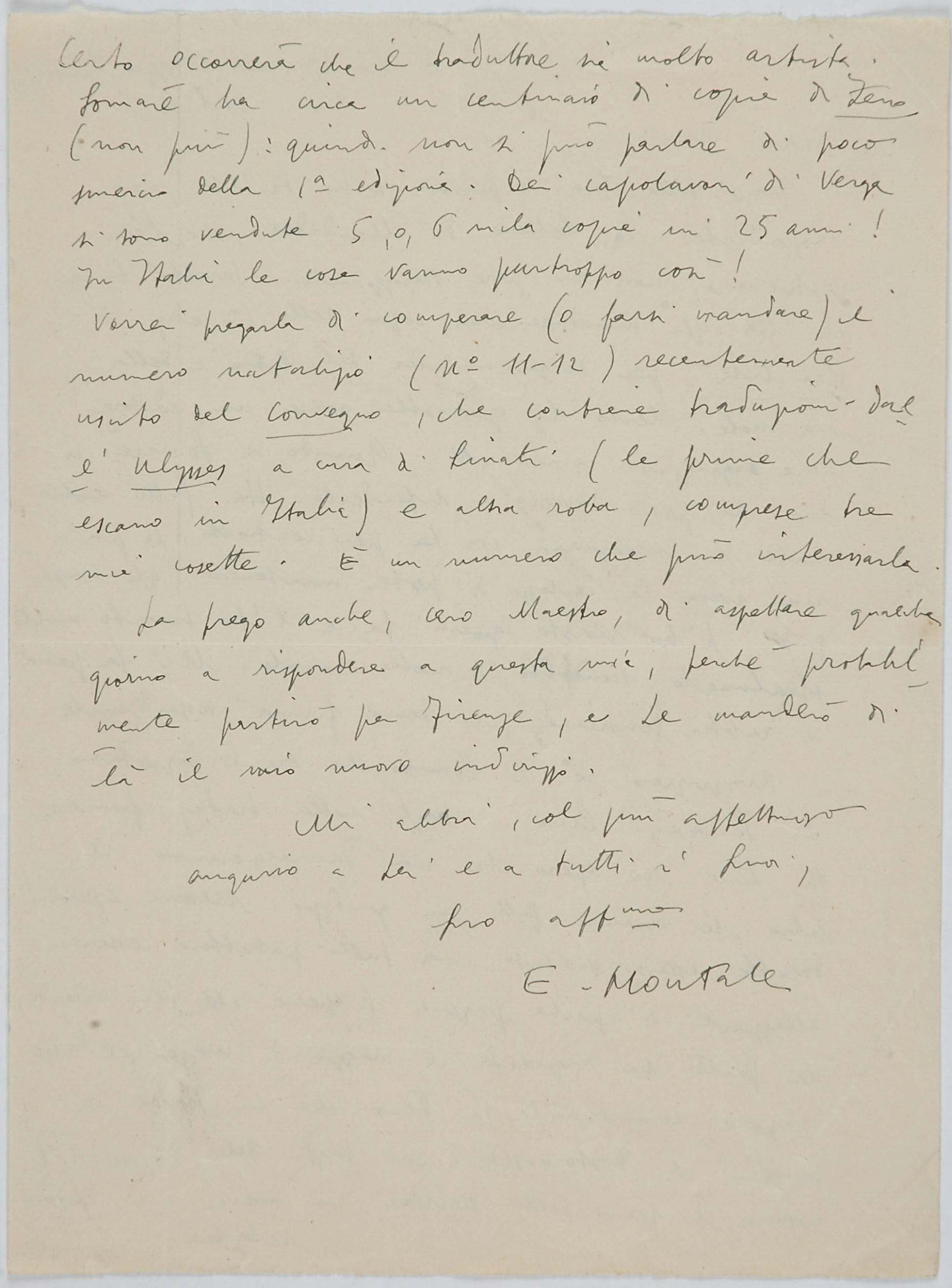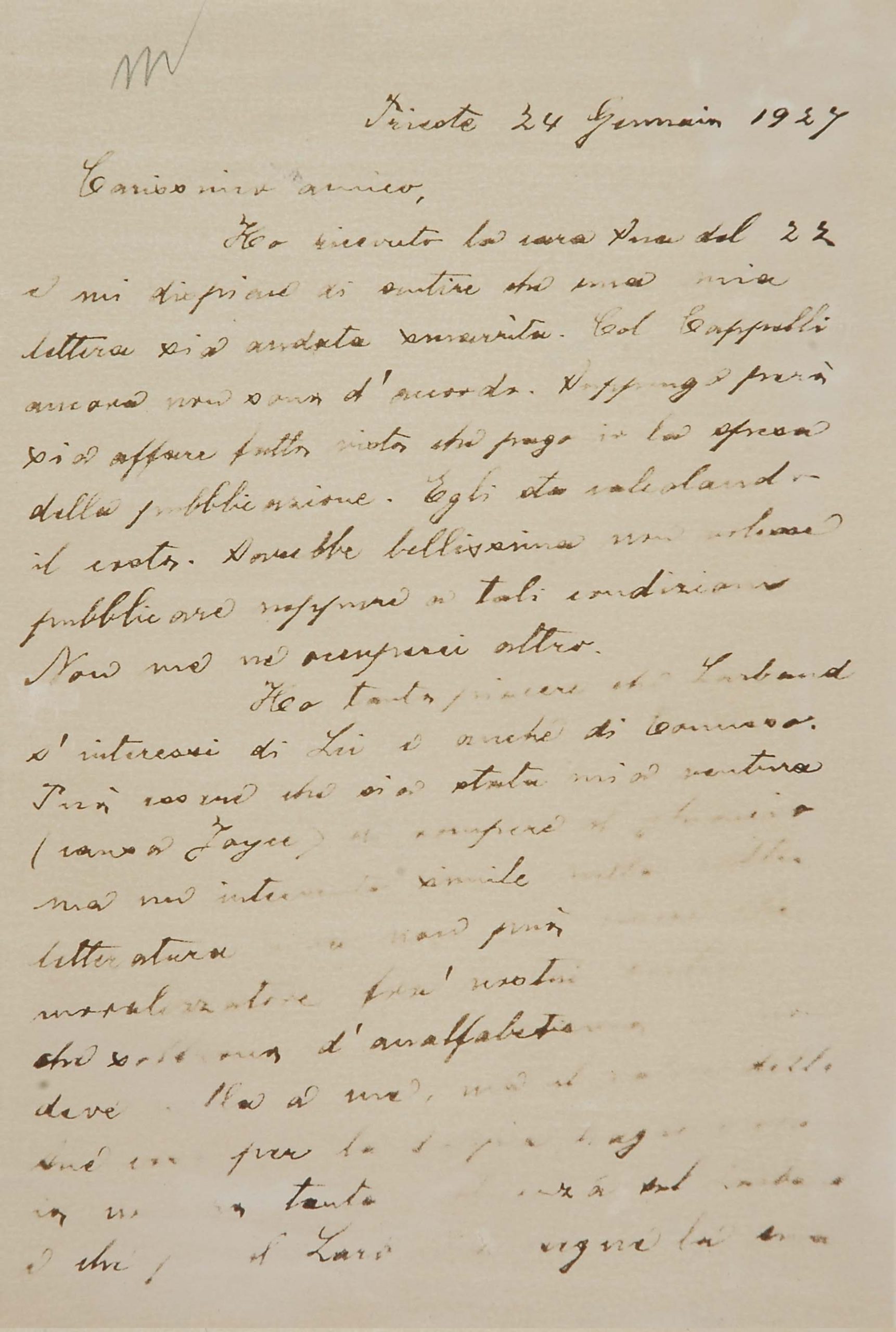 Il faldone con la segnatura archivistica Museo Sveviano FS Corr. A 76 contiene il carteggio tra Italo Svevo e Eugenio Montale, l’artefice nel novembre-dicembre del 1925 dell’Omaggio a Italo Svevo pubblicato nella rivista L’esame, la scintilla che, con due mesi di anticipo sulla critica francese, innesca il “caso Svevo” in Italia e in Europa.