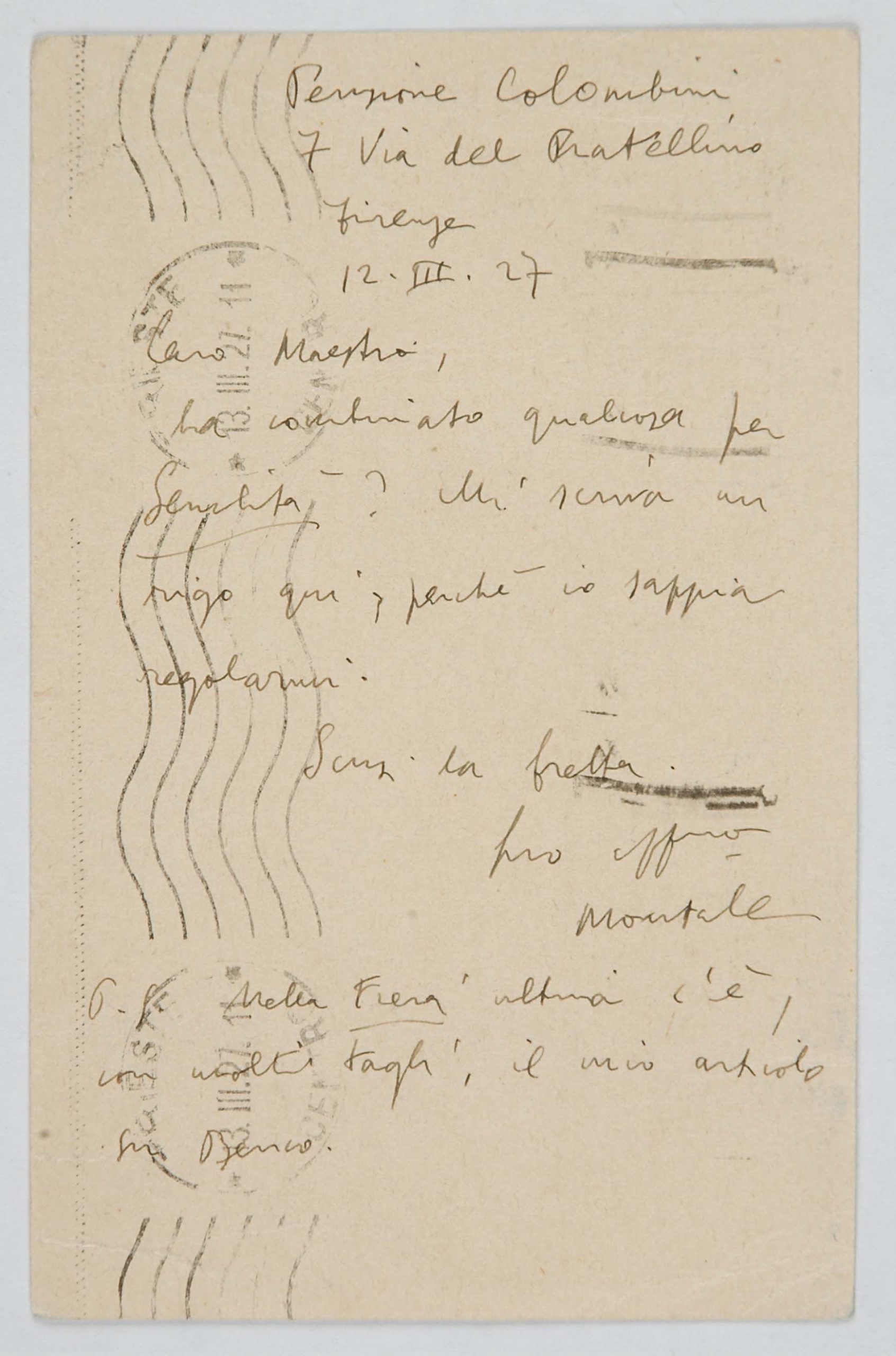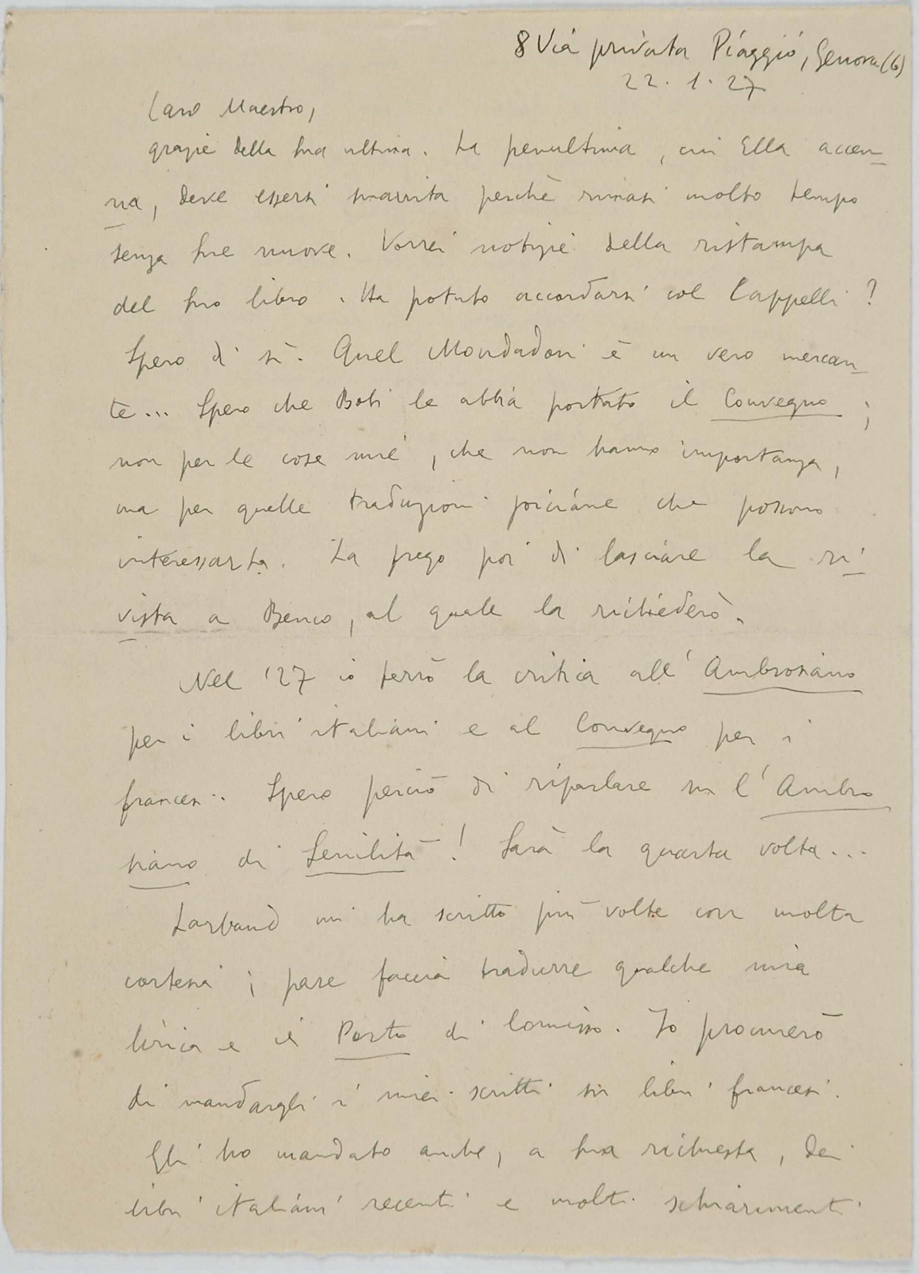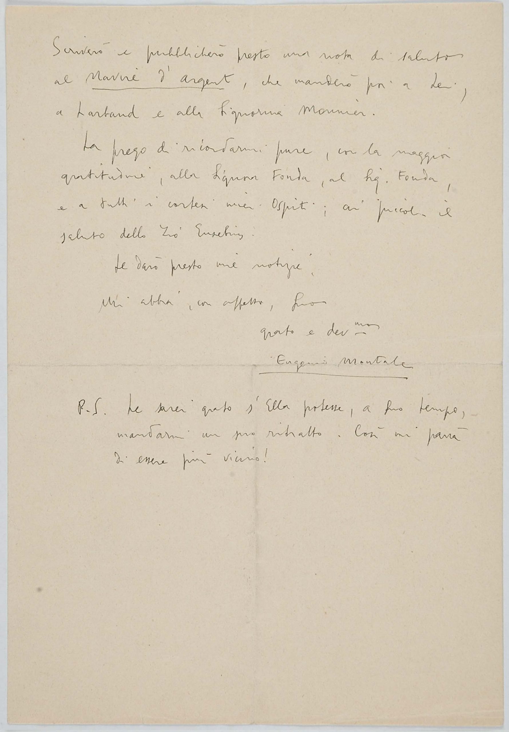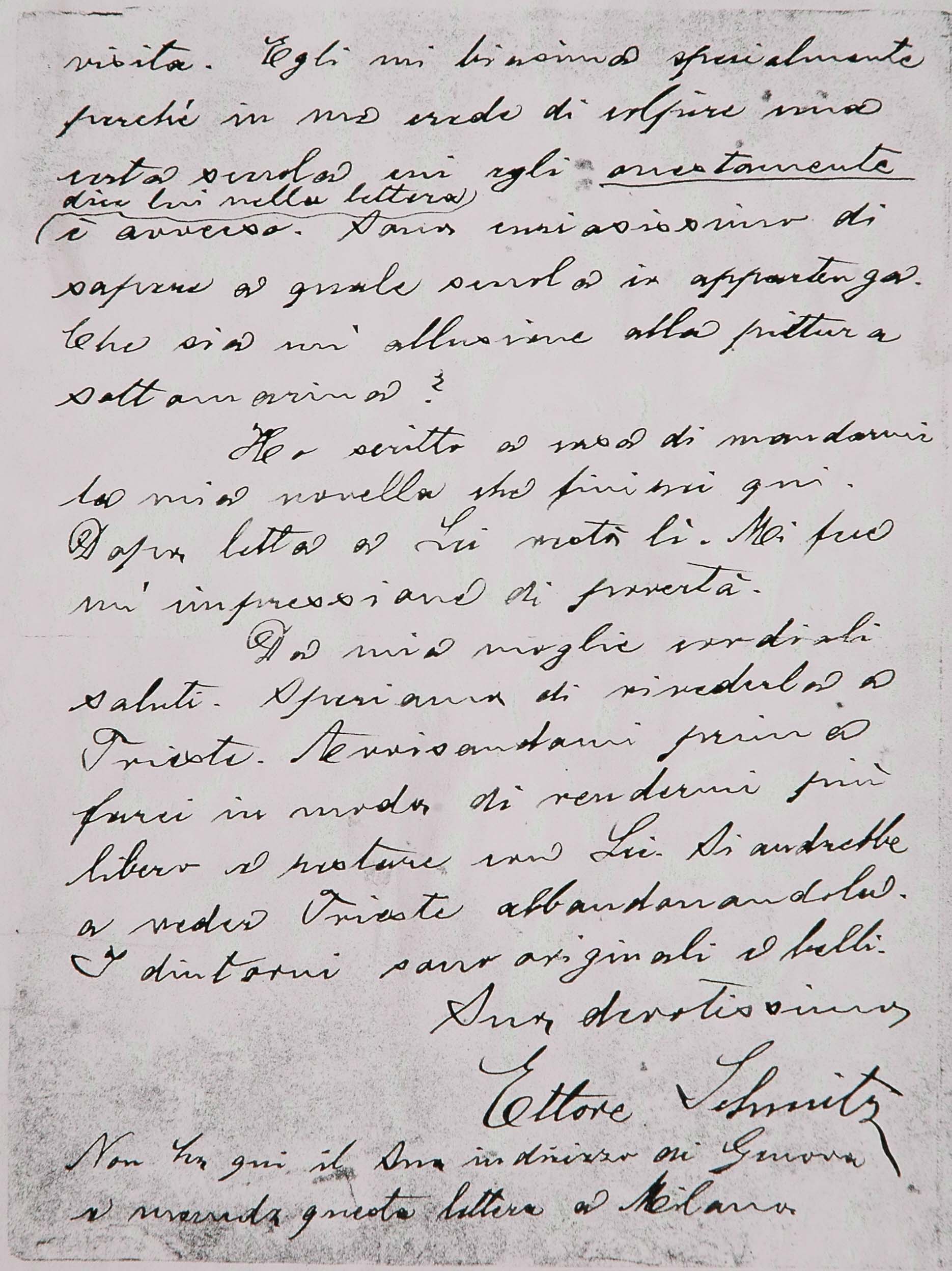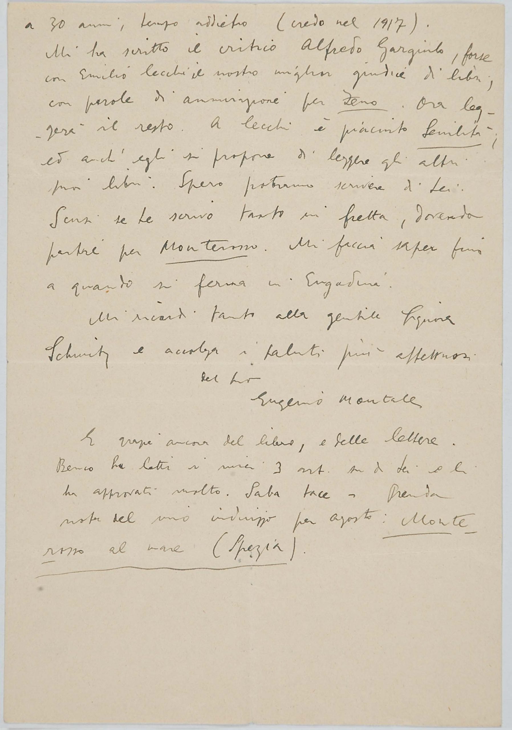 Il faldone con la segnatura archivistica Museo Sveviano FS Corr. A 76 contiene il carteggio tra Italo Svevo e Eugenio Montale, l’artefice nel novembre-dicembre del 1925 dell’Omaggio a Italo Svevo pubblicato nella rivista L’esame, la scintilla che, con due mesi di anticipo sulla critica francese, innesca il “caso Svevo” in Italia e in Europa.