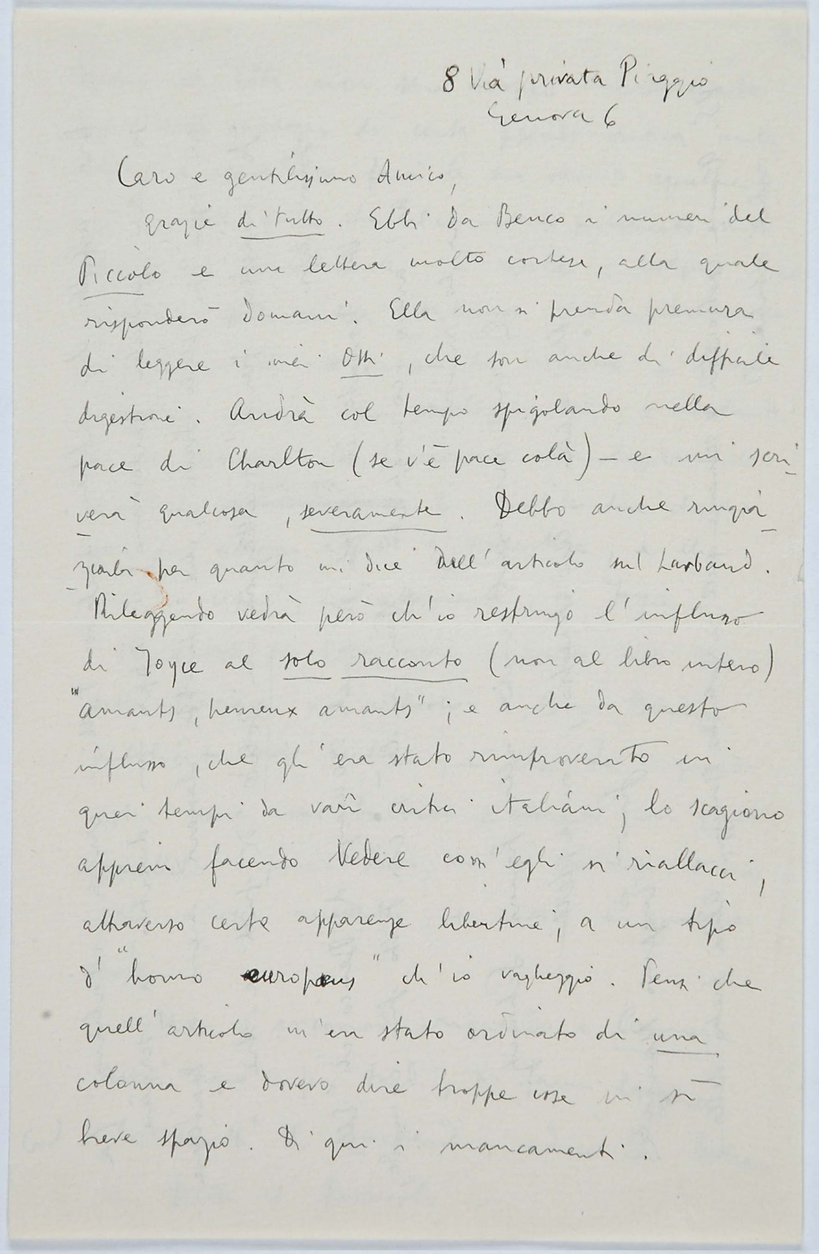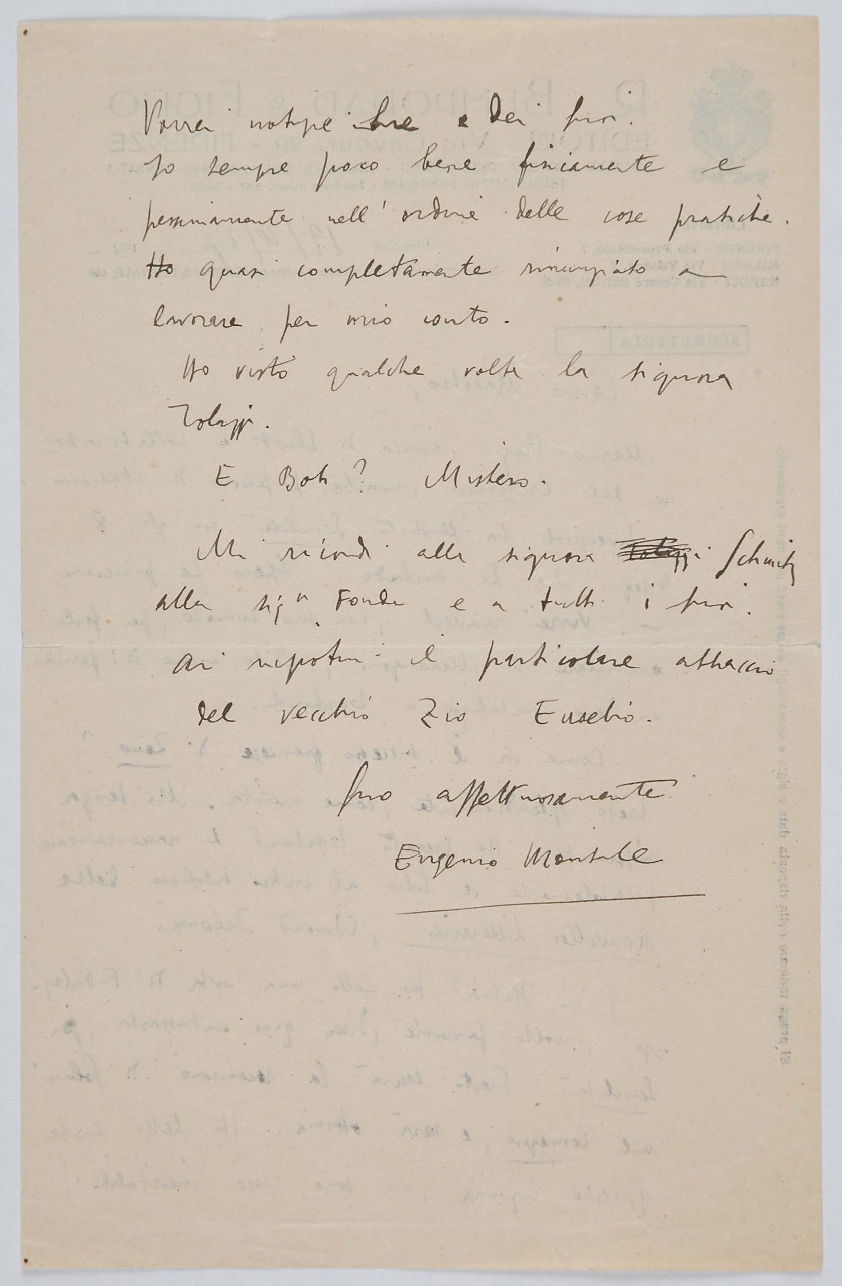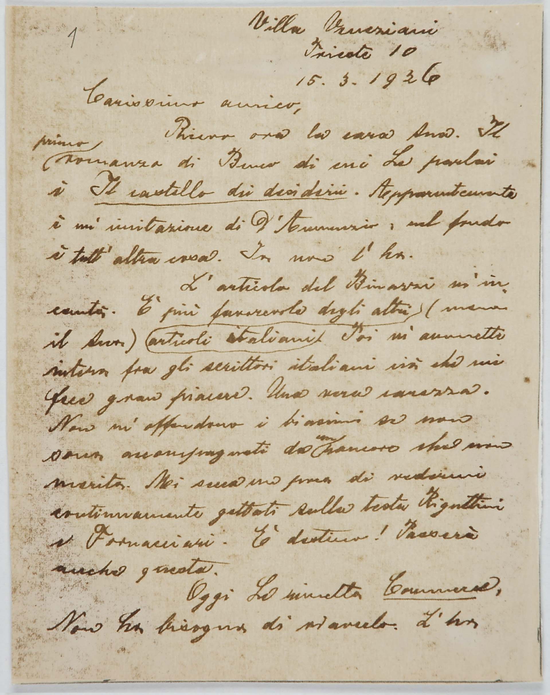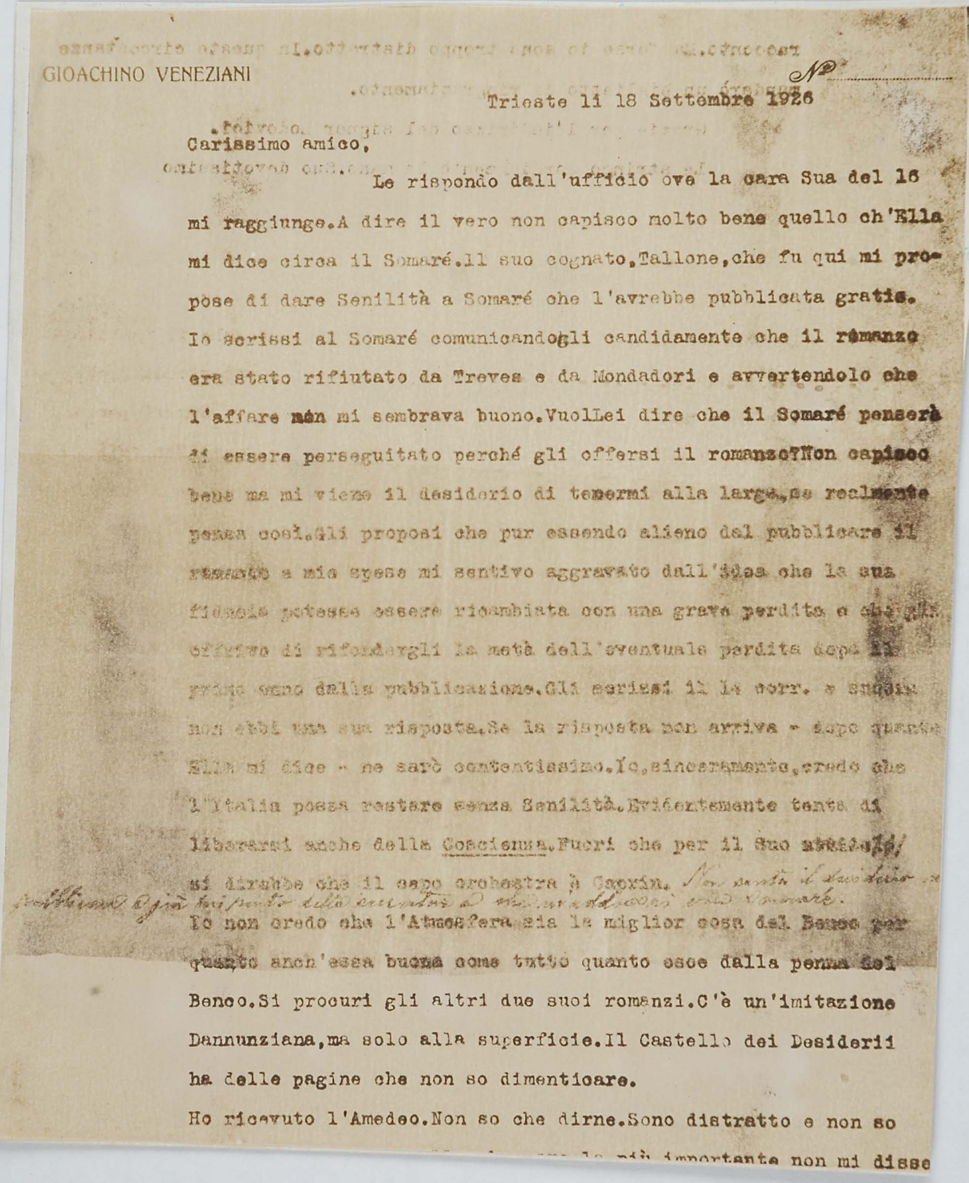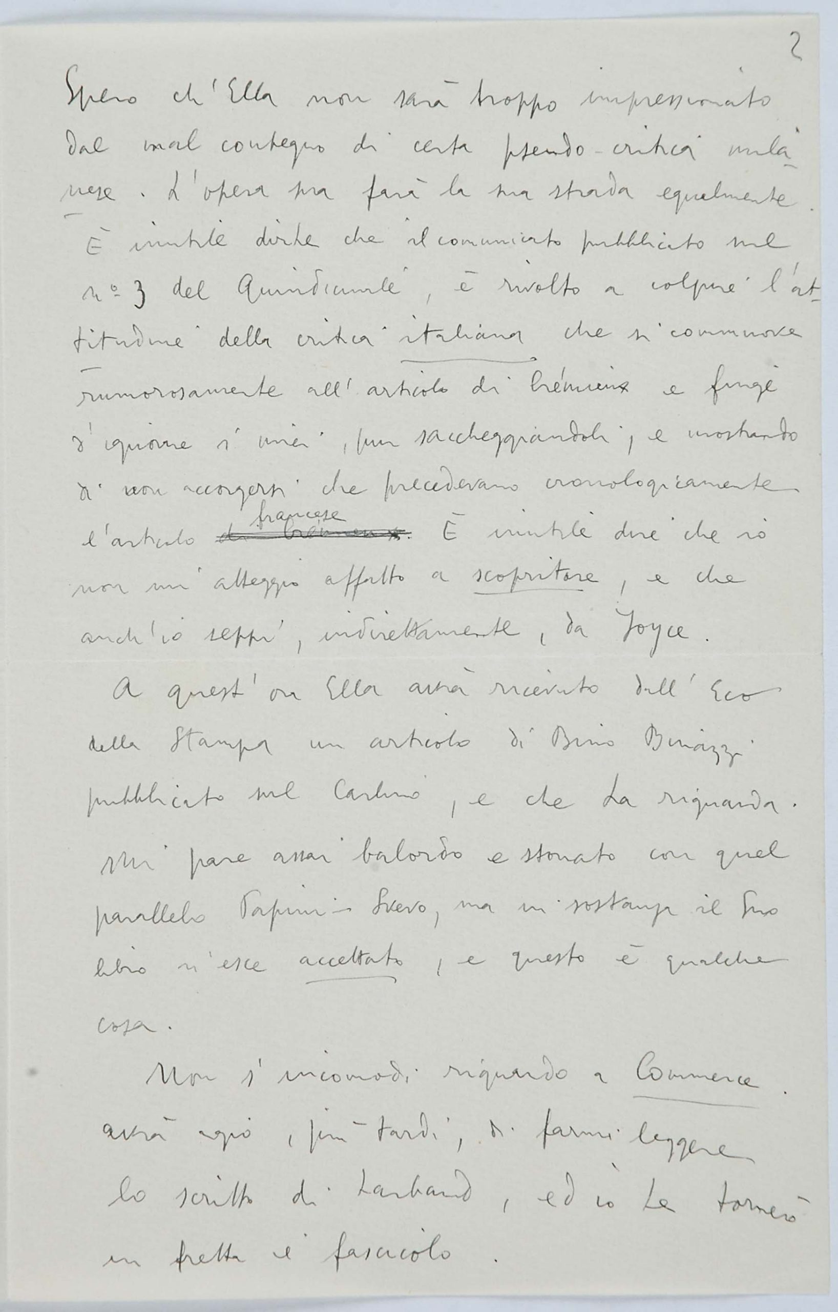 Il faldone con la segnatura archivistica Museo Sveviano FS Corr. A 76 contiene il carteggio tra Italo Svevo e Eugenio Montale, l’artefice nel novembre-dicembre del 1925 dell’Omaggio a Italo Svevo pubblicato nella rivista L’esame, la scintilla che, con due mesi di anticipo sulla critica francese, innesca il “caso Svevo” in Italia e in Europa.