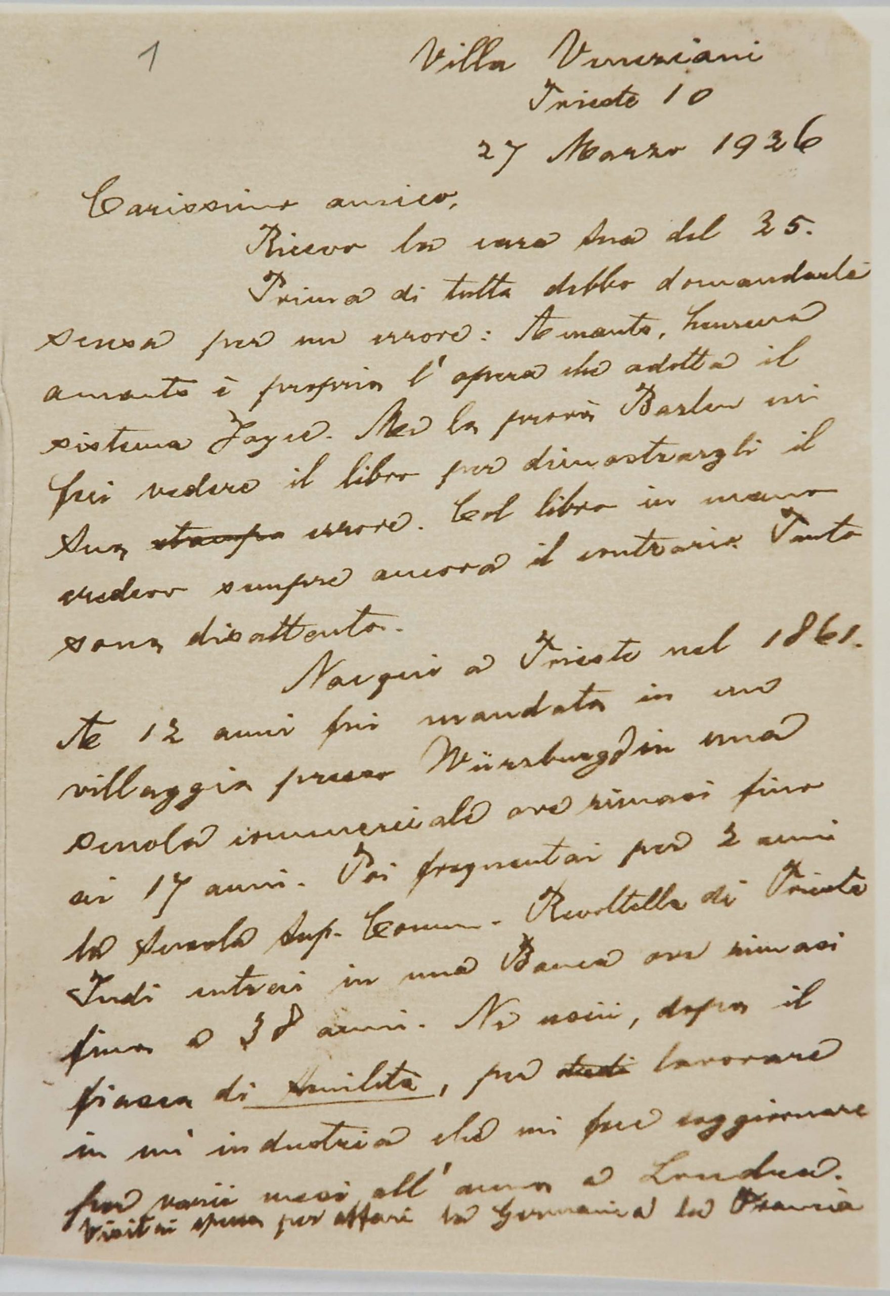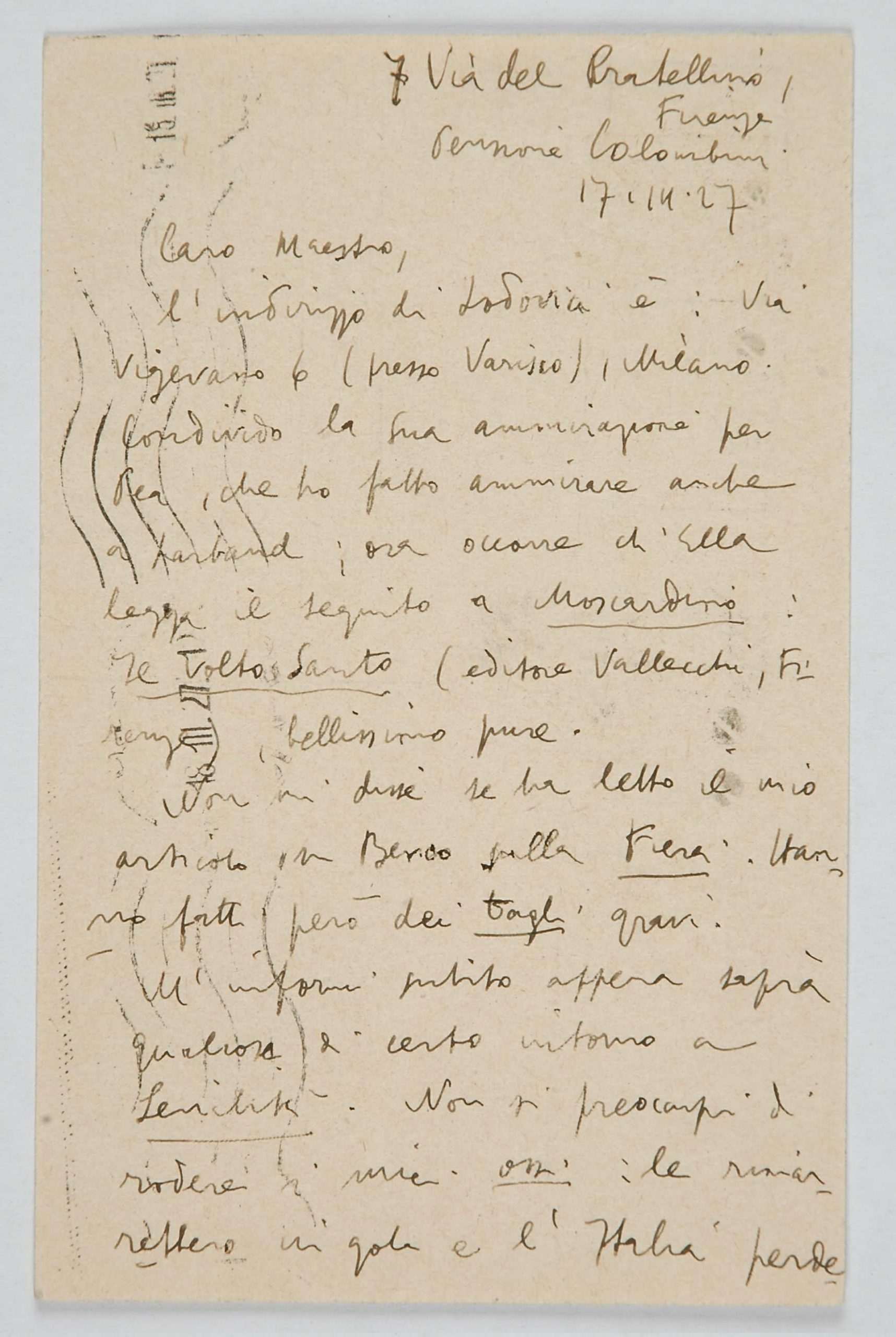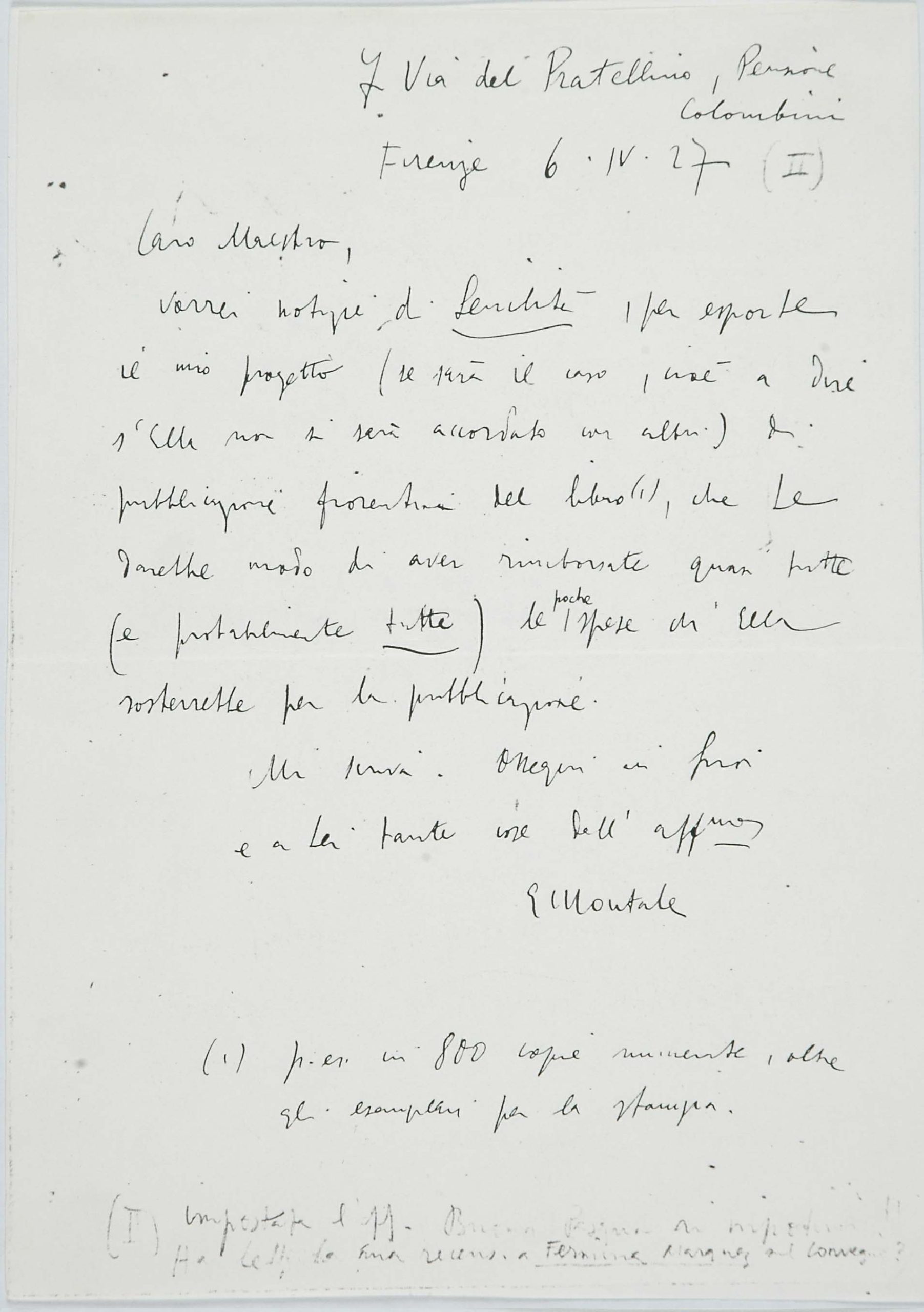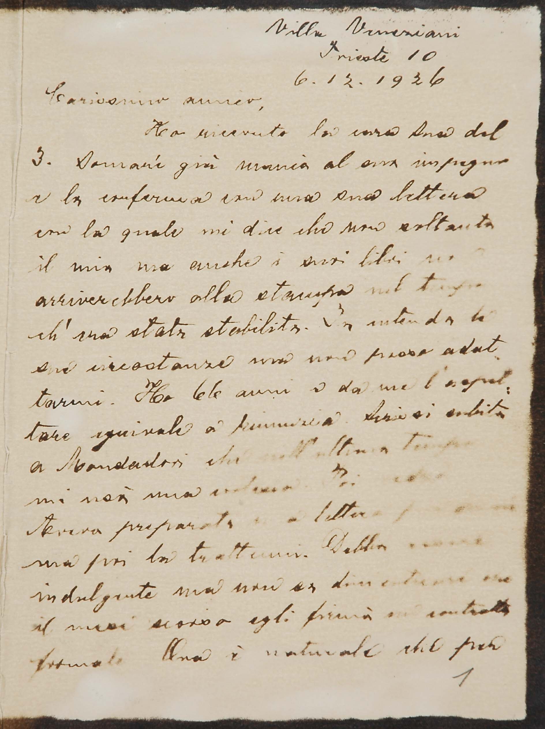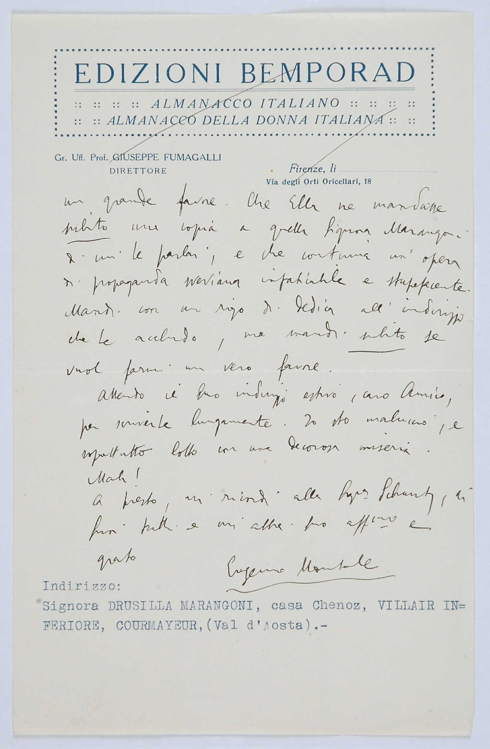Il faldone con la segnatura archivistica Museo Sveviano FS Corr. A 76 contiene il carteggio tra Italo Svevo e Eugenio Montale, l’artefice nel novembre-dicembre del 1925 dell’Omaggio a Italo Svevo pubblicato nella rivista L’esame, la scintilla che, con due mesi di anticipo sulla critica francese, innesca il “caso Svevo” in Italia e in Europa.