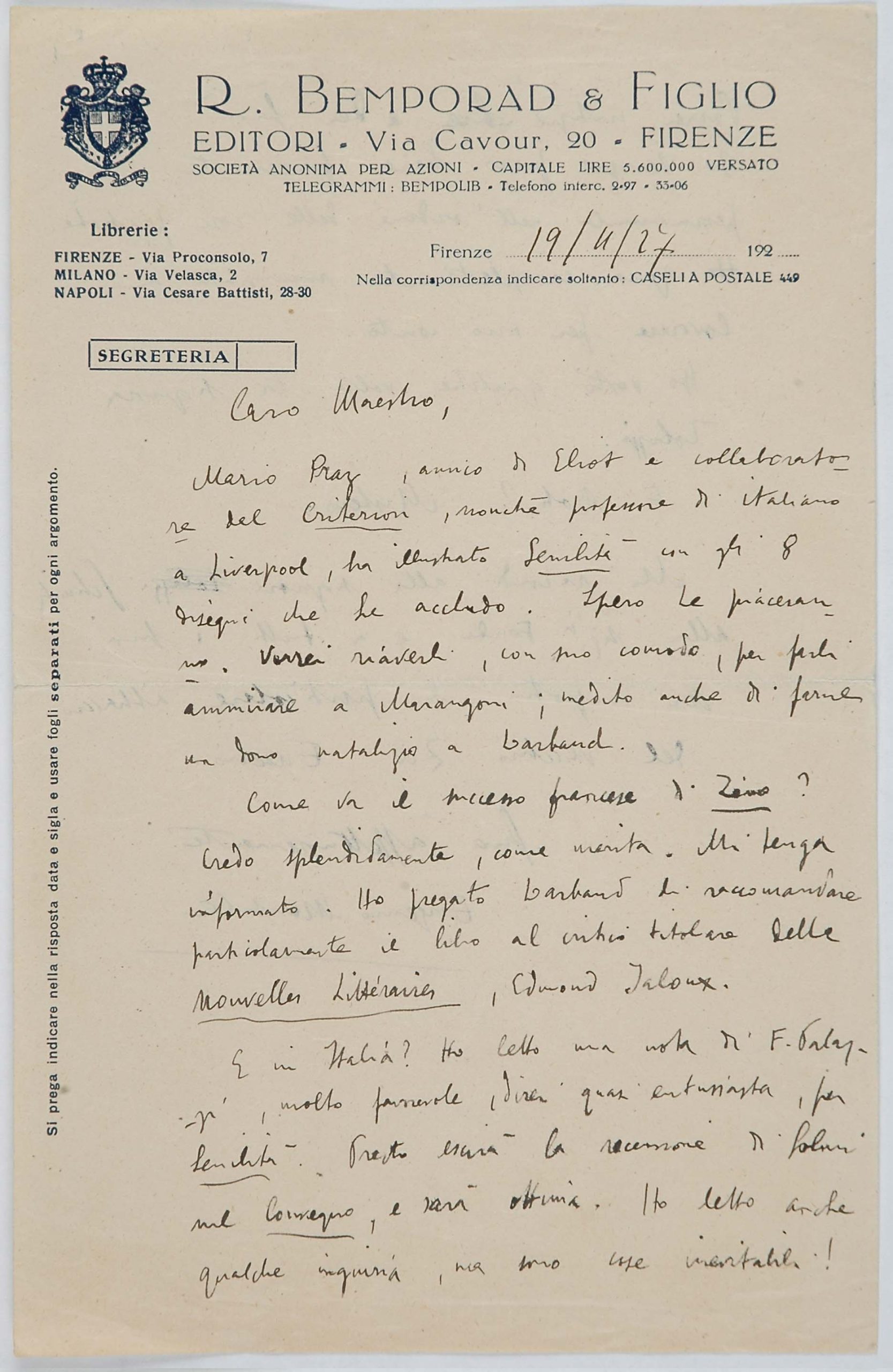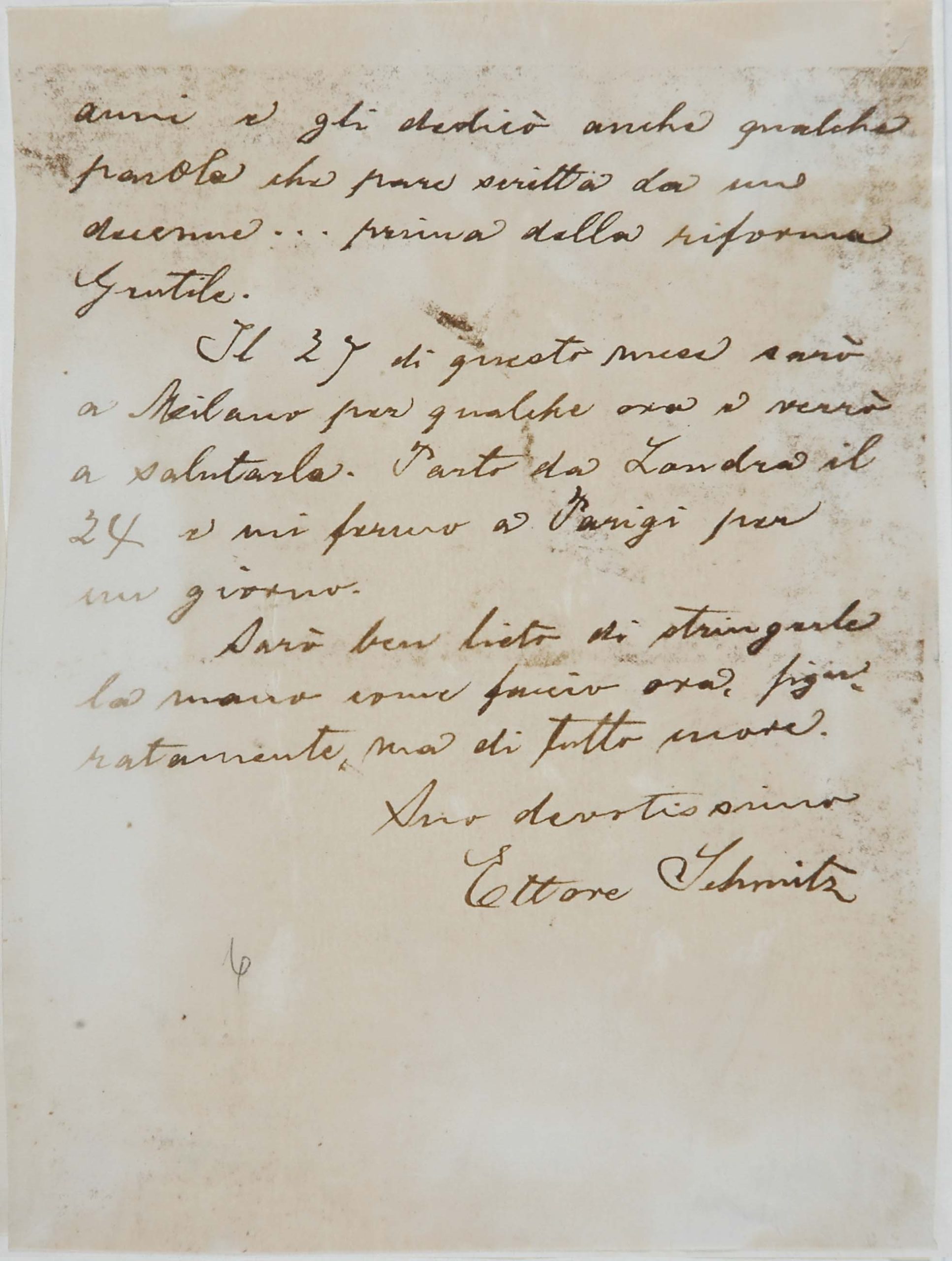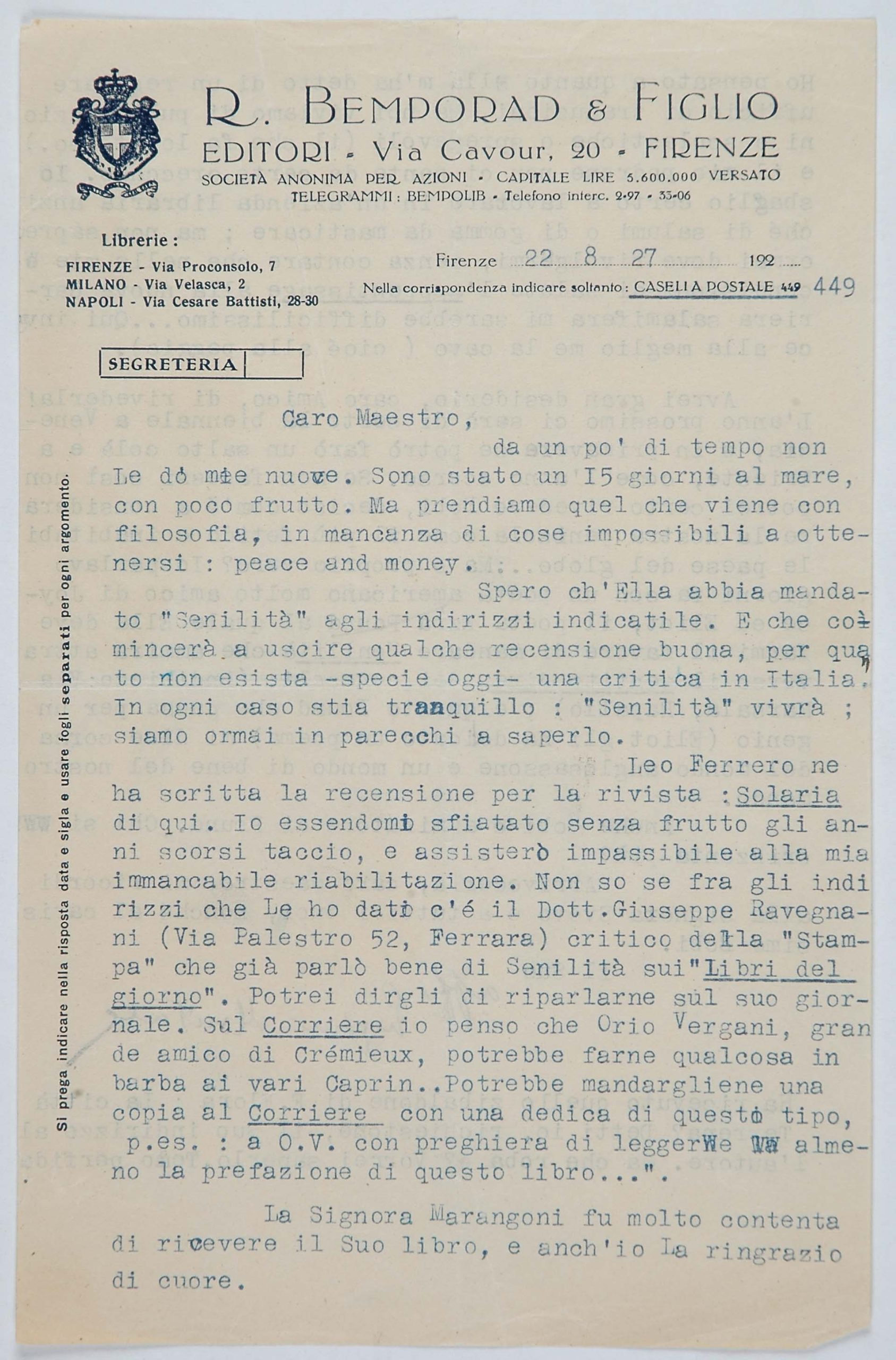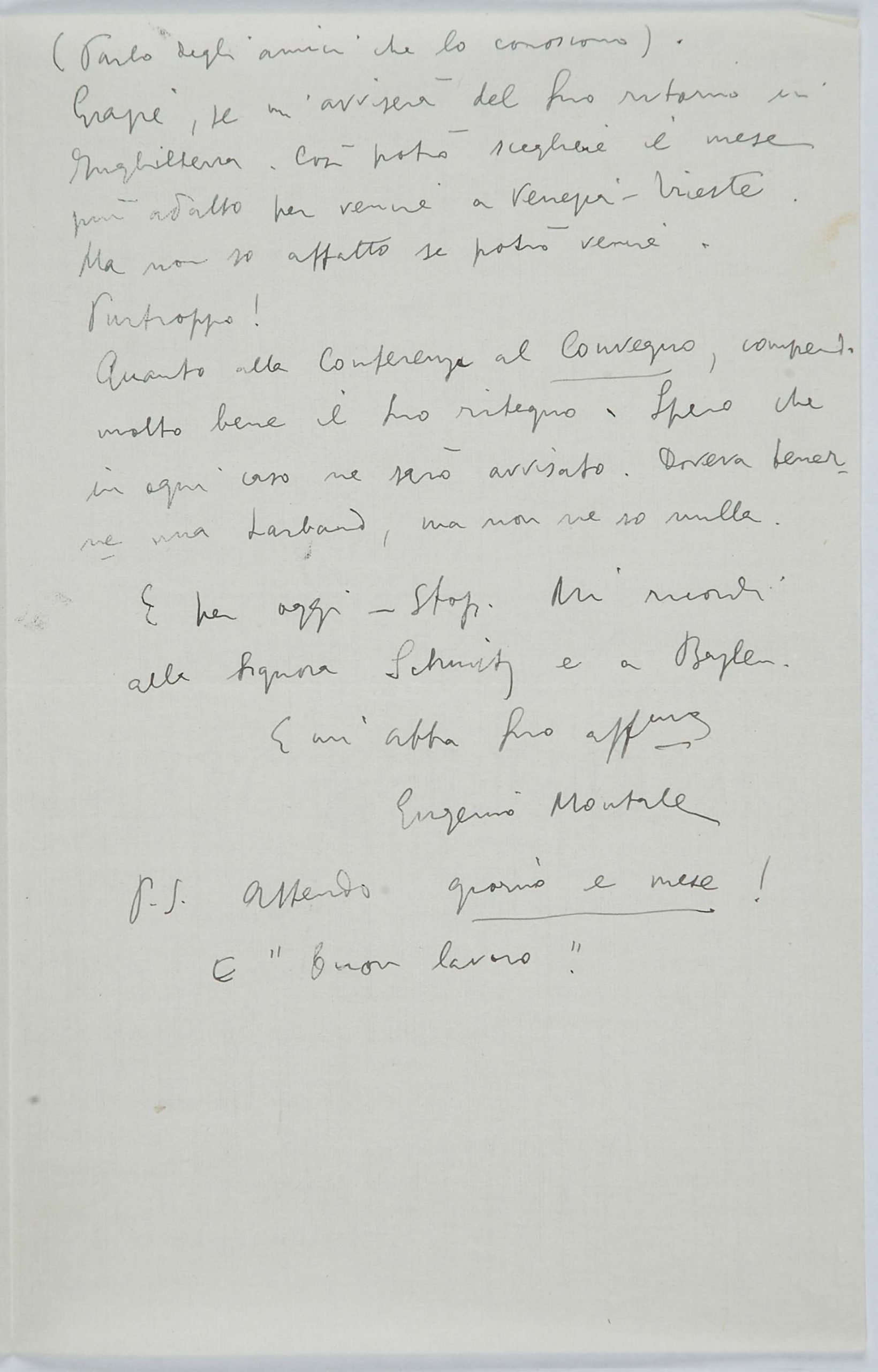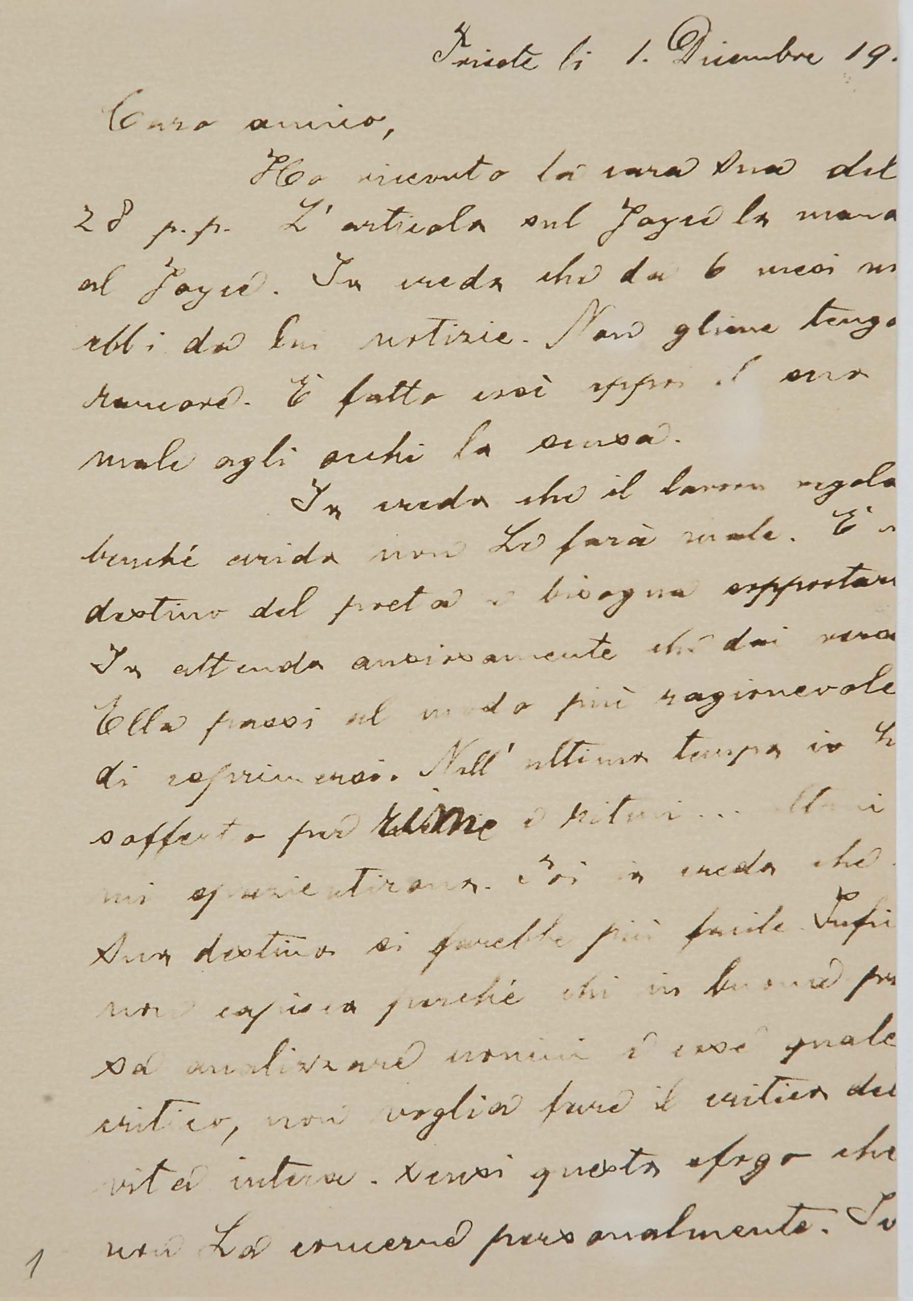 Il faldone con la segnatura archivistica Museo Sveviano FS Corr. A 76 contiene il carteggio tra Italo Svevo e Eugenio Montale, l’artefice nel novembre-dicembre del 1925 dell’Omaggio a Italo Svevo pubblicato nella rivista L’esame, la scintilla che, con due mesi di anticipo sulla critica francese, innesca il “caso Svevo” in Italia e in Europa.