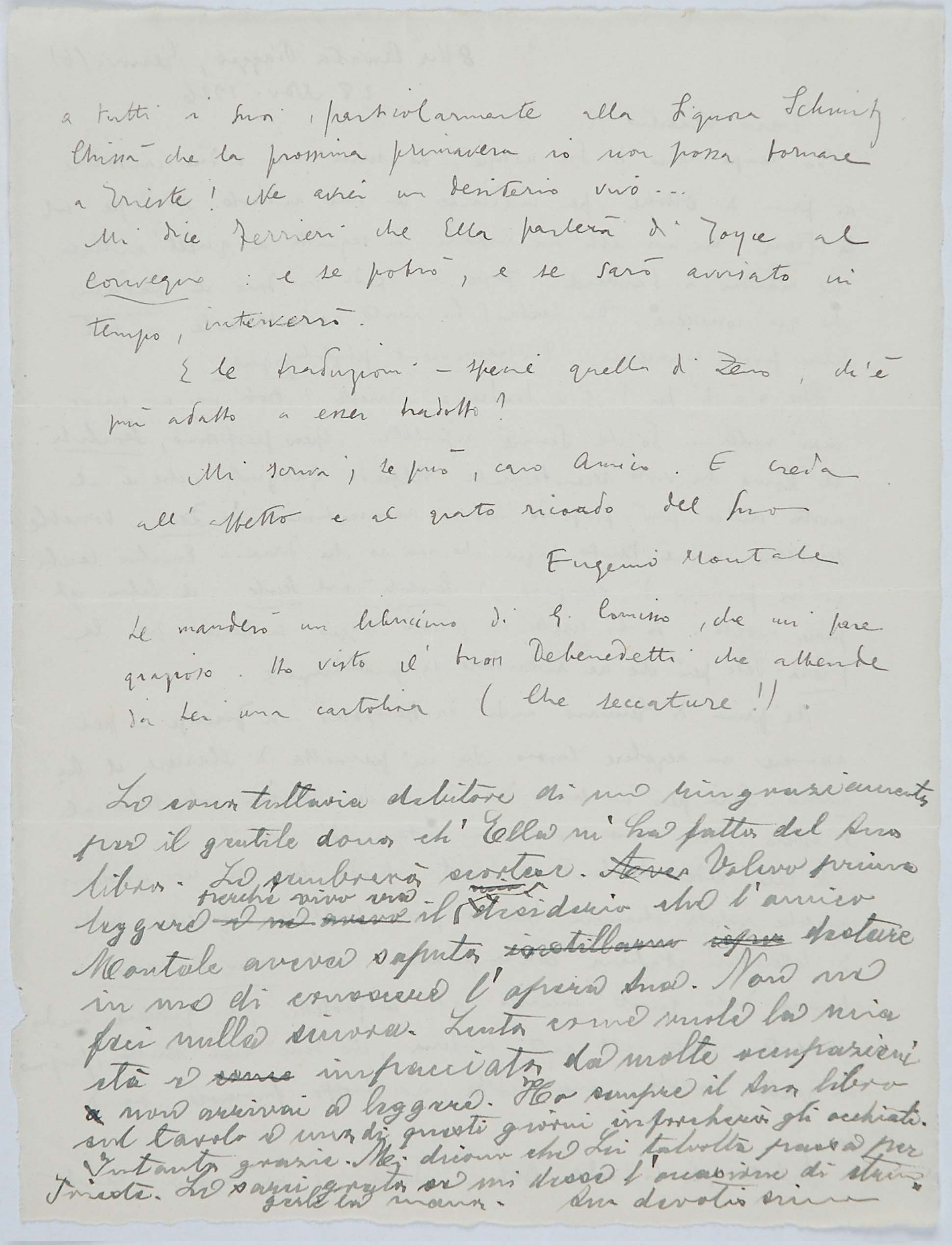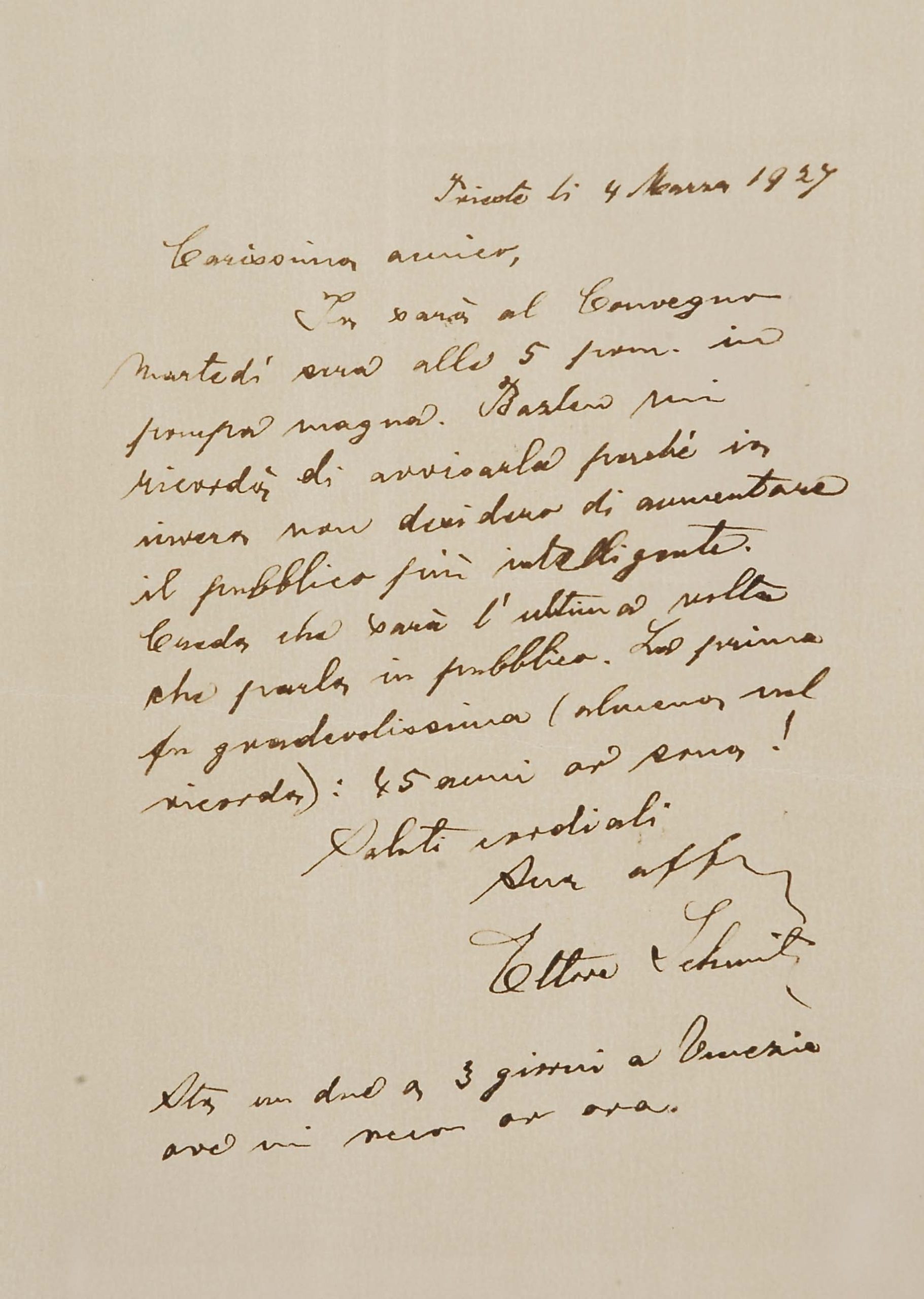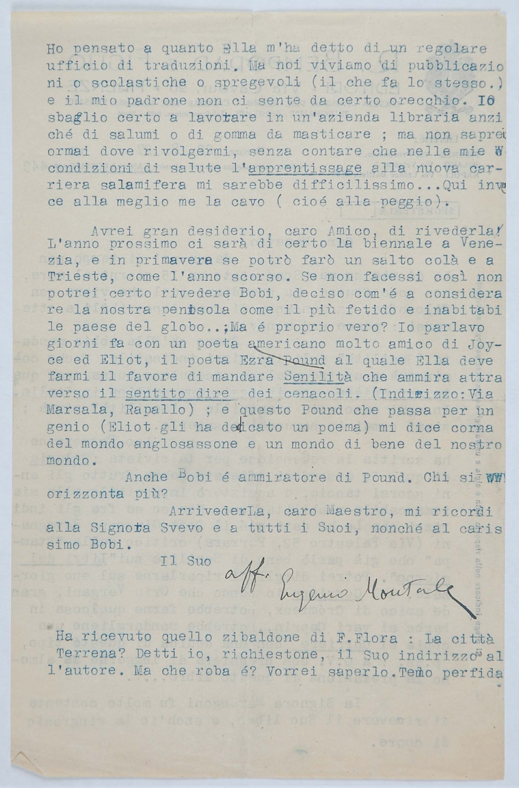 Legati da un sentore di trementina – come annota con sveviana ironia Montale ricordando che il padre, importatore di resine e d’acquaragia, era stato uno dei fornitori della Ditta Veneziani di cui Svevo era all’epoca vicepresidente – Svevo e Montale nelle loro lettere raccontano al lettore la rete di relazioni intellettuali generata ancora una volta dalla stima e dall’amicizia di James Joyce per Svevo. È sempre lo scrittore irlandese il perno del network parigino-milanese-genovese-triestino che fa schiudere la cerchia ristretta dei contatti epistolari dello scrittore e la espande agli intellettuali italiani che decreteranno il successo di Svevo in Italia