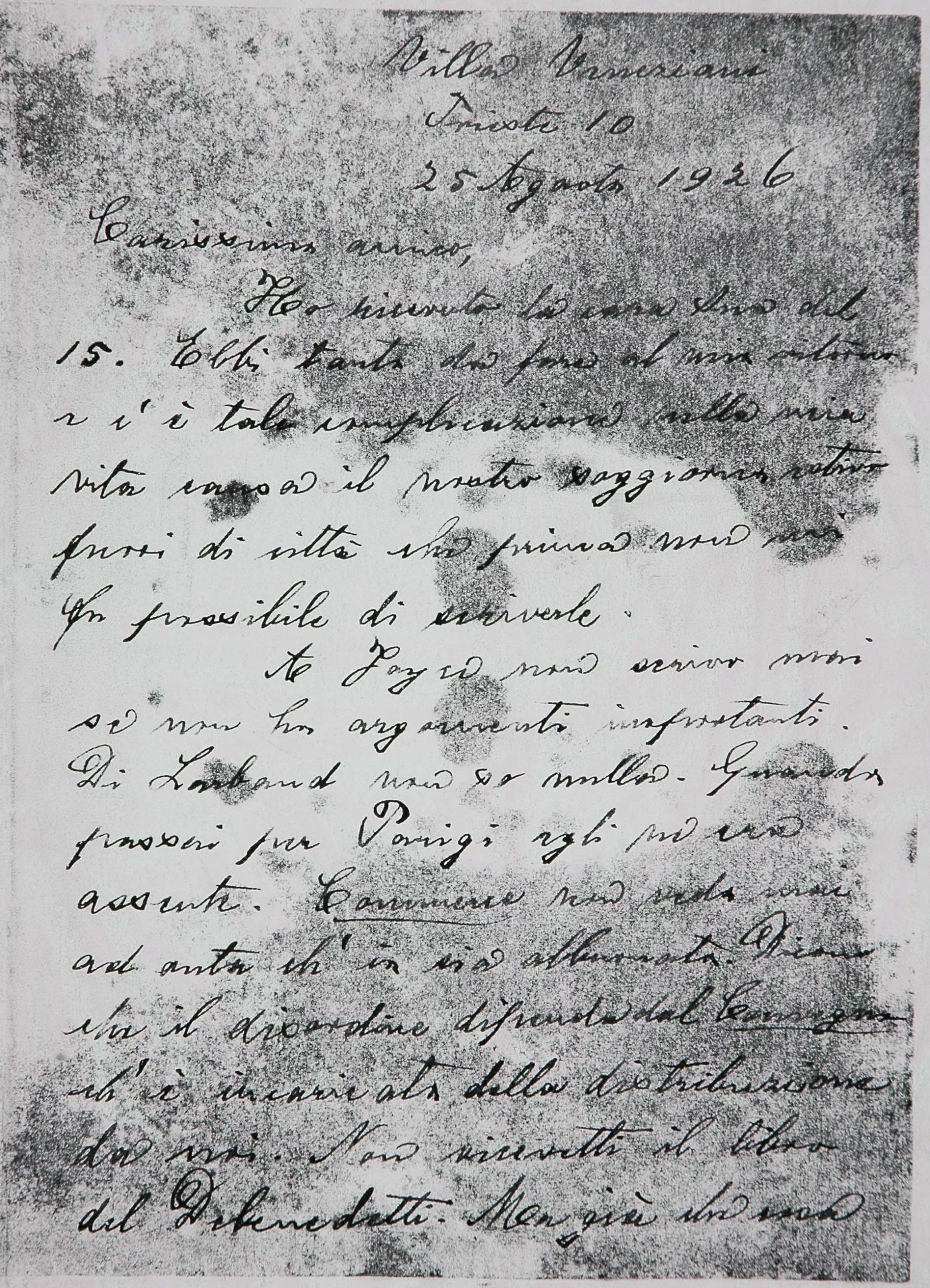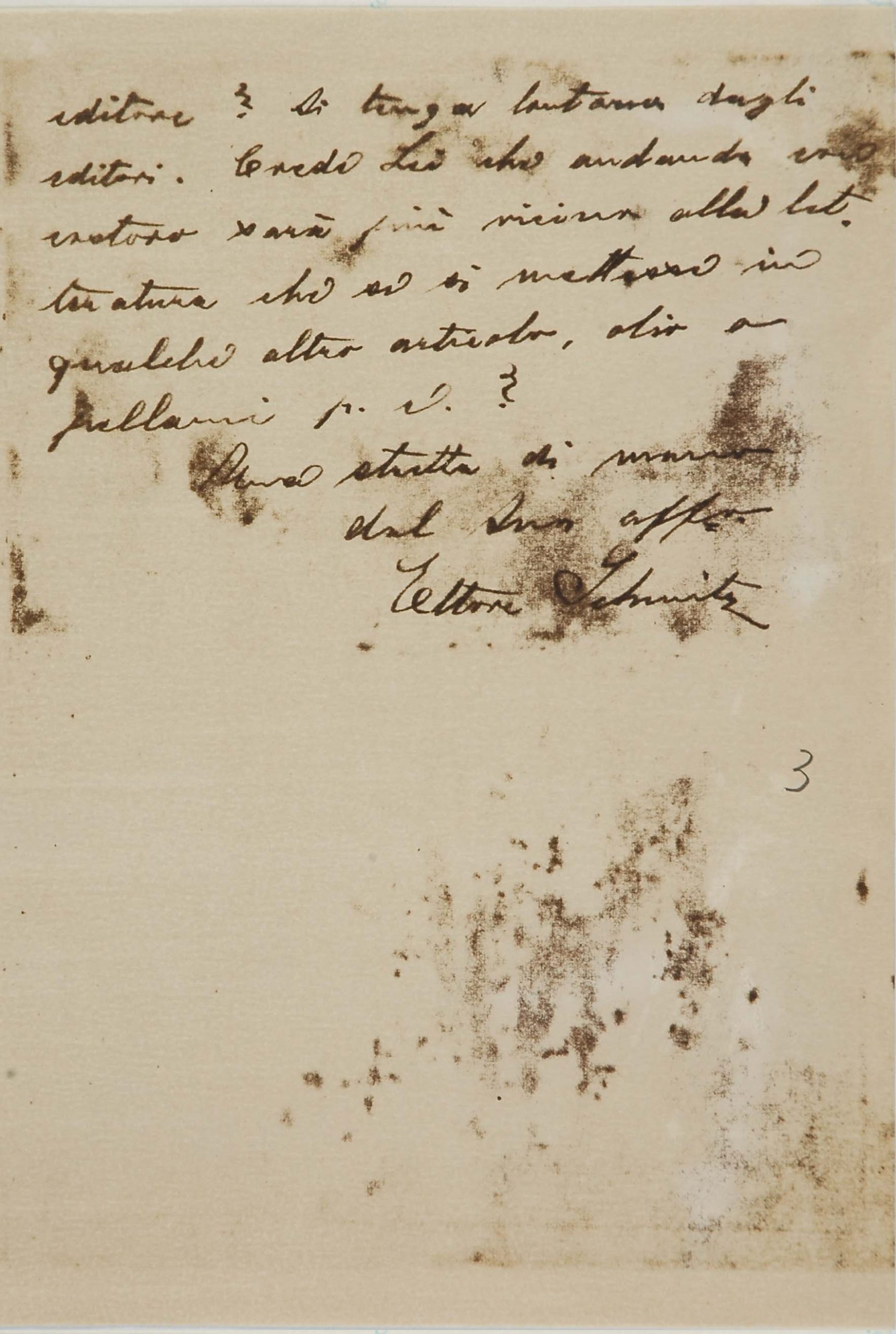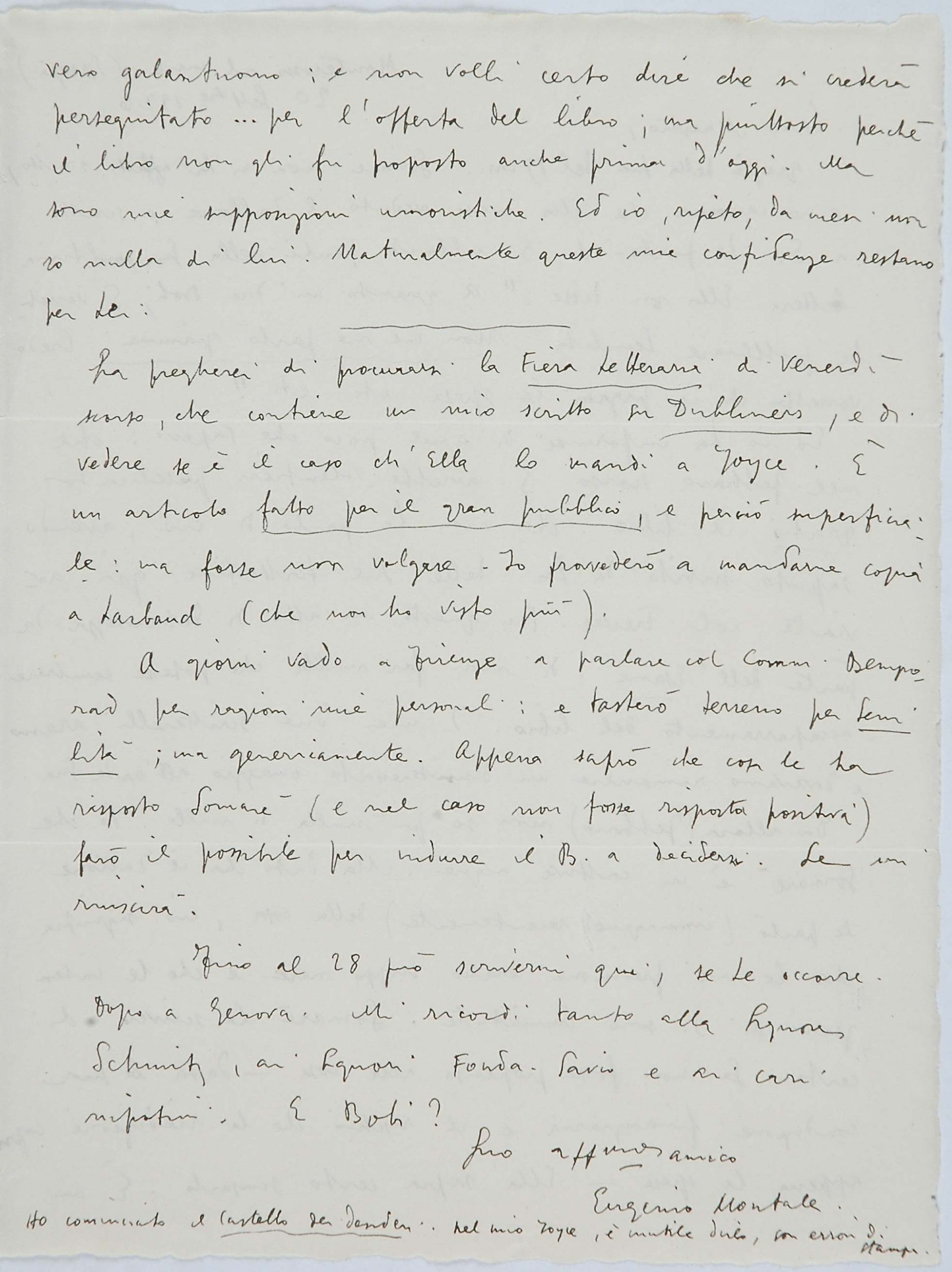 Legati da un sentore di trementina – come annota con sveviana ironia Montale ricordando che il padre, importatore di resine e d’acquaragia, era stato uno dei fornitori della Ditta Veneziani di cui Svevo era all’epoca vicepresidente – Svevo e Montale nelle loro lettere raccontano al lettore la rete di relazioni intellettuali generata ancora una volta dalla stima e dall’amicizia di James Joyce per Svevo. È sempre lo scrittore irlandese il perno del network parigino-milanese-genovese-triestino che fa schiudere la cerchia ristretta dei contatti epistolari dello scrittore e la espande agli intellettuali italiani che decreteranno il successo di Svevo in Italia