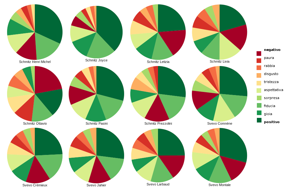 Affinando l’analisi del Sentiment, Gabriele Sarti ha convertito i punteggi estrapolati dal software in percentuali dividendo poi ciascun punteggio del sentimento rilevato lettera per lettera per il punteggio totale di sentimento di ciascuna missiva, al fine di evitare squilibri nei punteggi tra lettere lunghe e brevi. Dal set di dati con punteggi percentuali di Sentiment sono stati generati i grafi a torta che mostrano quale sia l’umore prevalente dei carteggi intrattenuti da Italo Svevo con i suoi principali interlocutori. Salta agli occhi come, in generale, la conversazione tramite lettera sia più affabile e lieta con i colleghi letterati, ad esempi con James Joyce, mentre sentimenti come tristezza, ansia e paura compaiano più spesso nelle lettere ai familiari, in particolare quelle scritte alla moglie Livia e al fratello maggiore Ottavio.