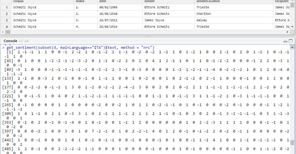 L’approccio a un archivio d’autore ha orientato la scelta di Syuzhet Package – una delle librerie disponibili in ambiente “R” – tarata specificatamente dal suo creatore Matthew Jockers per l’analisi di testi e plot narrativi tramite la rilevazione di picchi emotivi nella scrittura. Syuzhet Package comprende il lessico NRC National Research Council Canada Word-Emotion Association Lexicon (EmoLex), oltre 14.000 lemmi associati a otto emozioni-base (rabbia, paura, aspettativa, fiducia, sorpresa, tristezza, gioia, disgusto) pertinenti la polarità sentiment positivo/negativo. Da luglio 2015 EmoLex è stato implementato con un lessico plurilingue che consiste nella traduzione del vocabolario inglese in una ventina di idiomi tramite algoritmo Google Translate.
