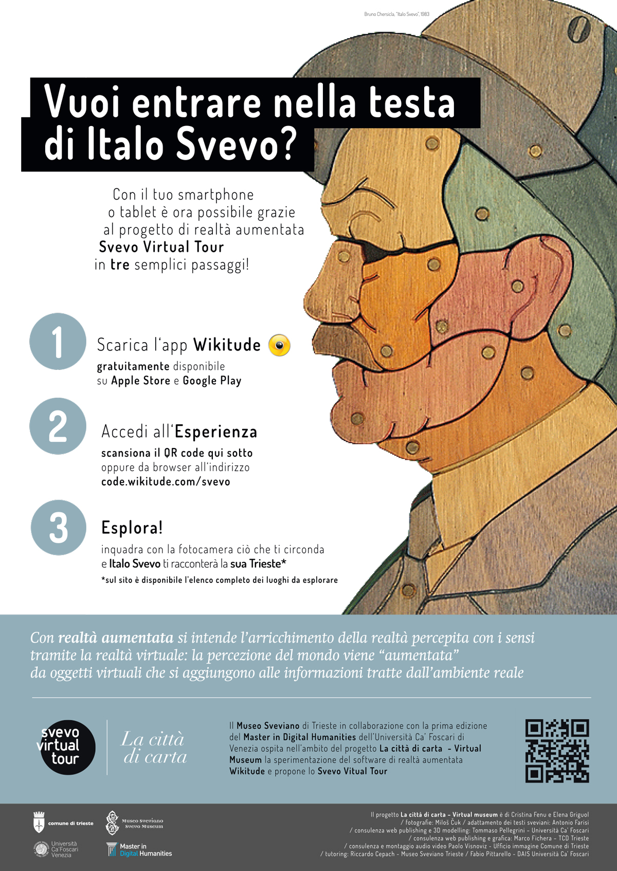 Il Museo Sveviano di Trieste in collaborazione con la prima edizione del Master in Digital Humanities dell’Università Ca’ Foscari di Venezia nell’ambito del progetto “La città di carta – Virtual museum” presenta Svevo Virtual Tour con la sperimentazione del software di realtà aumentata Wikitude.